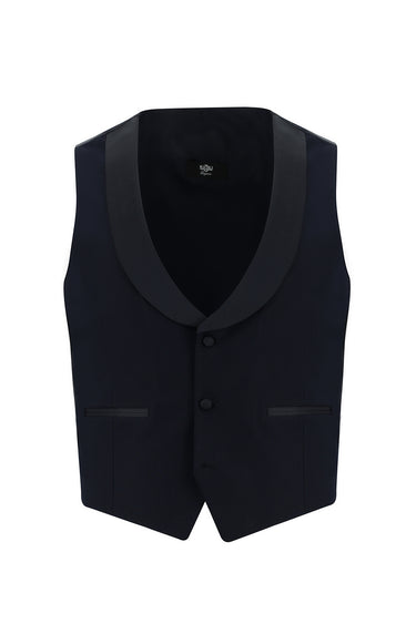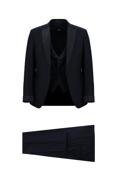 Koyu Lacivert Slim Fit Dar Kesim Sivri Yaka Yelekli Smokin & Damatlık