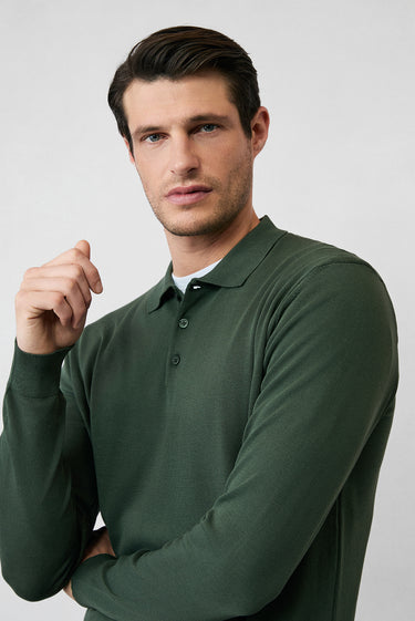 Medium Khaki Regular Fit Button-Down Polo Collar Knit Sweater