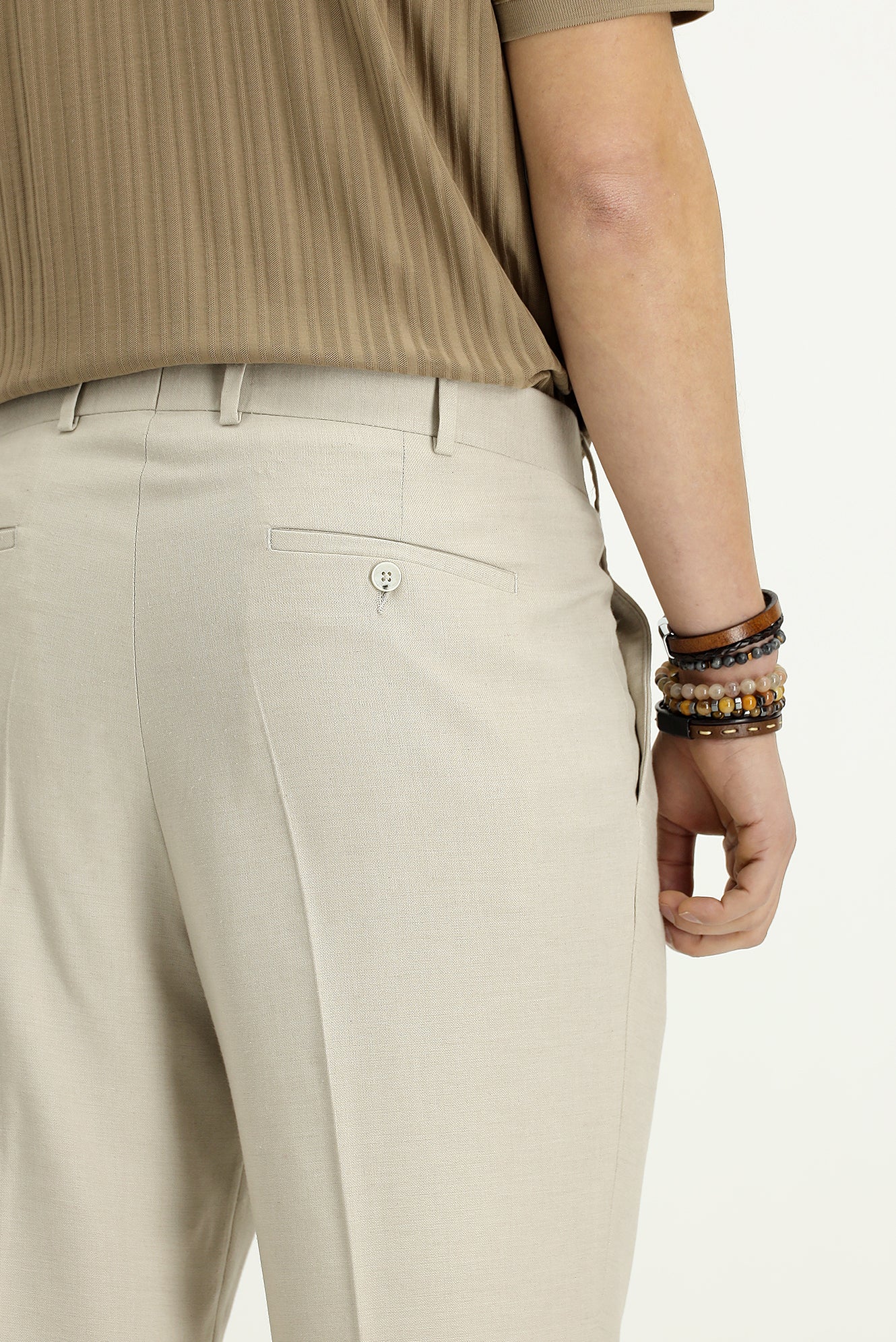Açık Bej Regular Fit Keten Karışımlı Pileli Klasik Kumaş Pantolon