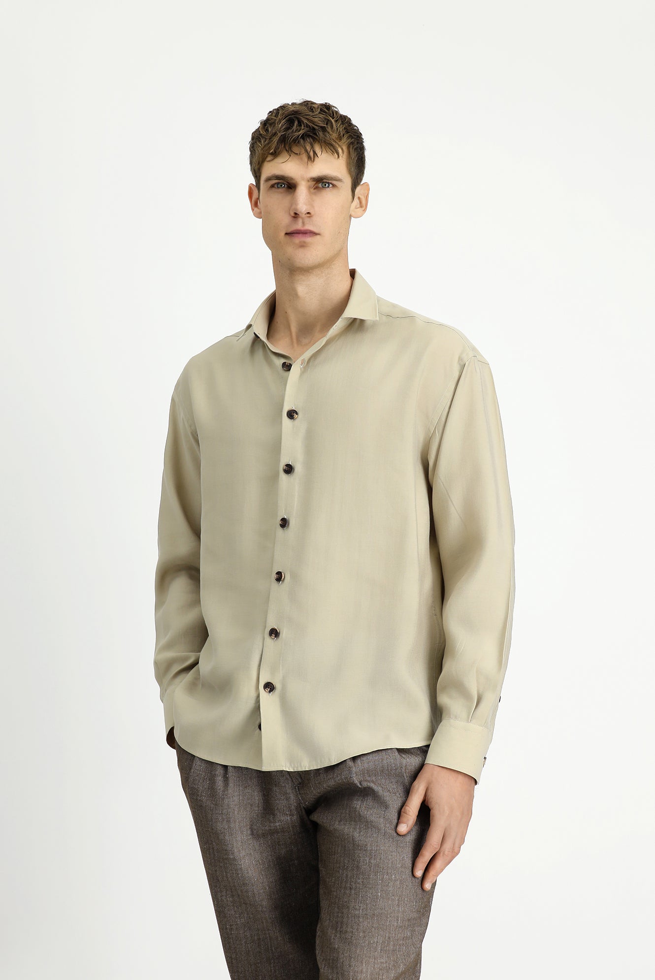 Açık Bej Uzun Kol Oversize Lyocell Karışımlı Gömlek