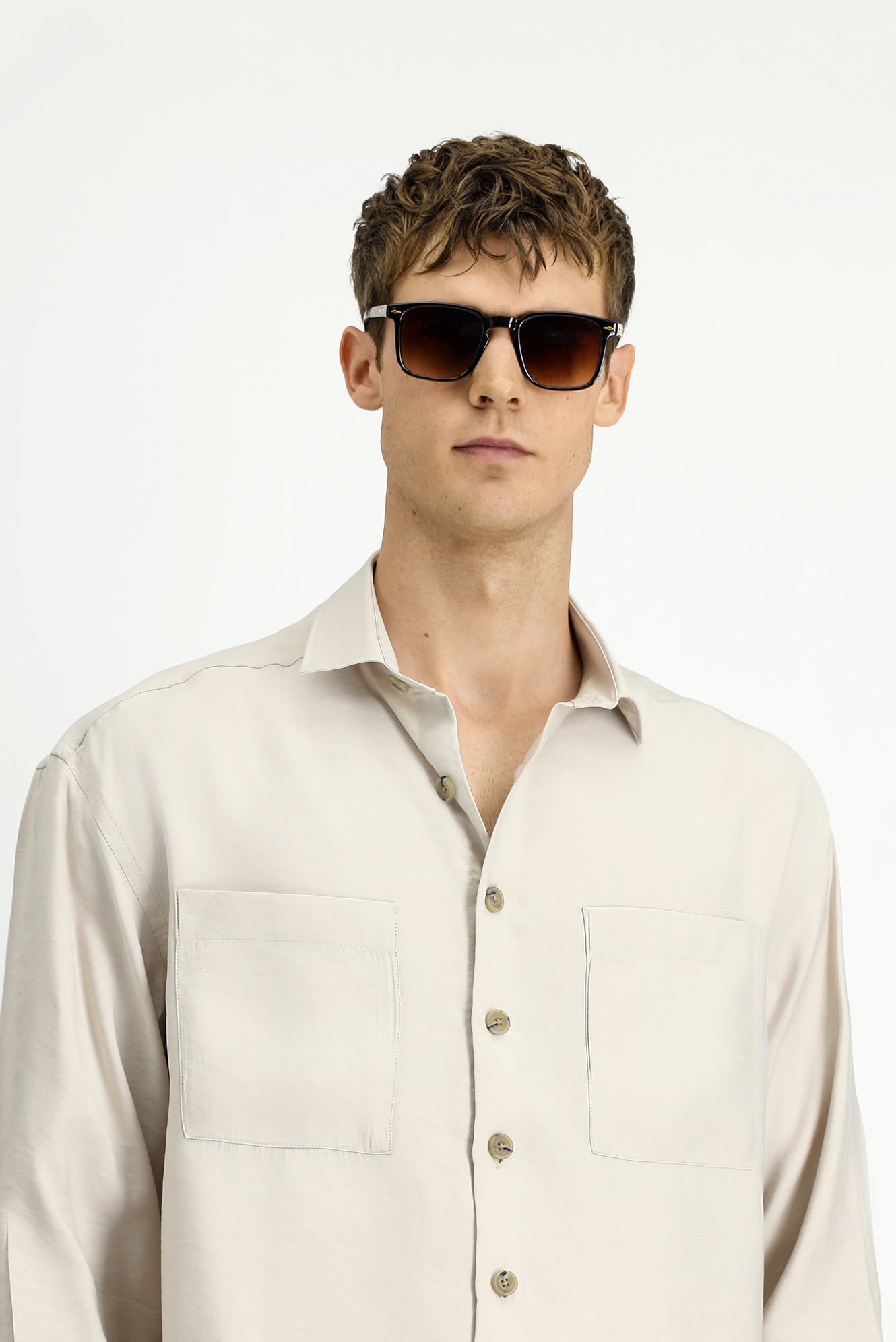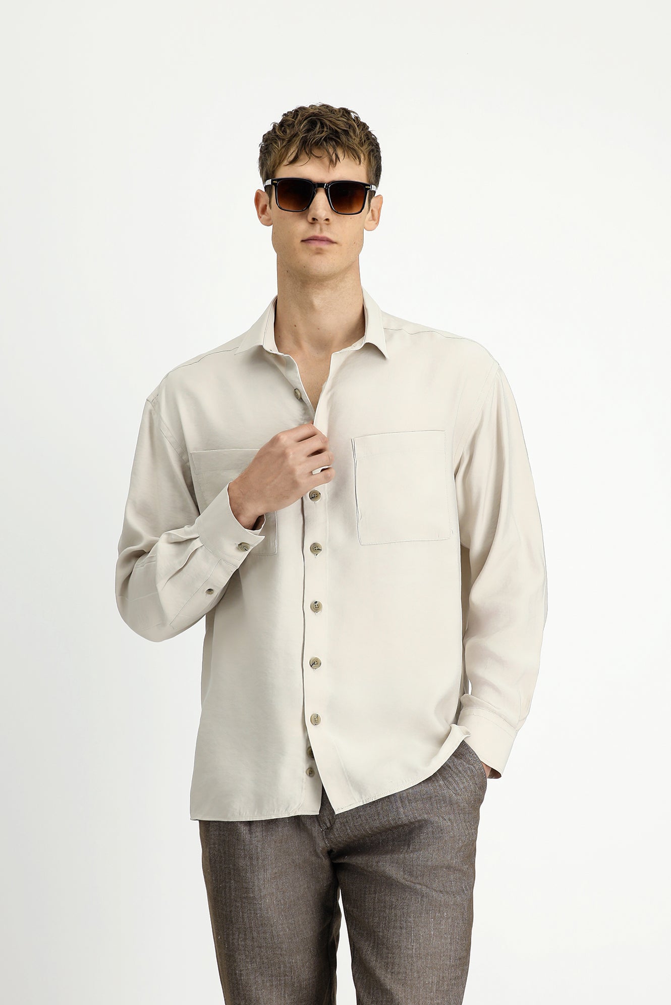 Açık Bej Uzun Kol Oversize Modal Karışımlı Gömlek