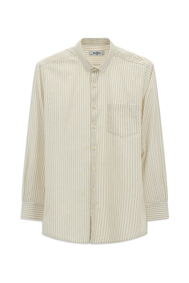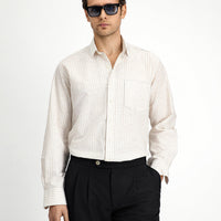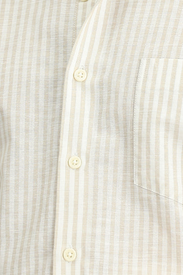 Açık Bej Uzun Kol Regular Fit Pamuklu Keten Karışımlı Çizgili Gömlek