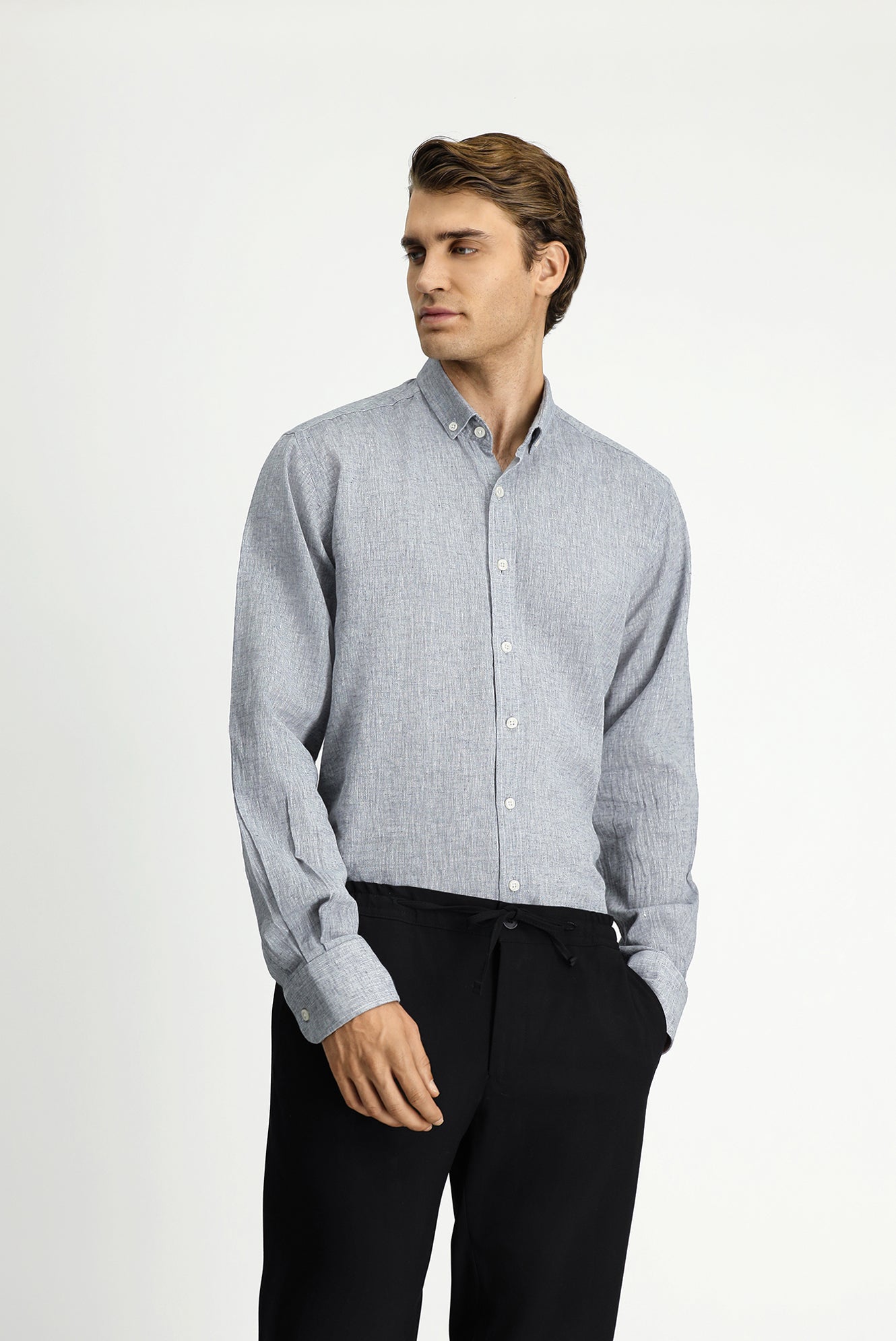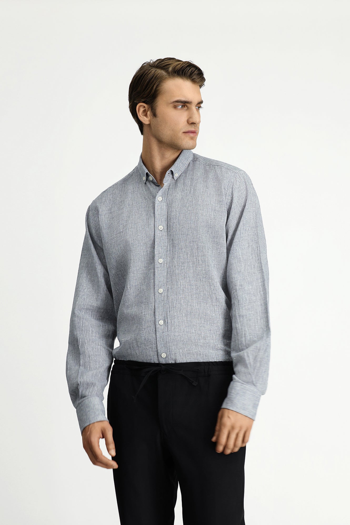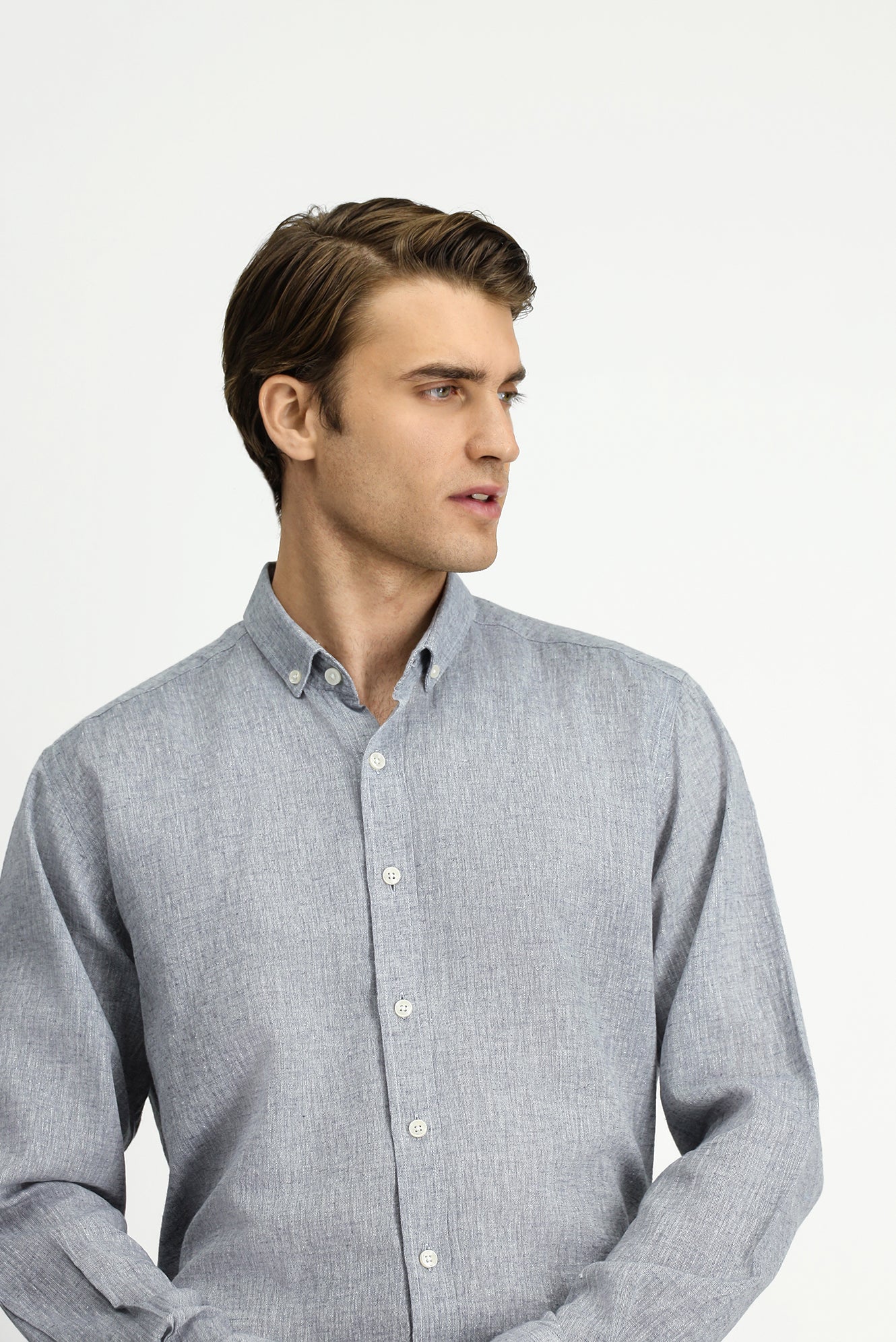 Açık Füme Uzun Kol Regular Fit Düğmeli Yaka Pamuklu Keten Gömlek