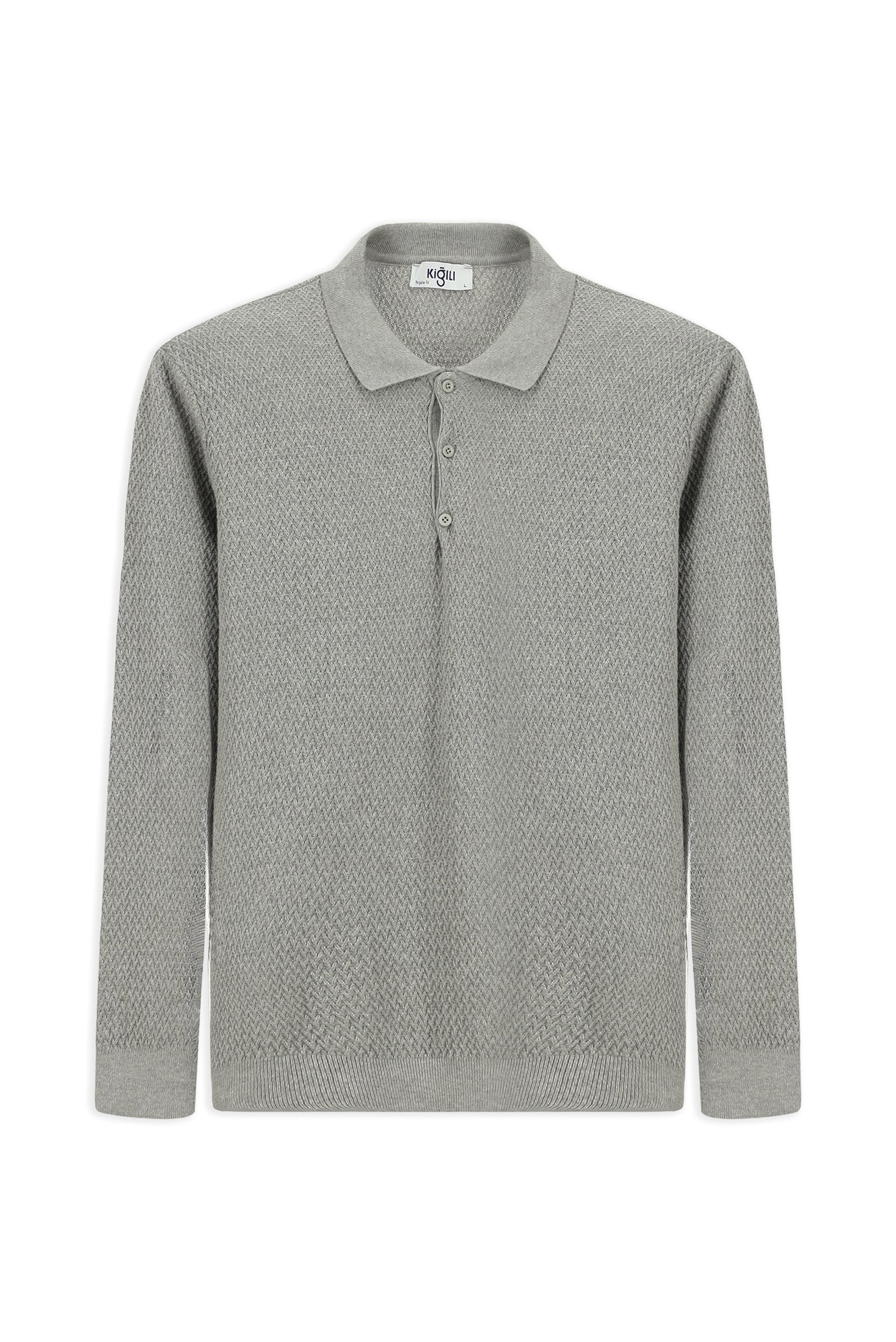 Açık Gri Melanj Polo Yaka Regular Fit Desenli Pamuklu Triko Kazak