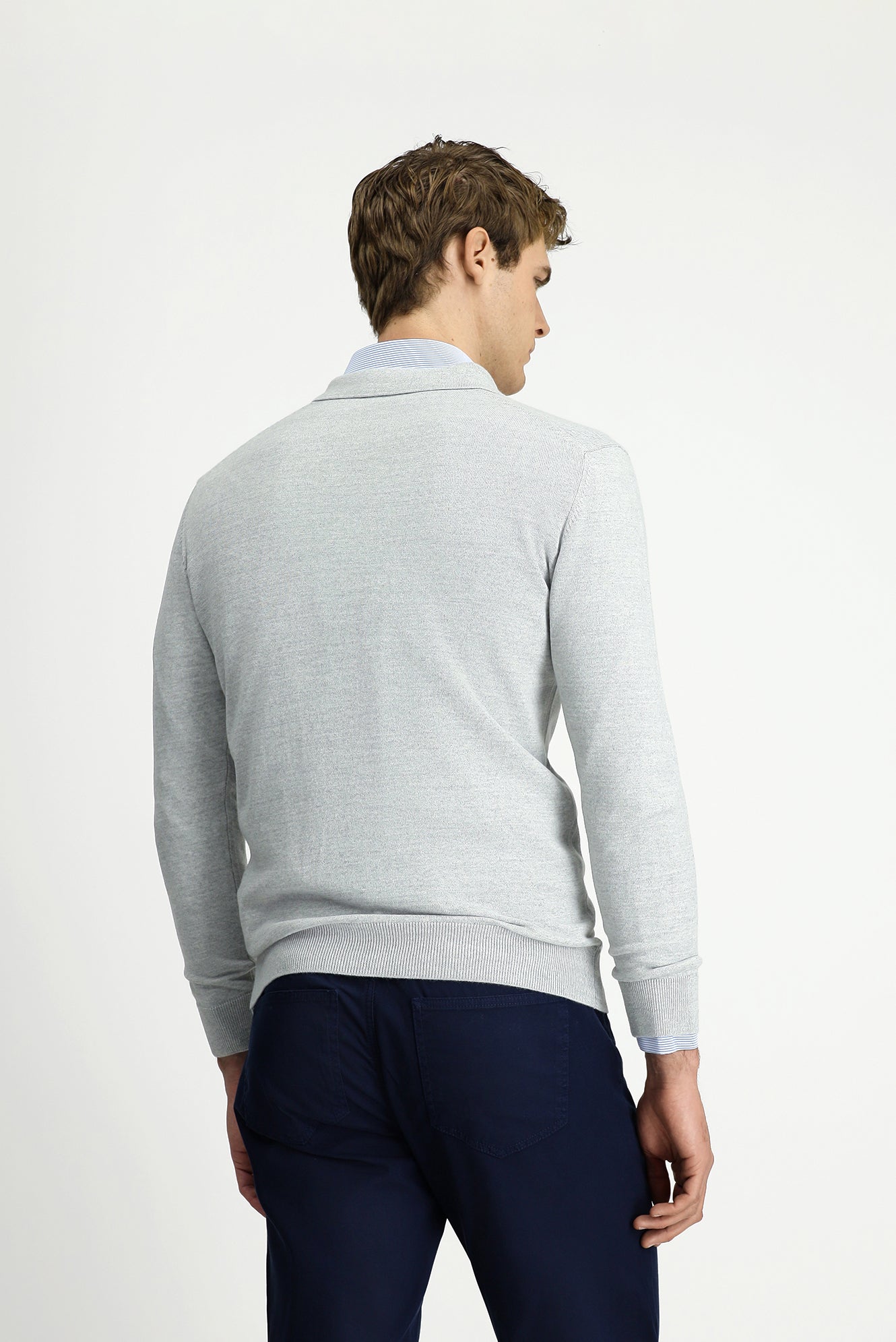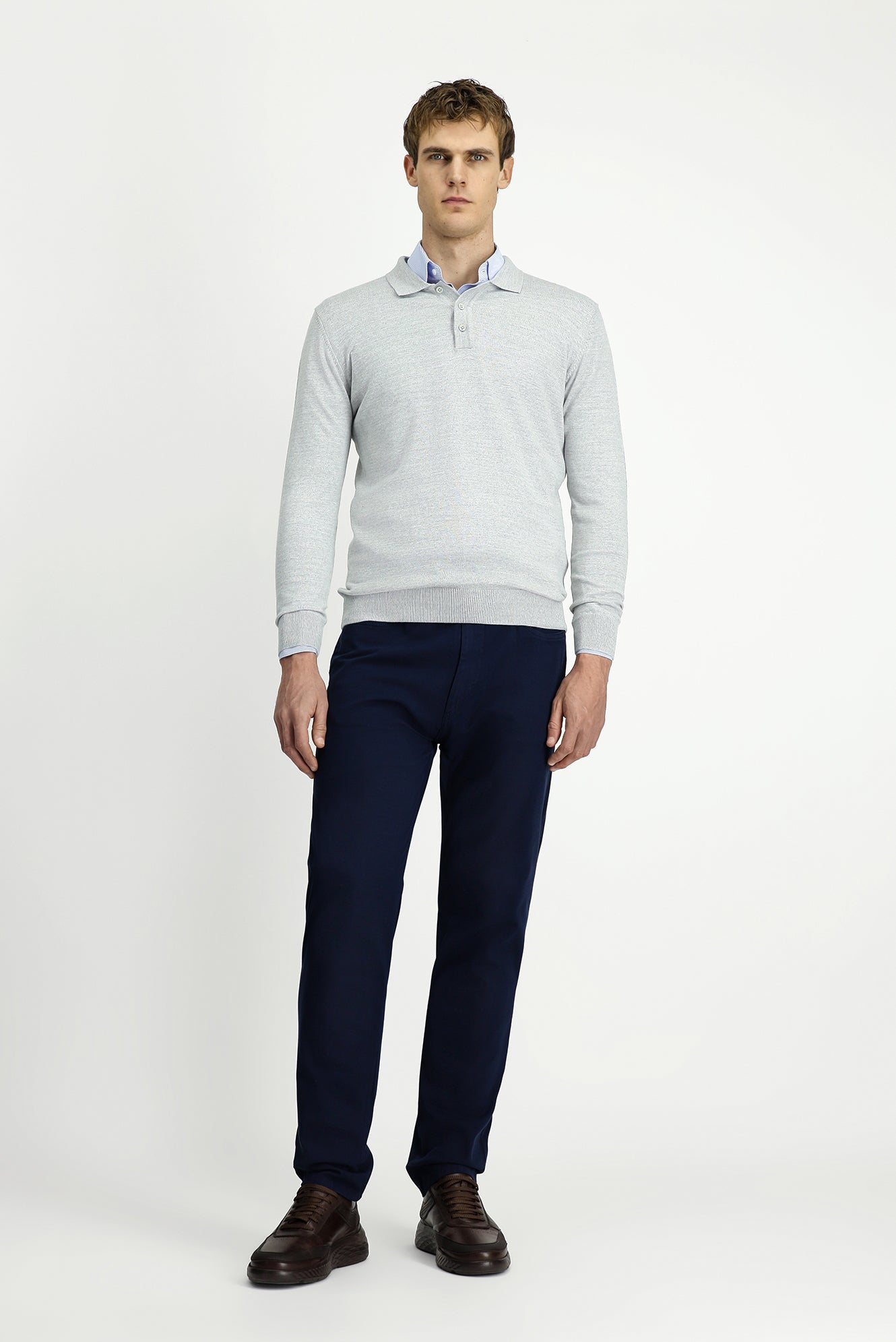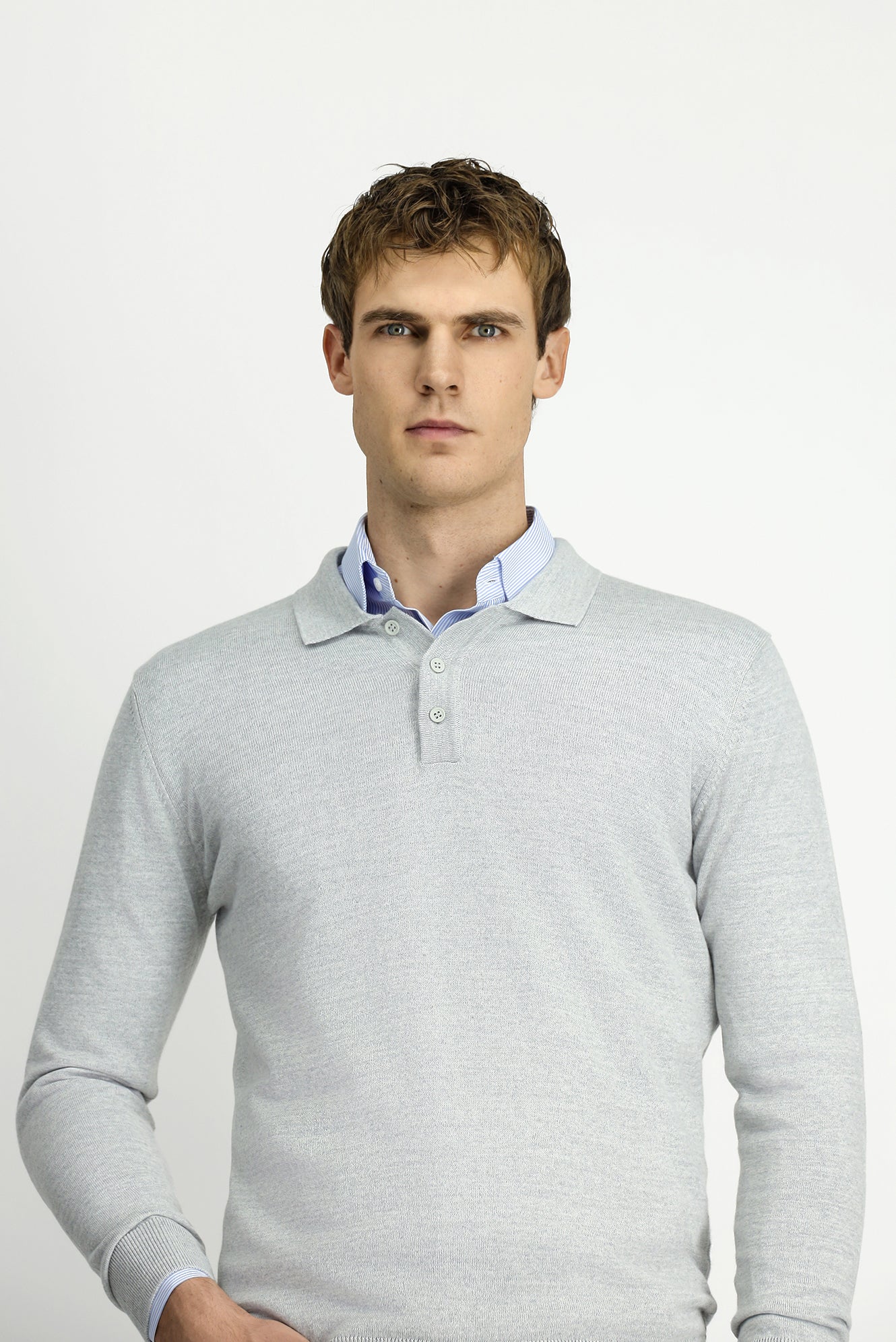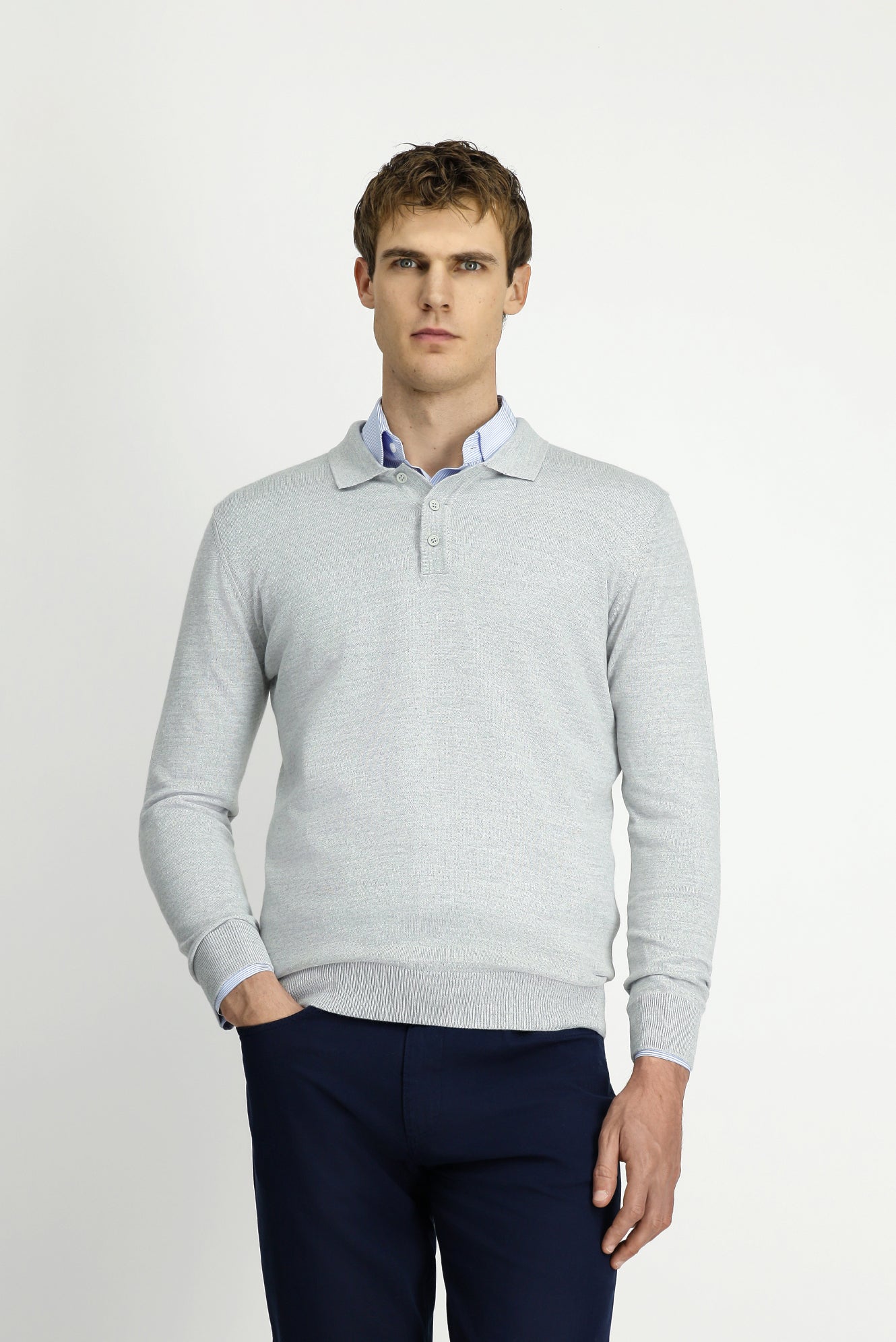 Açık Gri Melanj Polo Yaka Düğmeli Regular Fit Sıcak Tutan Yünlü Triko Kazak