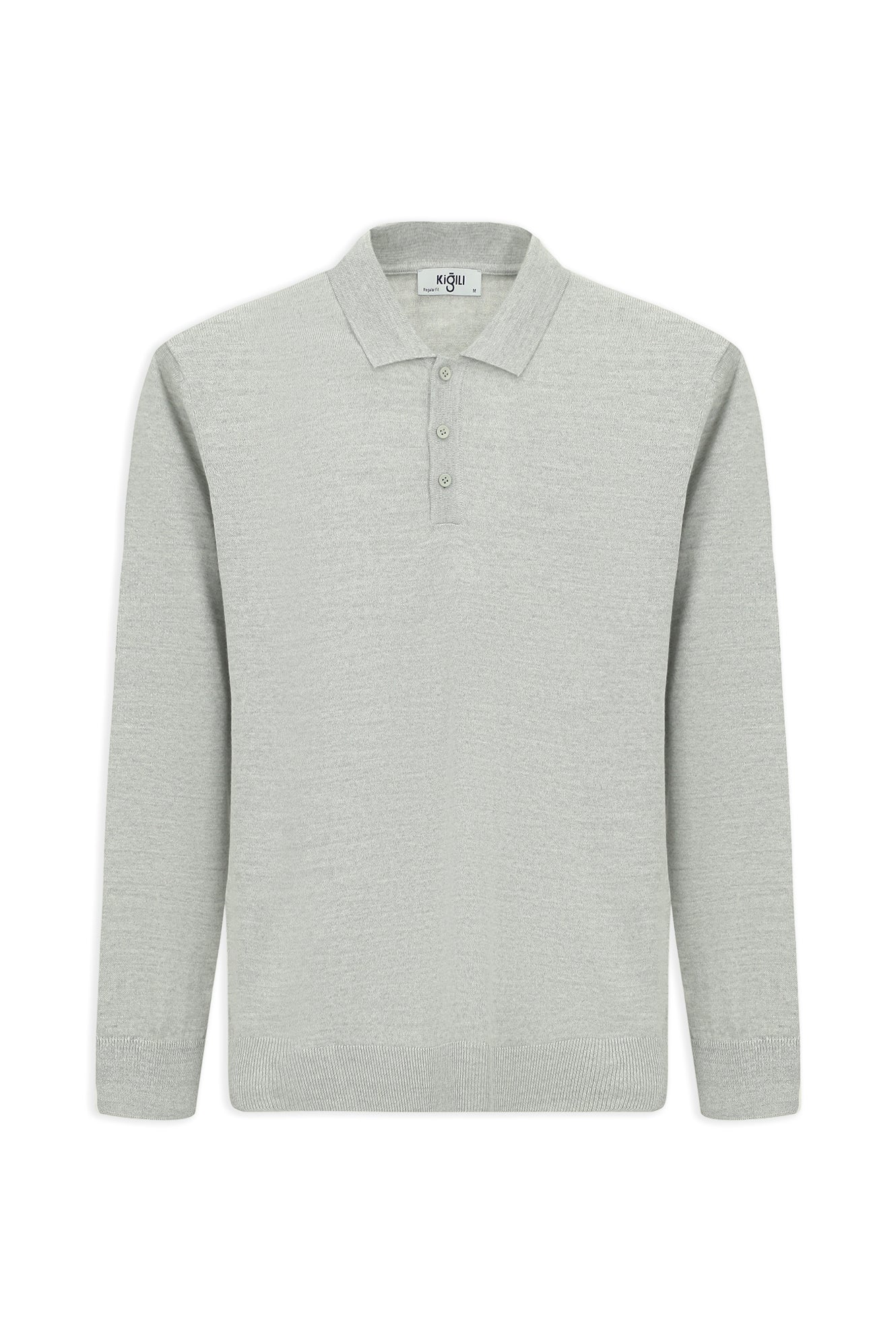 Açık Gri Melanj Polo Yaka Regular Fit Yünlü Triko Kazak