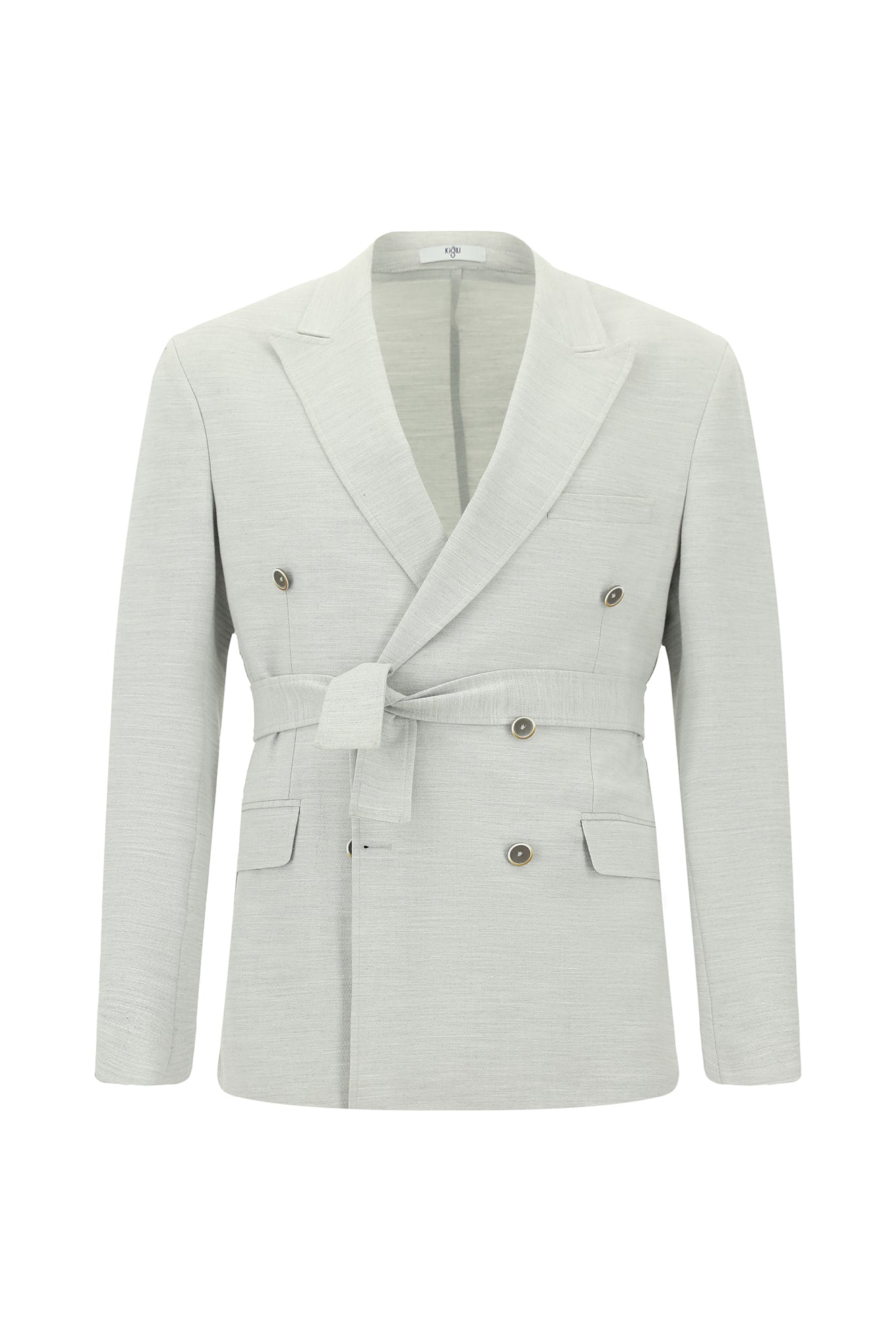 Açık Gri Regular Fit Keten Karışımlı Beli Lastikli İpli Kuşaklı Kruvaze Takım Elbise