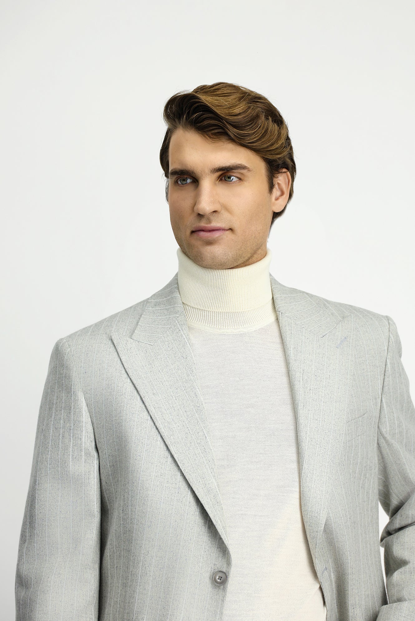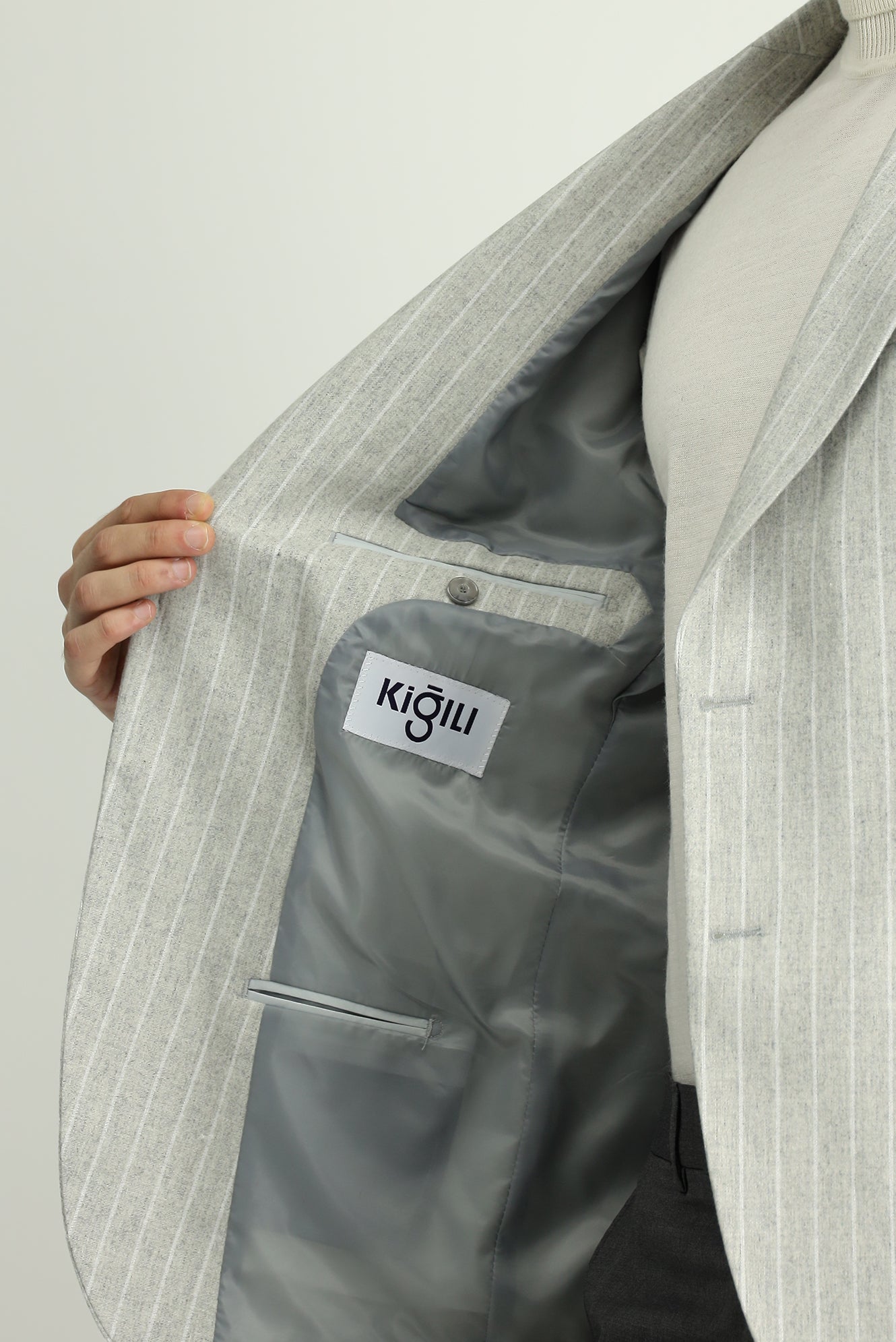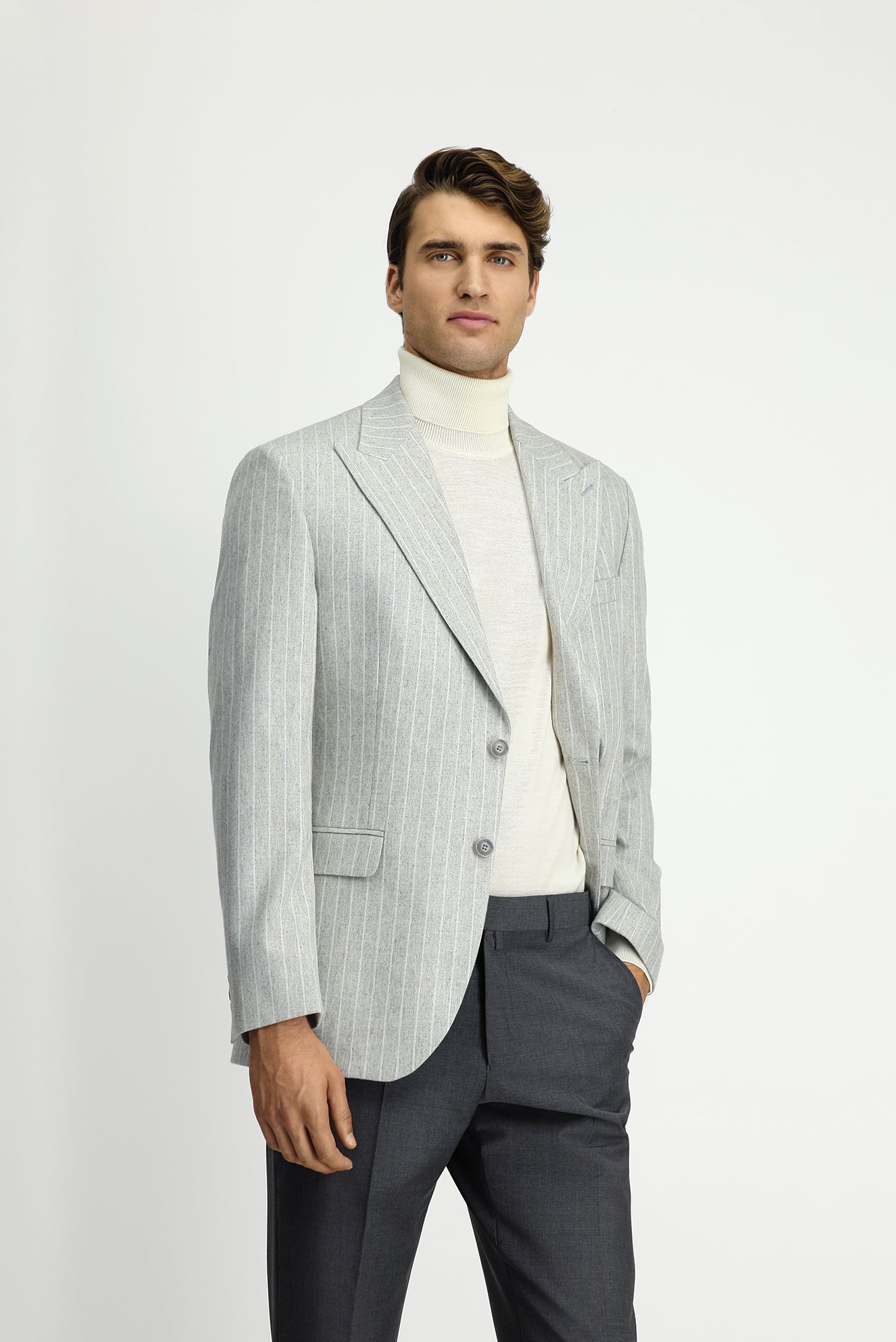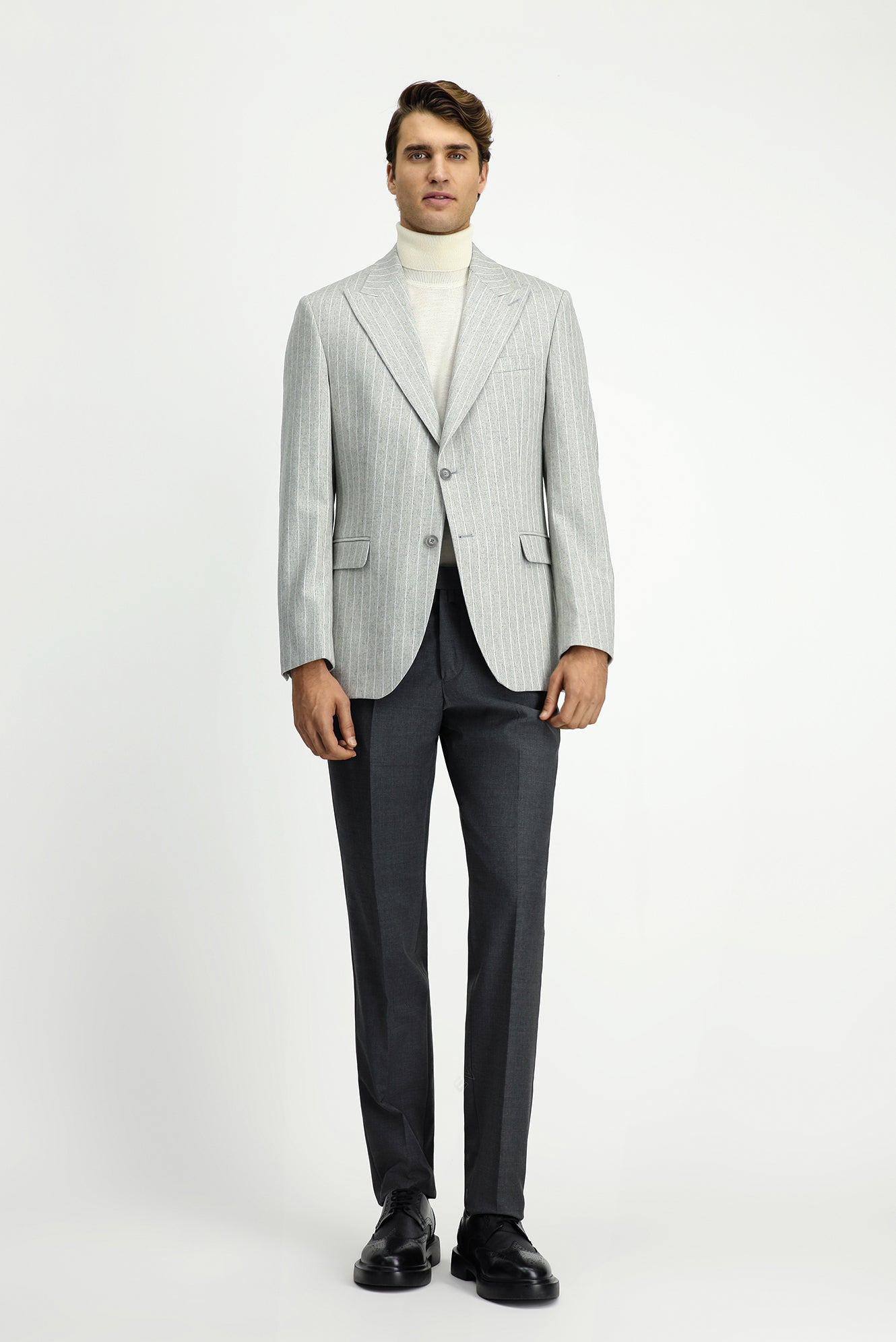 Açık Gri Regular Fit Çizgili Yünlü Klasik Ceket