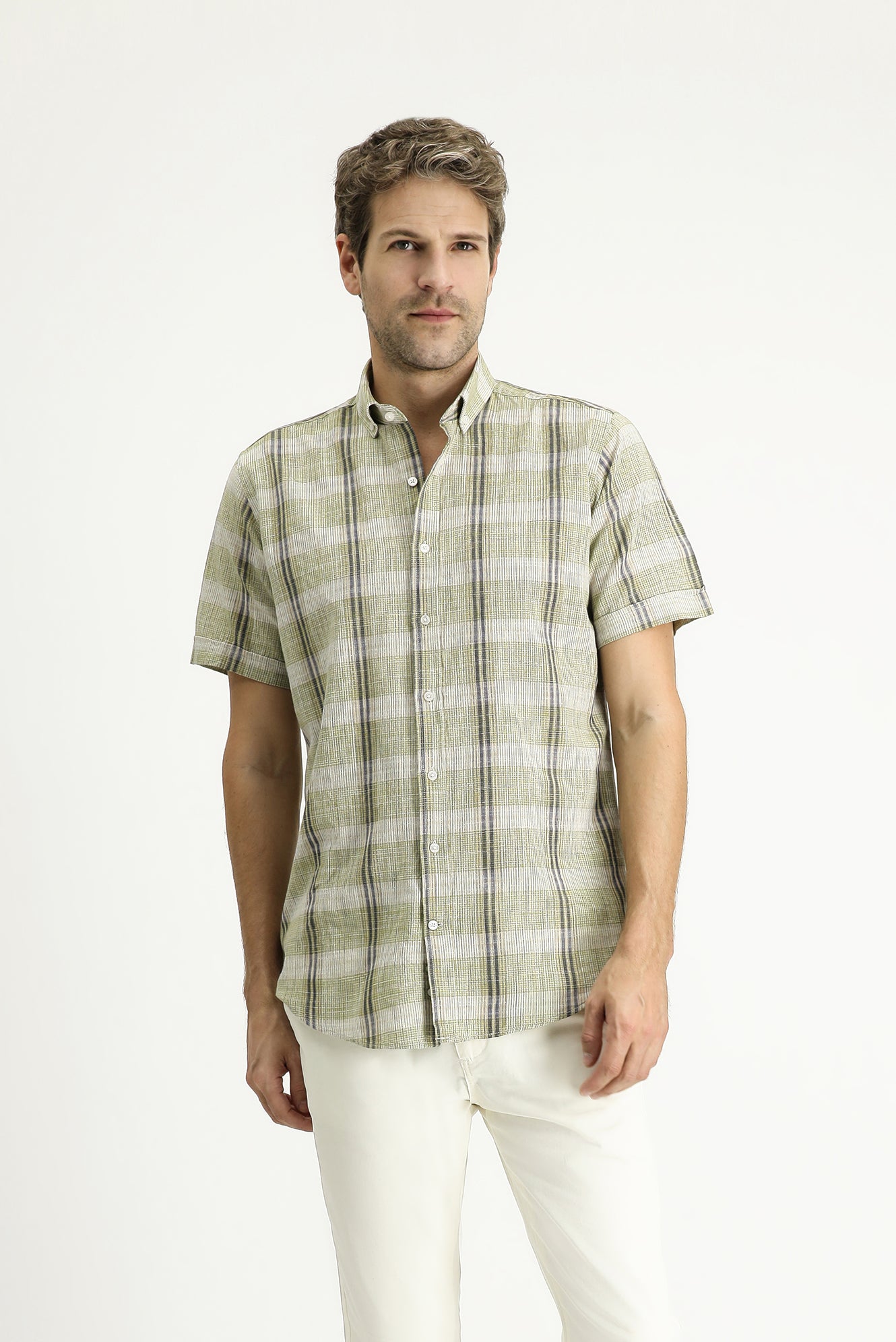 Açık Haki Kısa Kol Regular Fit Ekose Spor Pamuk Düğmeli Yaka Gömlek