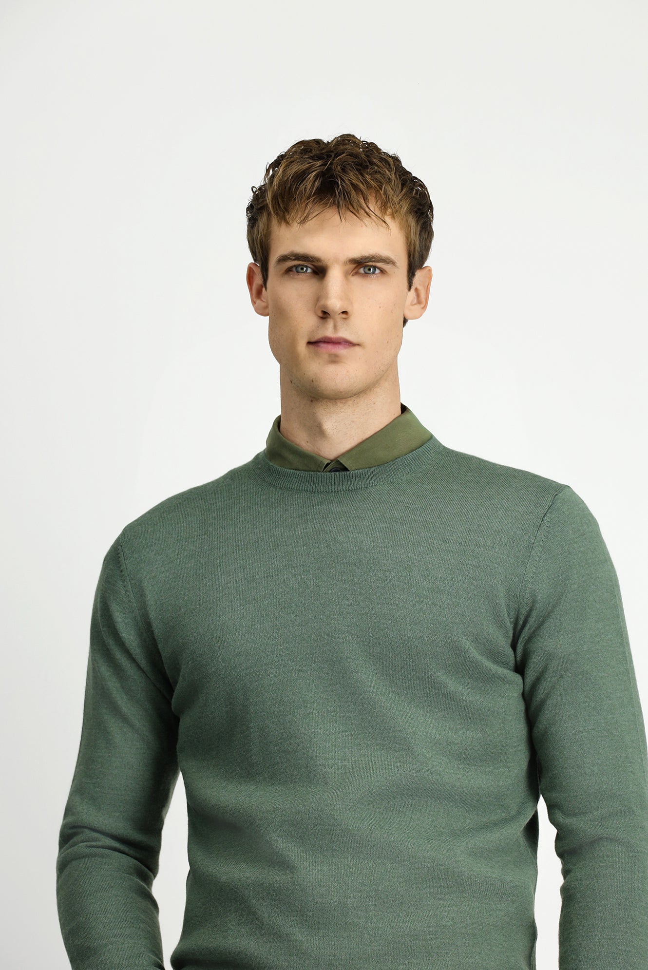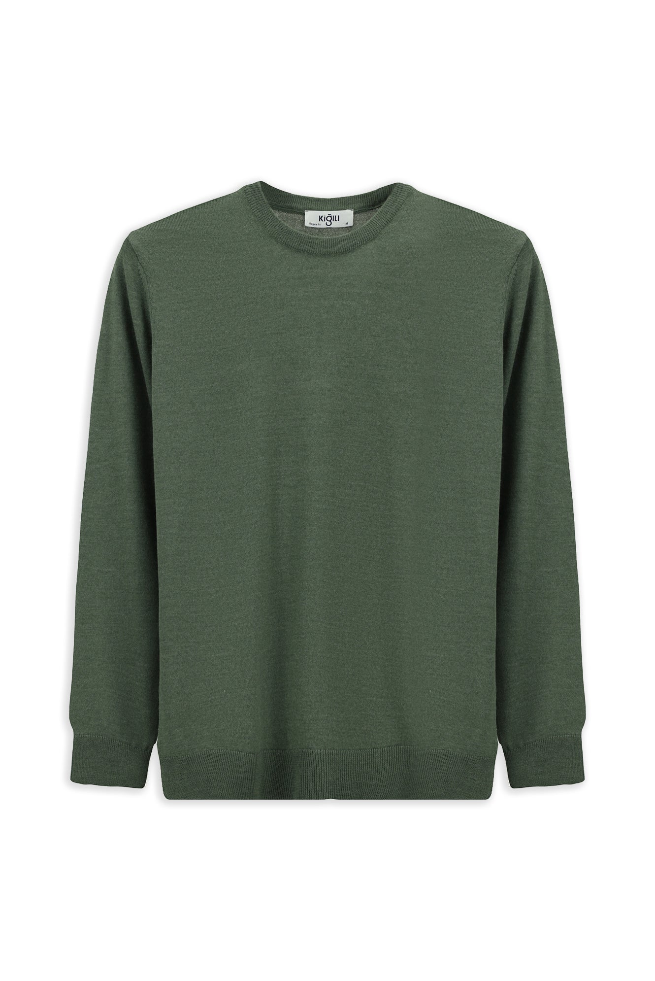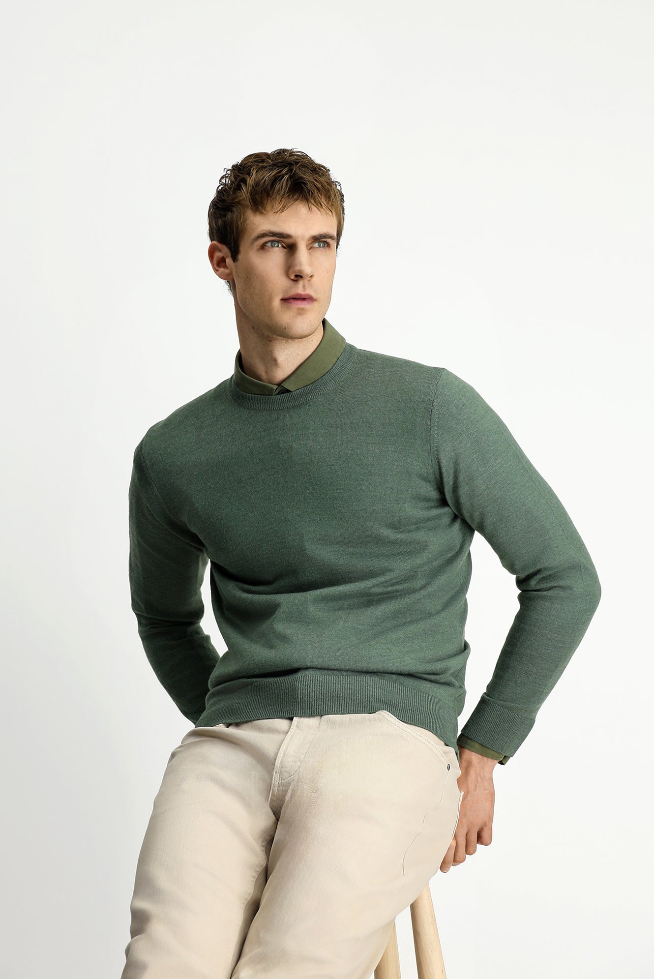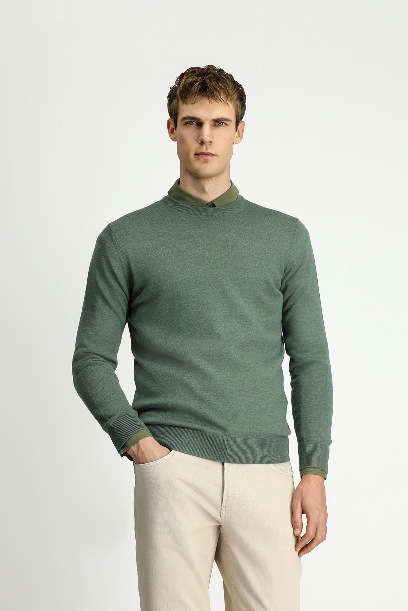 Açık Haki Melanj Bisiklet Yaka Regular Fit Yünlü Triko Kazak