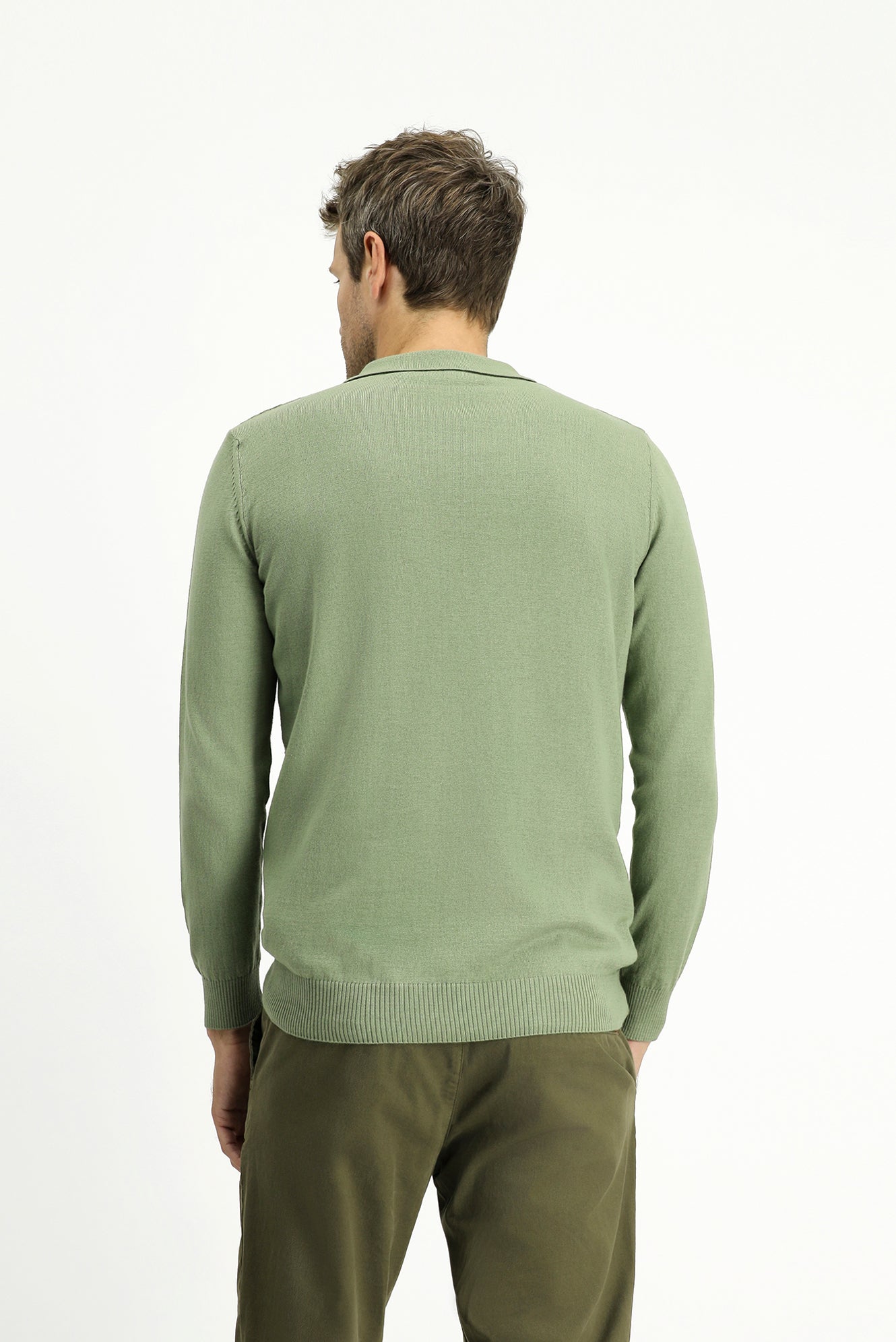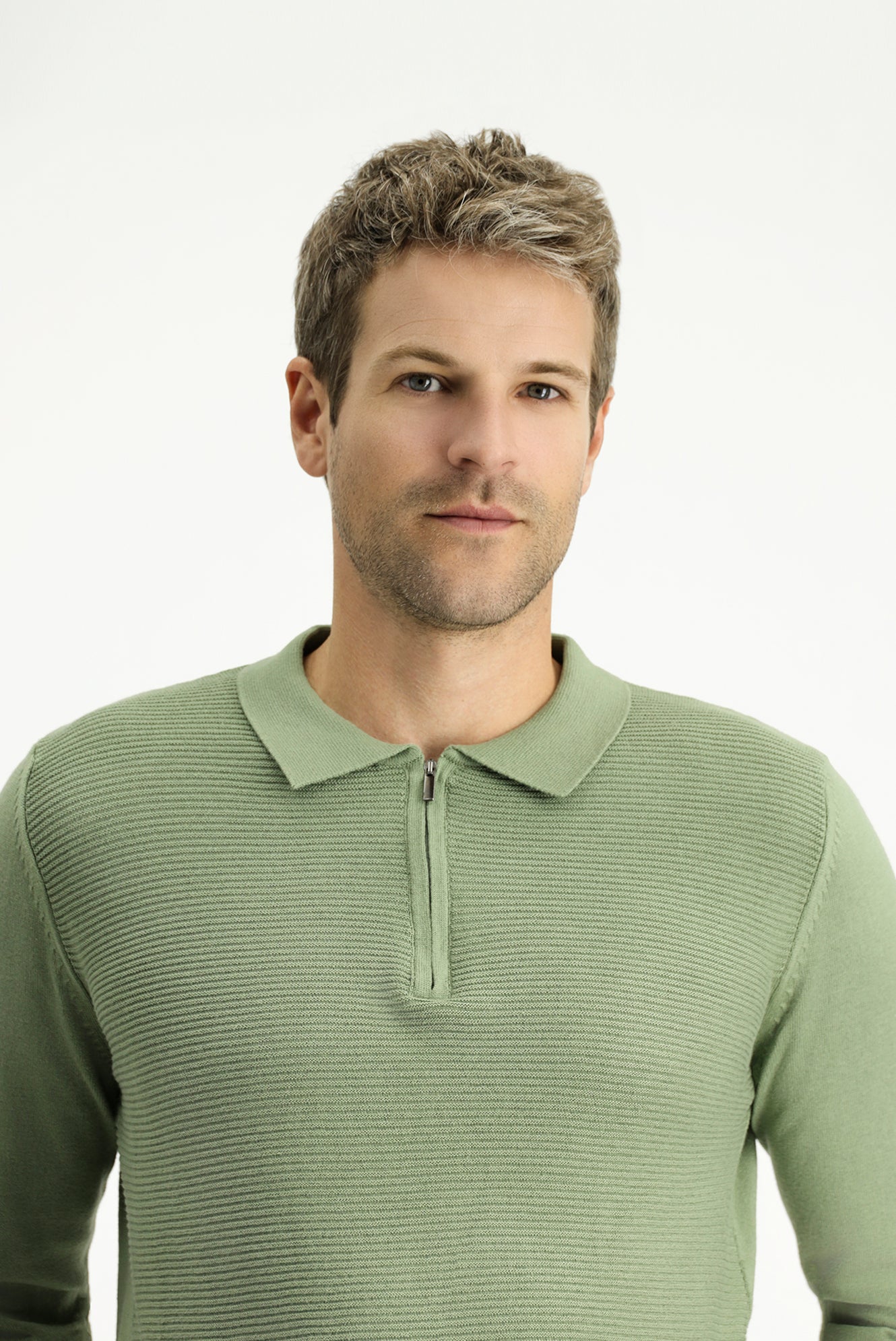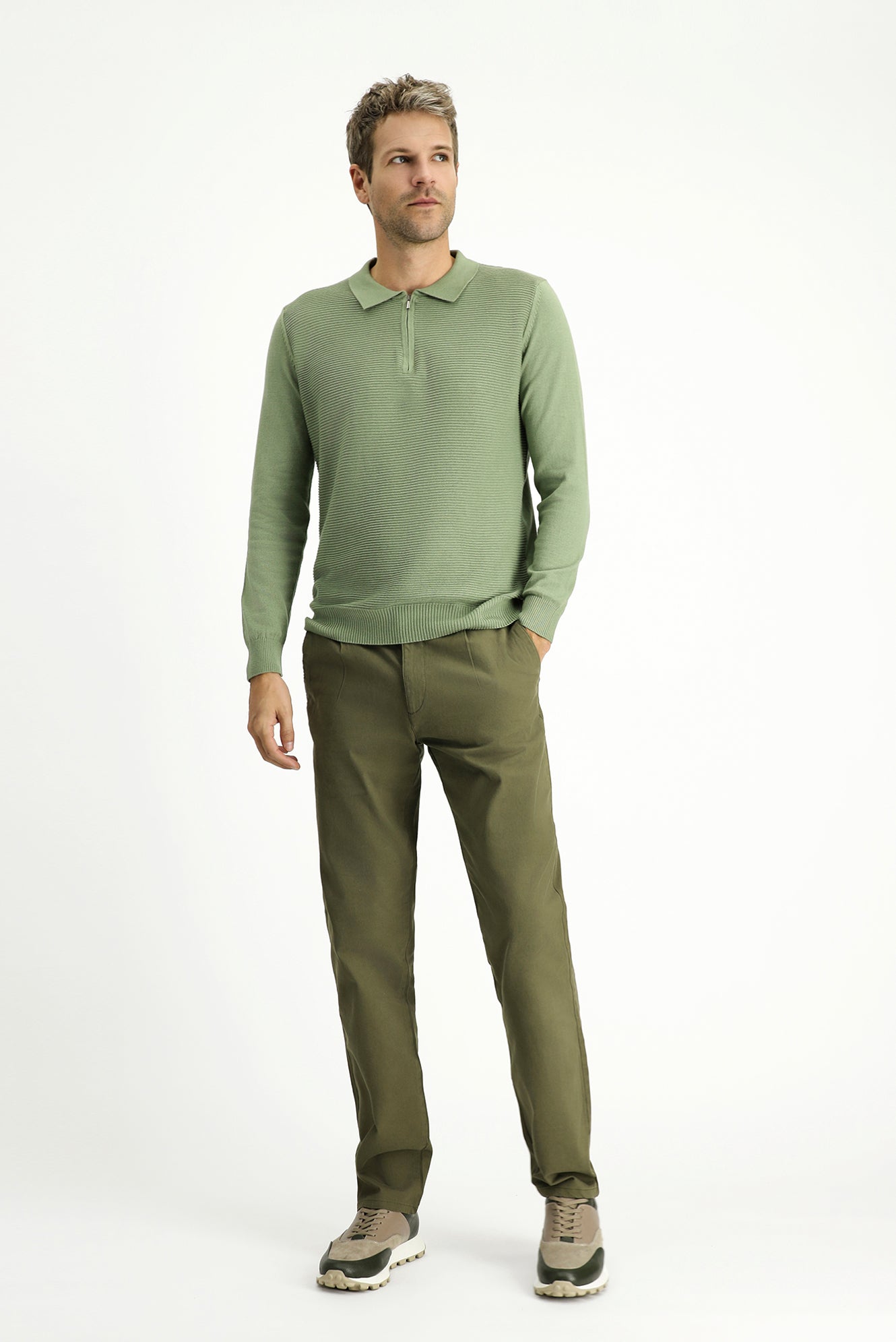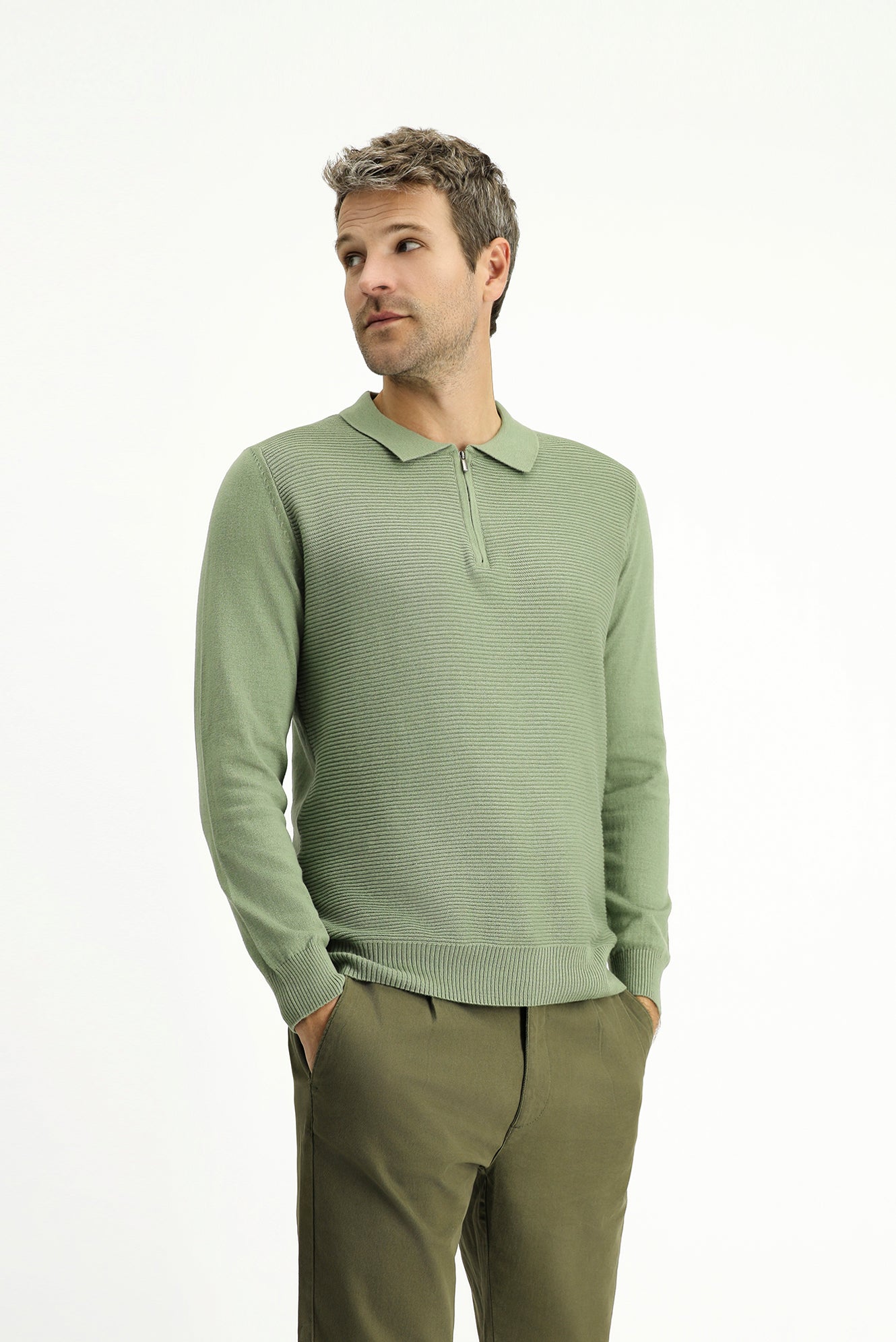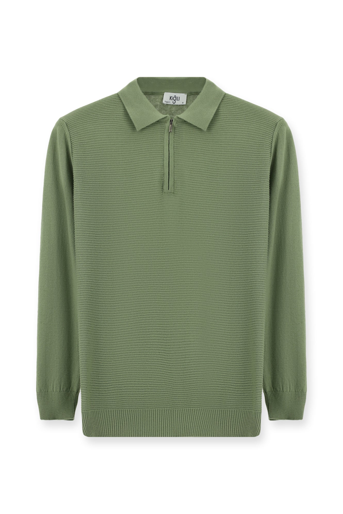 Açık Haki Polo Yaka Regular Fit Fermuarlı Desenli Pamuklu Triko Kazak