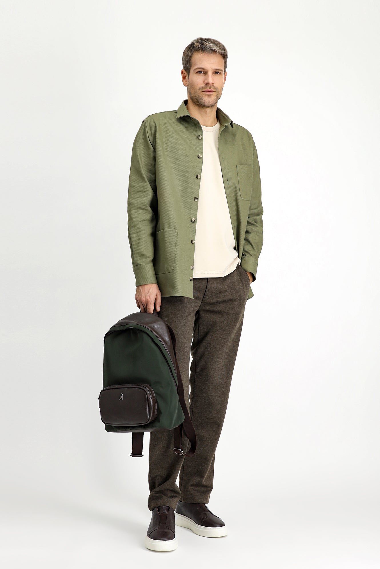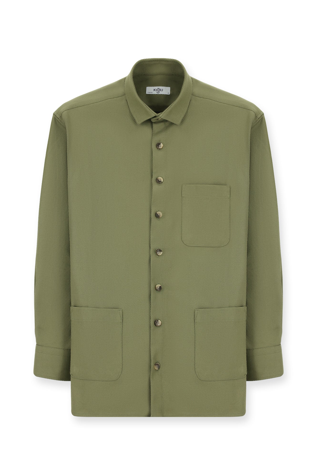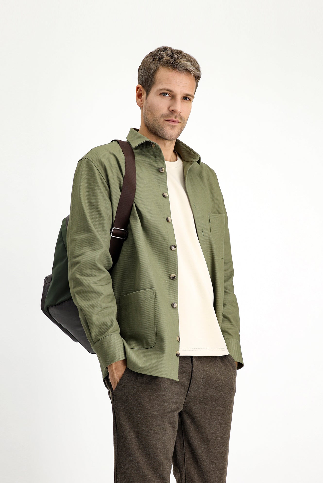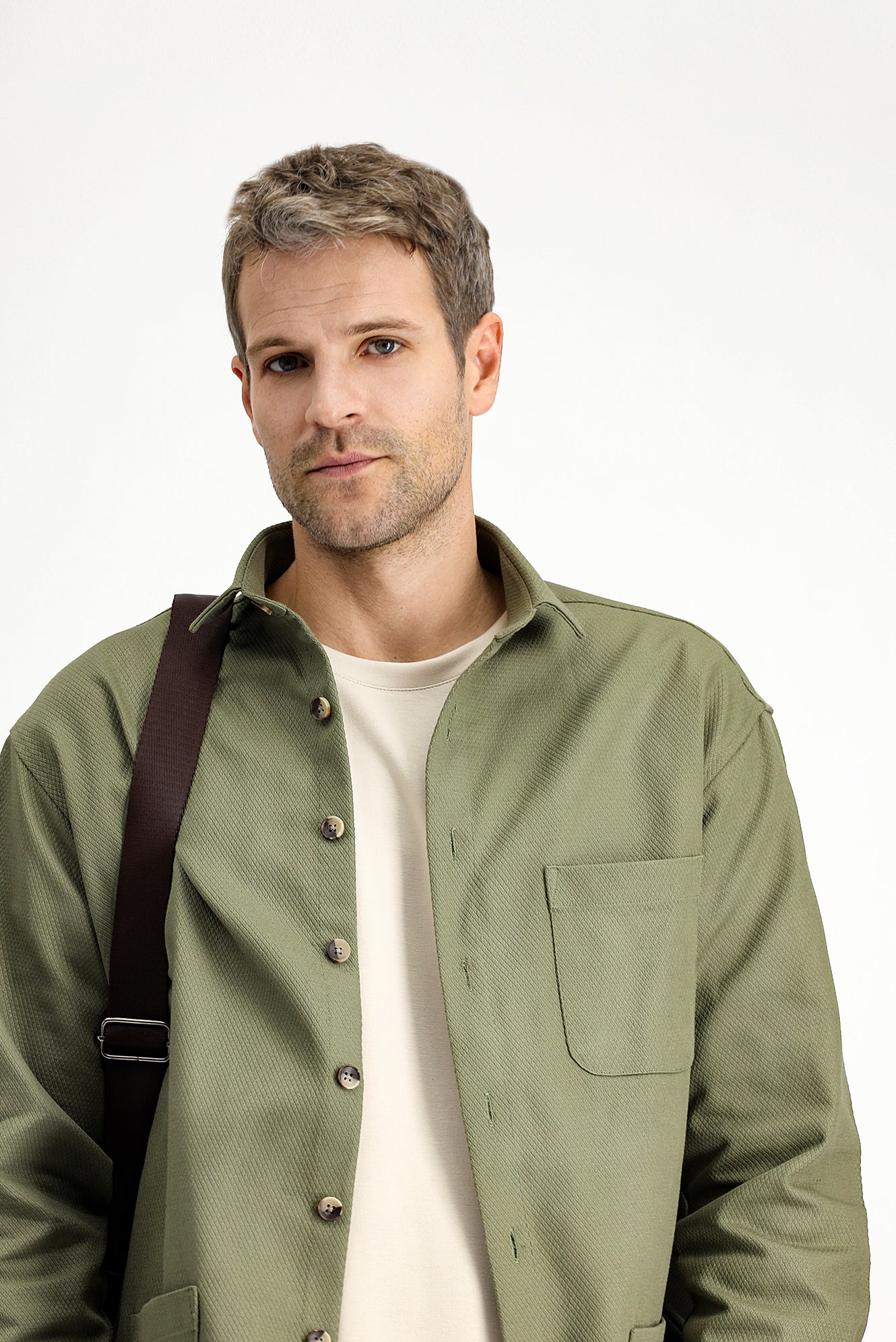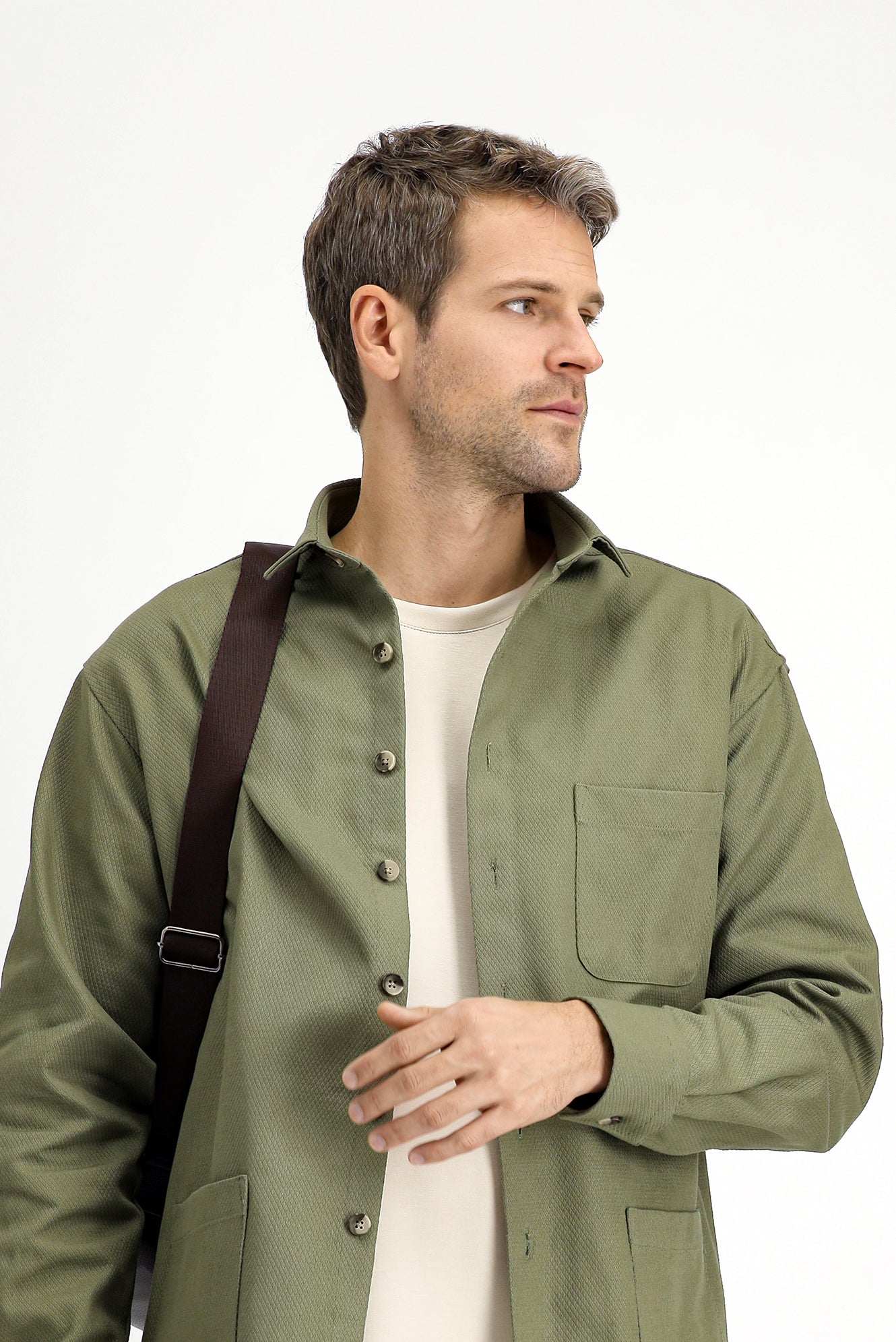 Açık Haki Uzun Kol Oversize Desenli Shacket Pamuk Gömlek / Mont