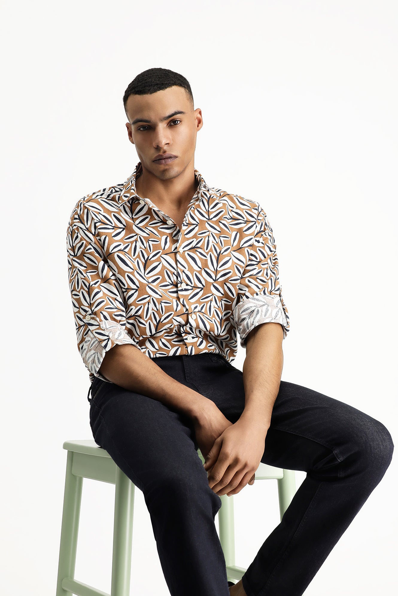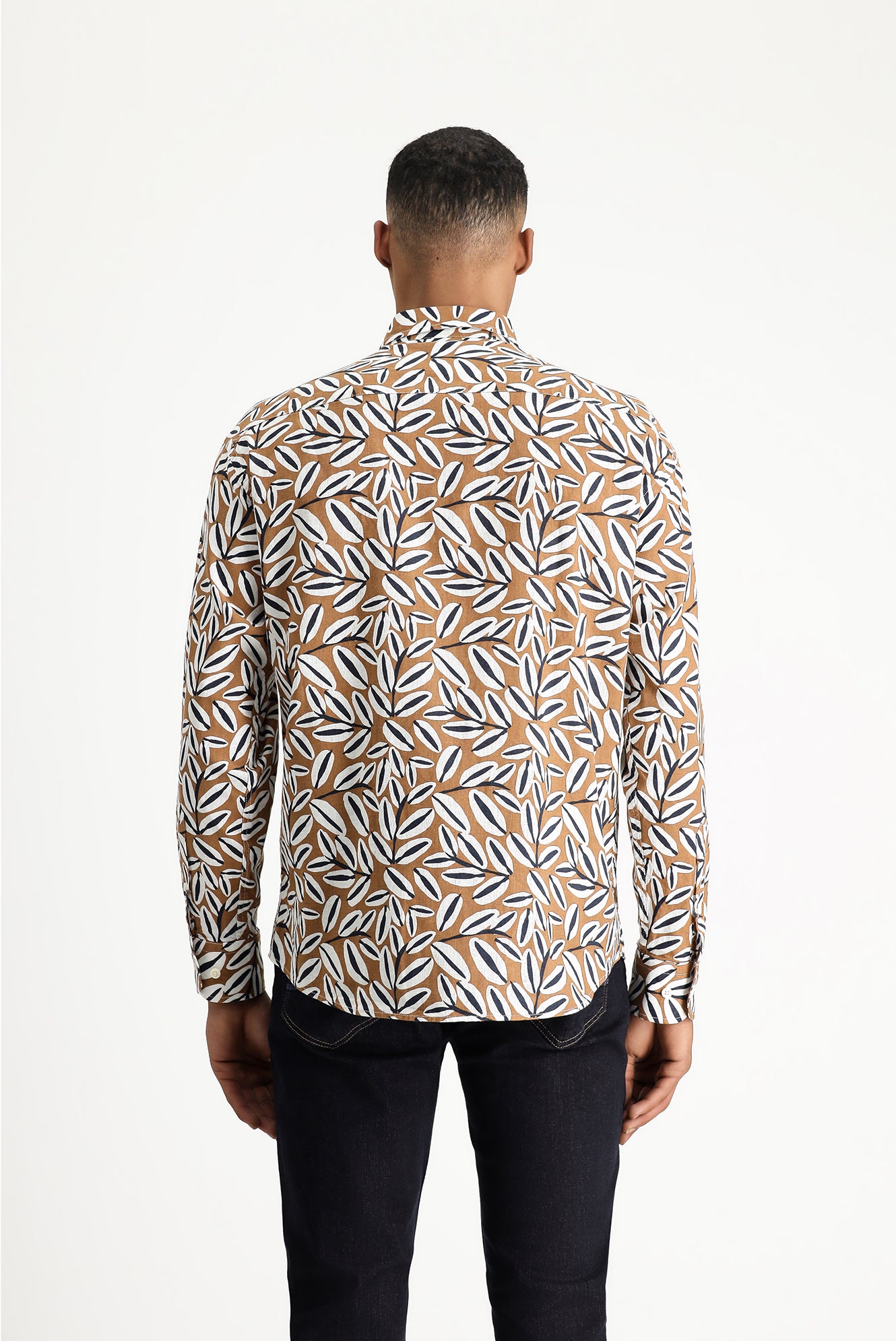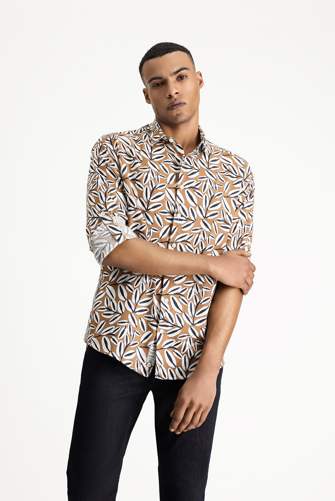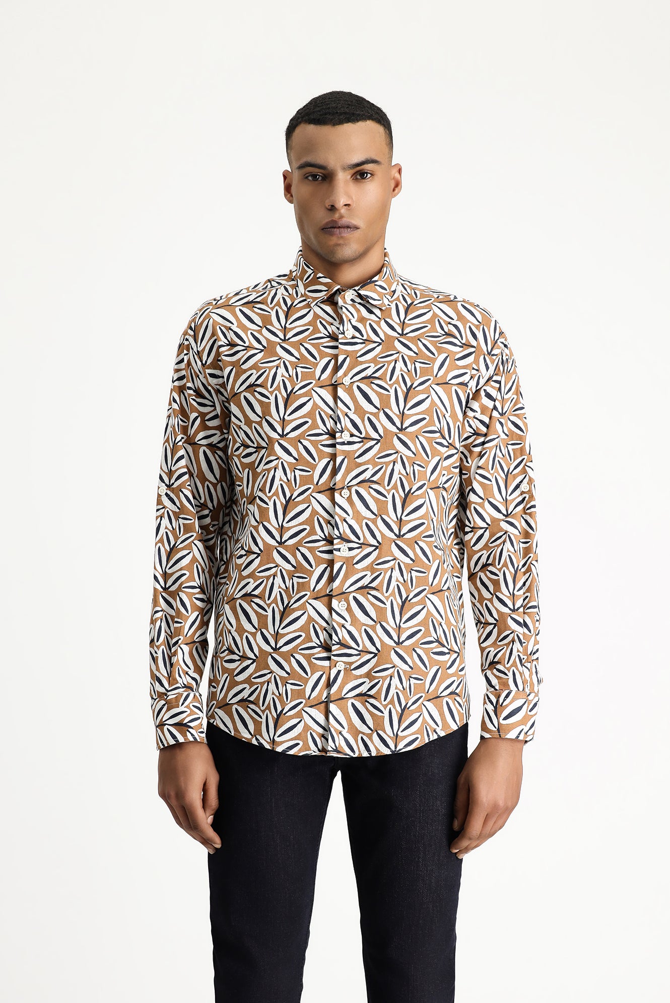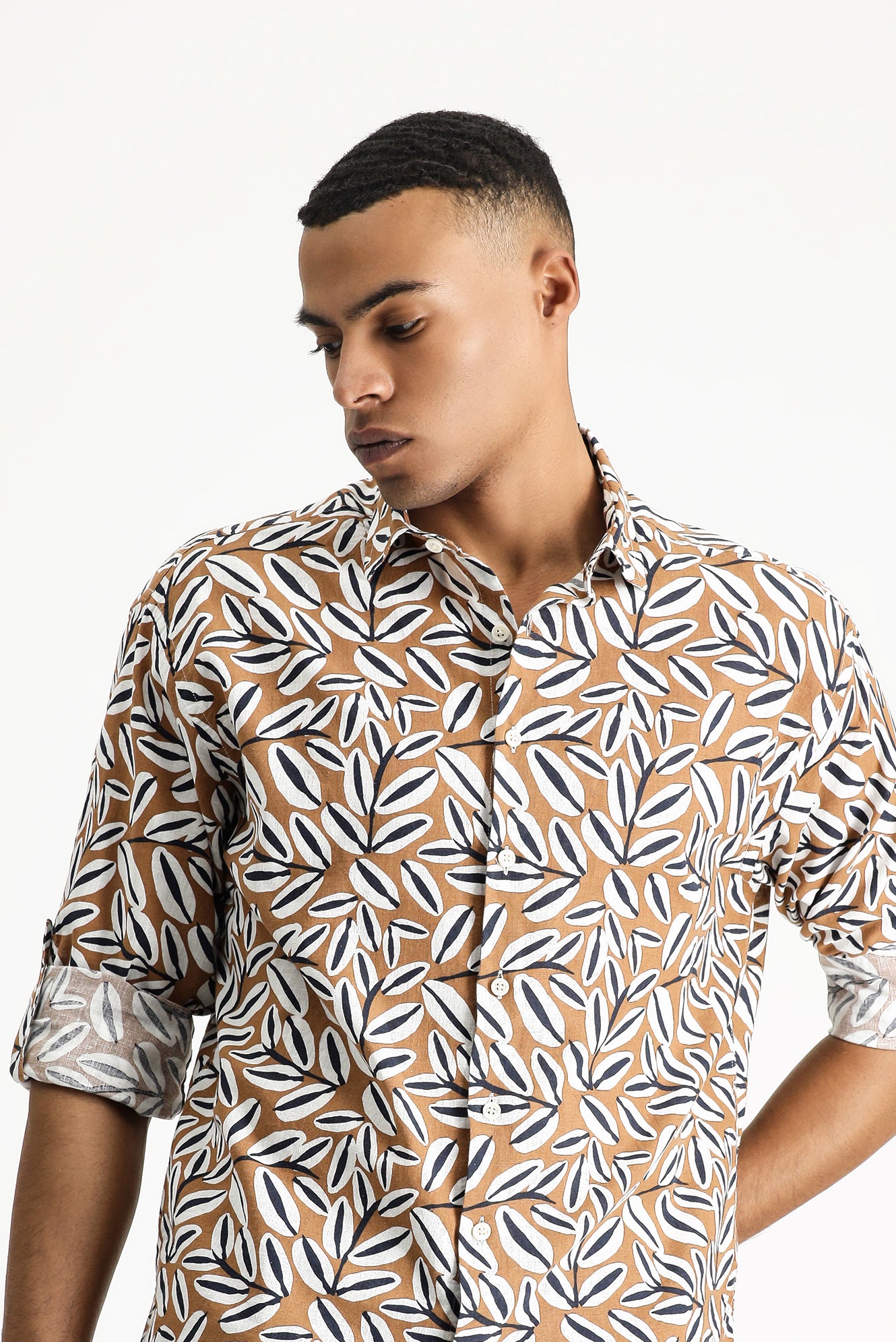 Açık Kahve Uzun Kol Oversize Baskılı Keten Karışımlı Pamuklu Gömlek