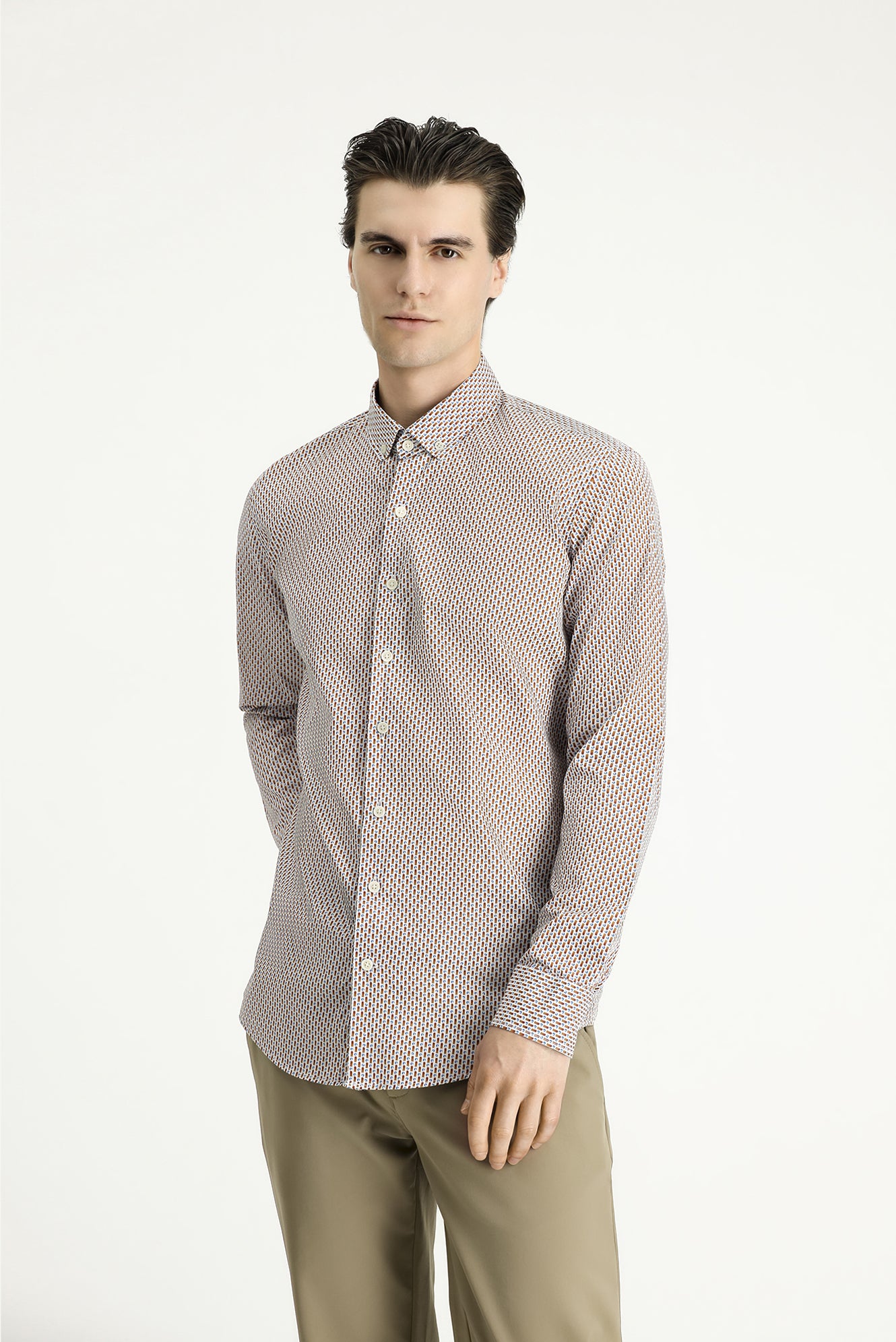Açık Kahve Uzun Kol Slim Fit Dar Kesim Baskılı Pamuk Düğmeli Yaka Gömlek