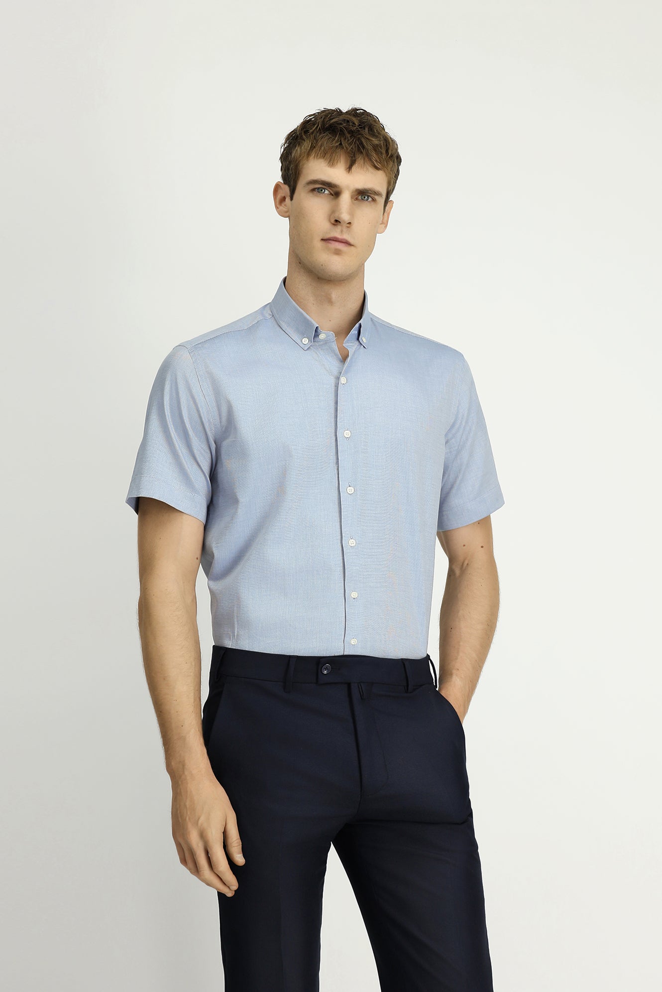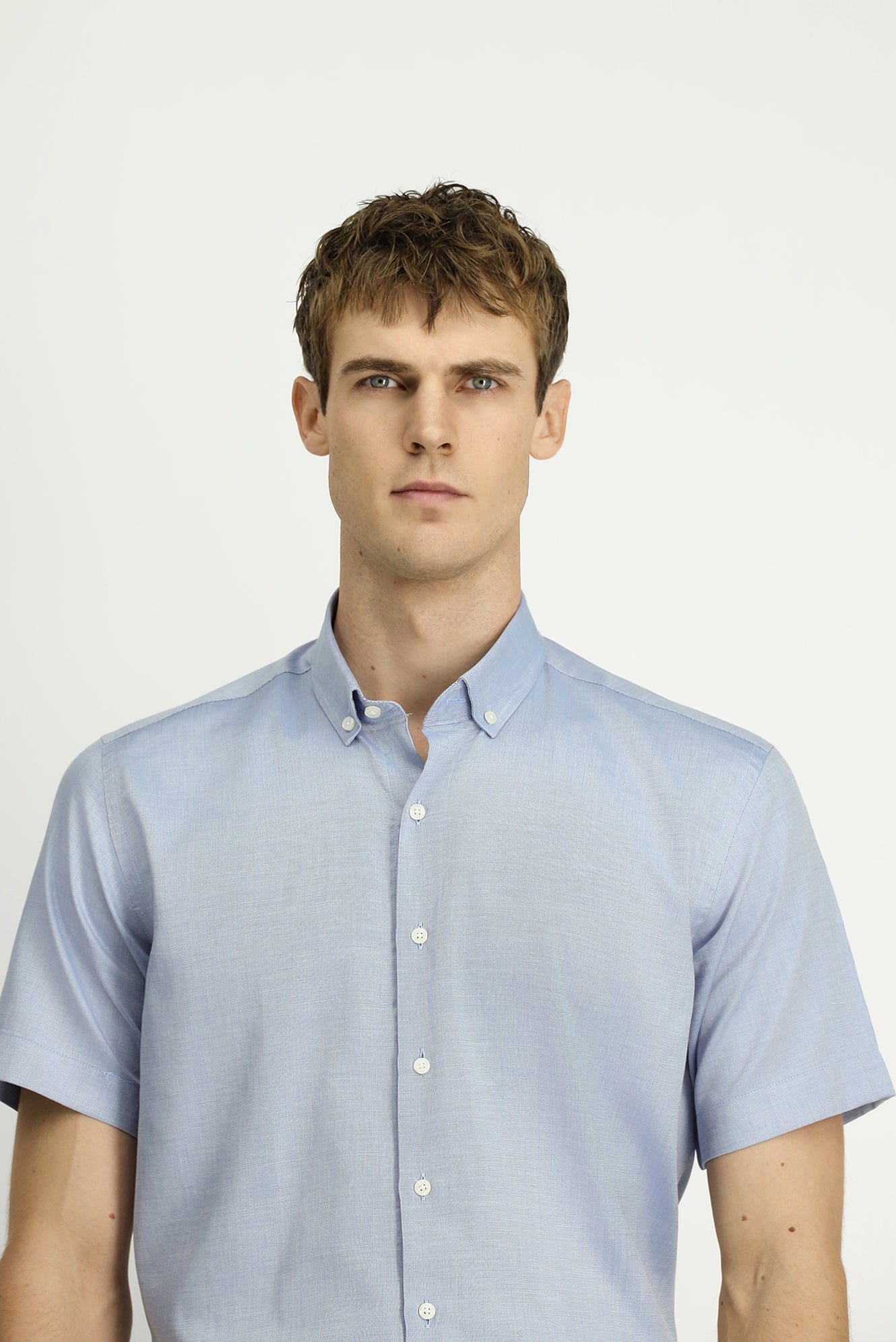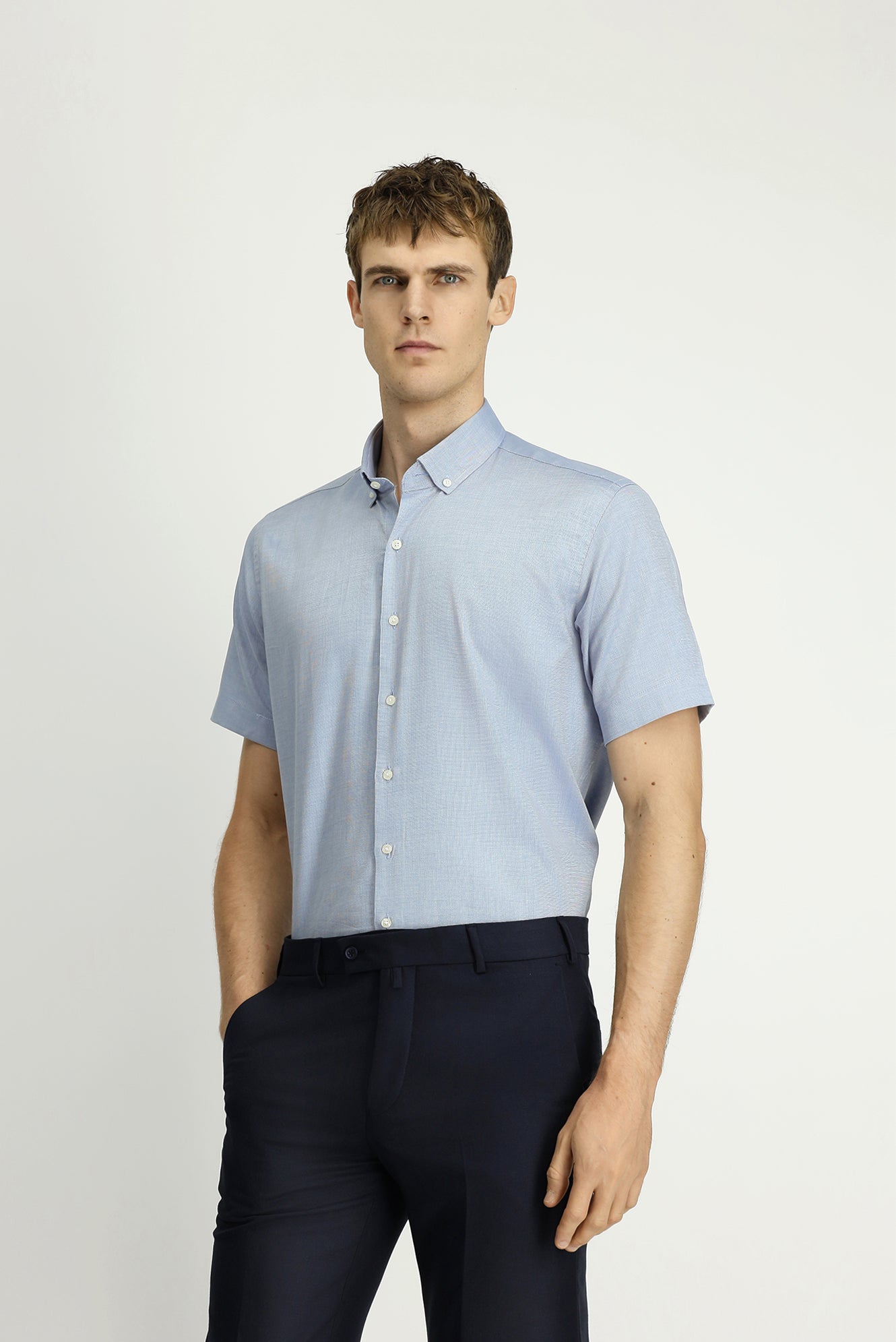 Açık Lacivert Kısa Kol Regular Fit Cepli Düğmeli Yaka Desenli Pamuk Gömlek