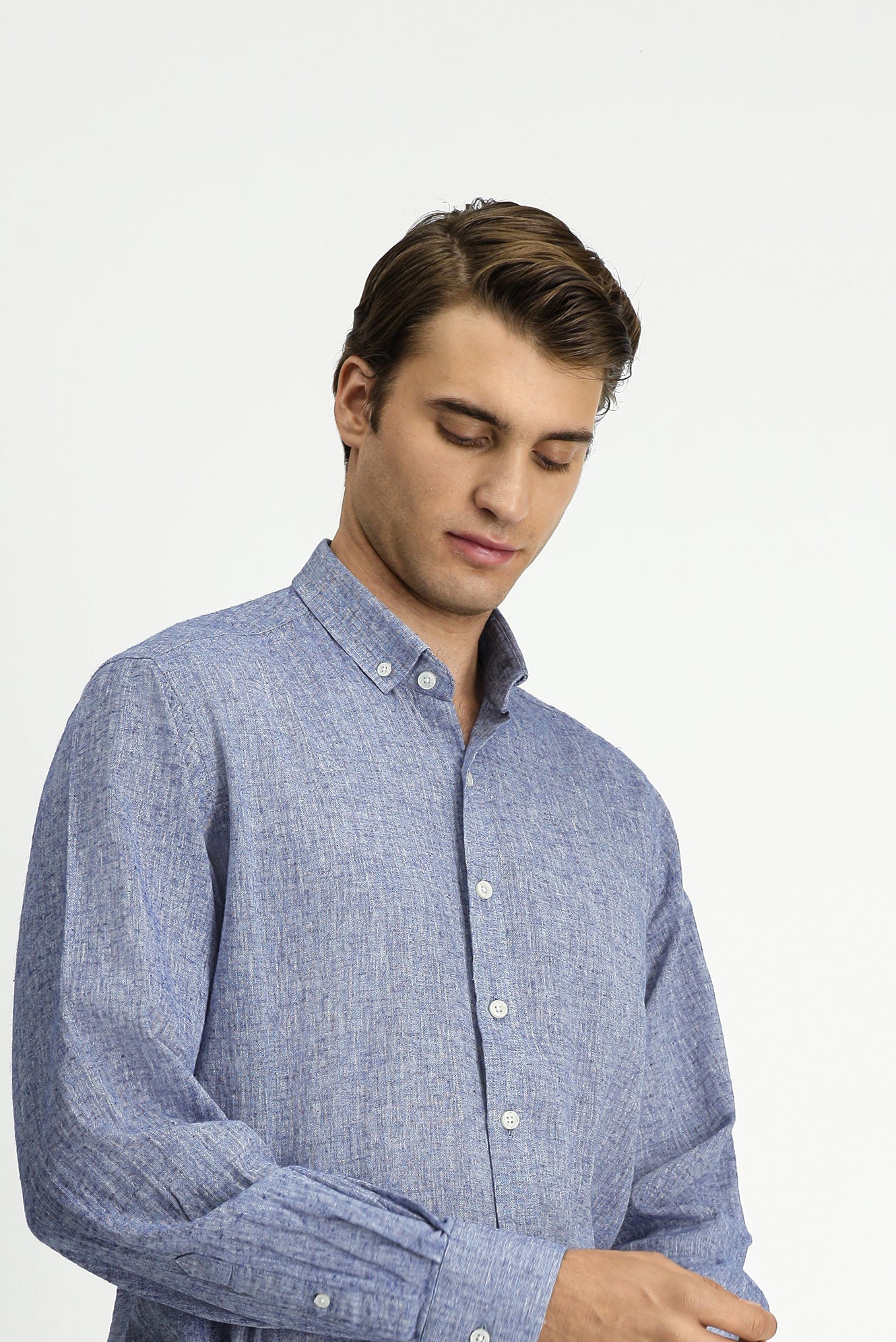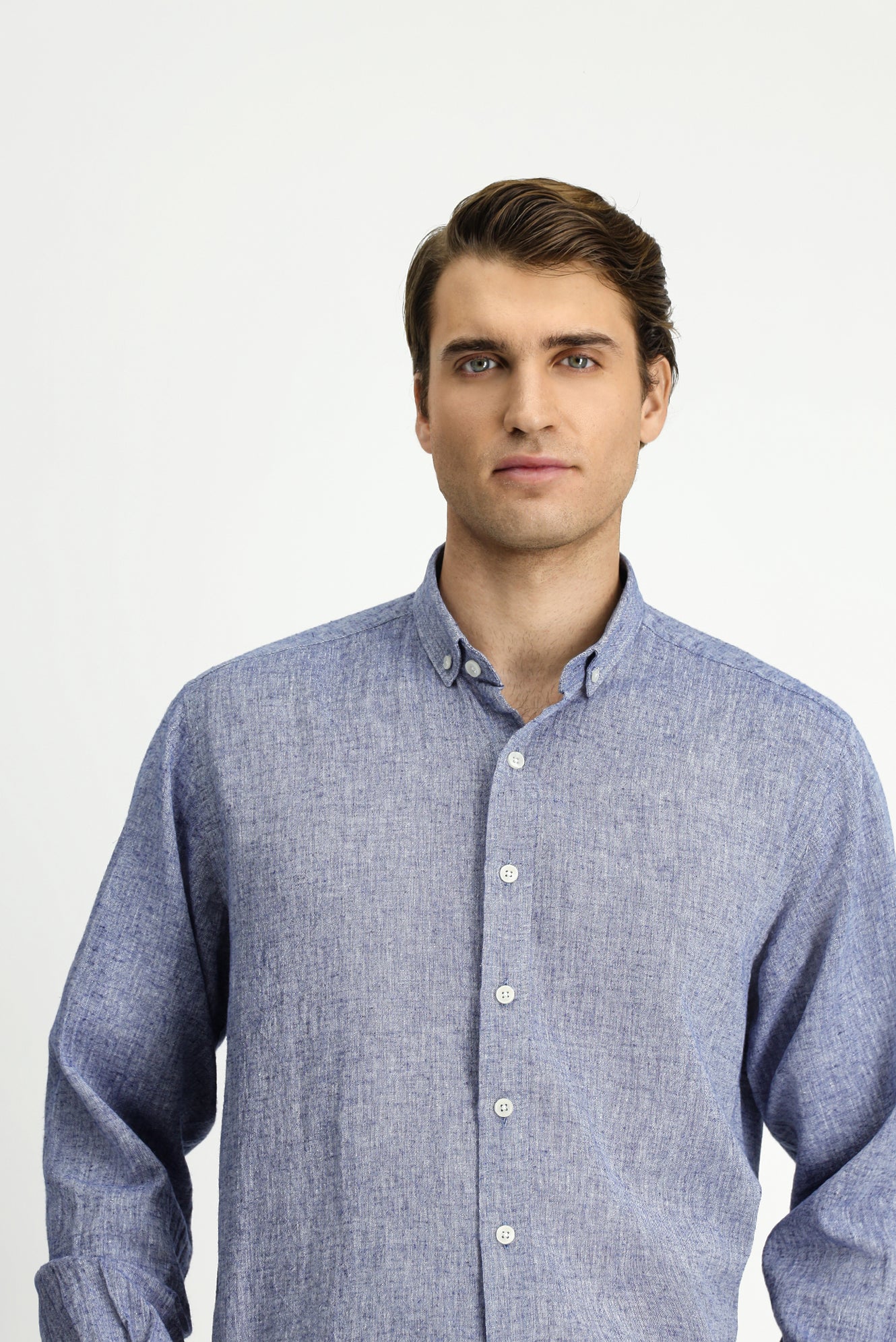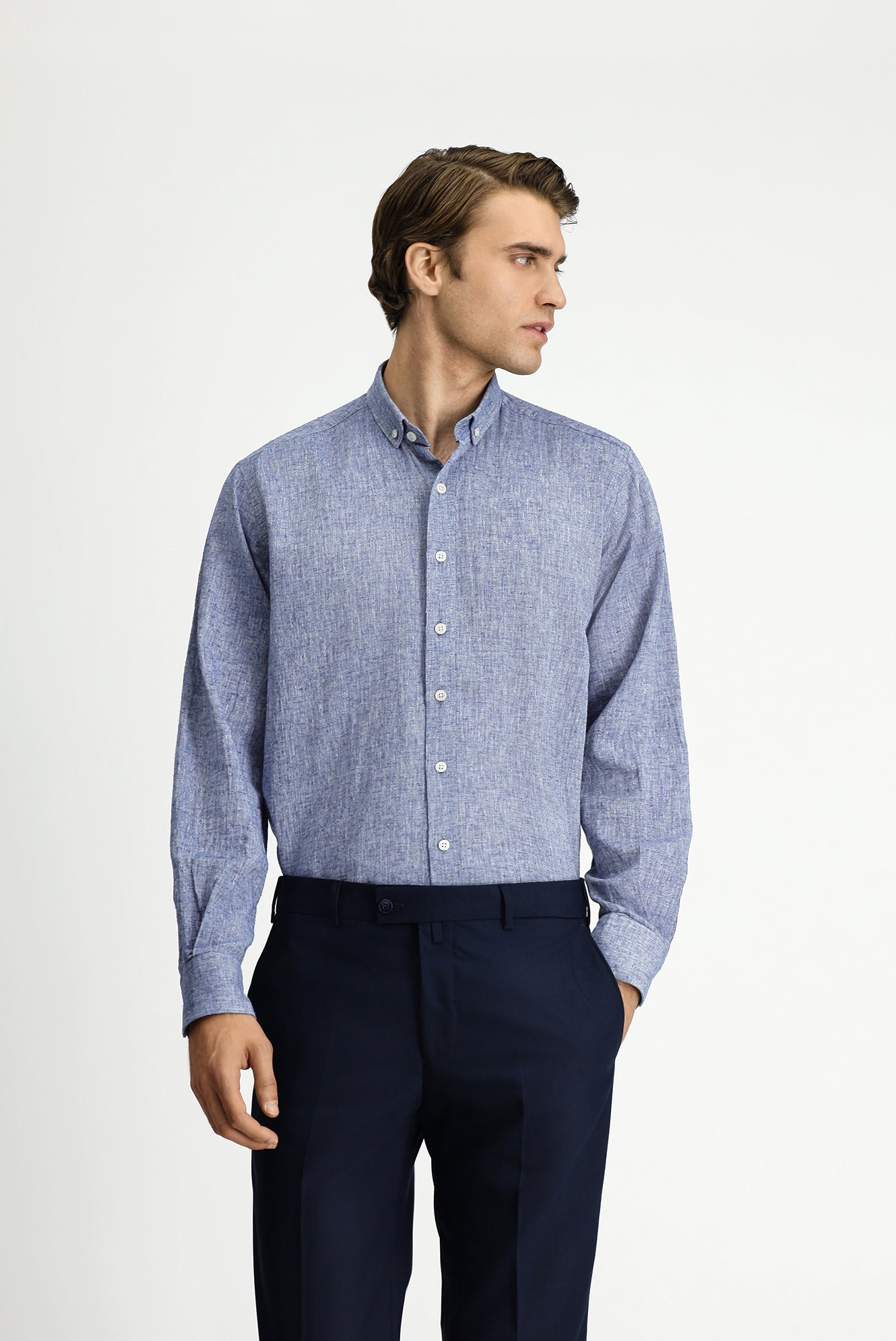 Açık Lacivert Uzun Kol Regular Fit Düğmeli Yaka Pamuklu Keten Gömlek