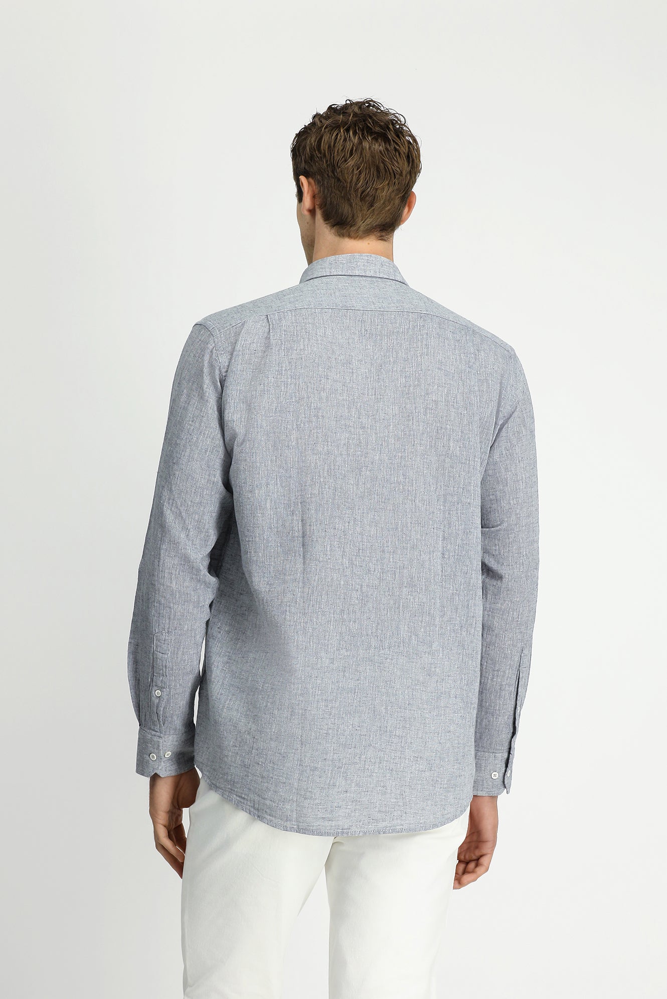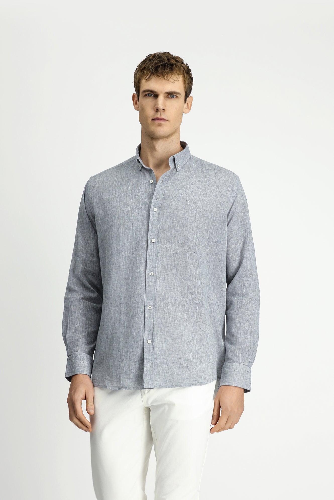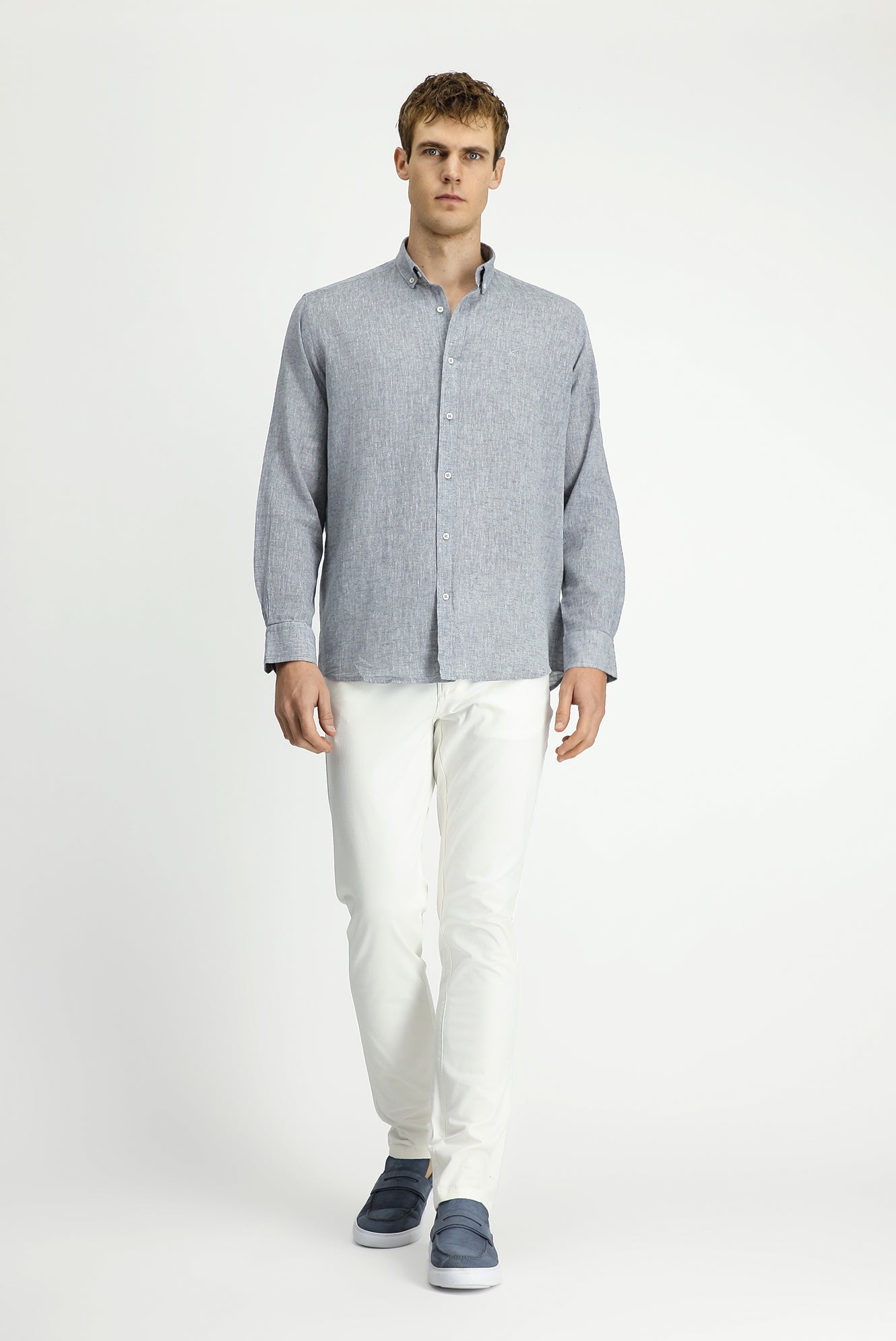 Açık Lacivert Uzun Kol Regular Fit Spor Düğmeli Yaka Pamuklu Keten Şantuk Gömlek