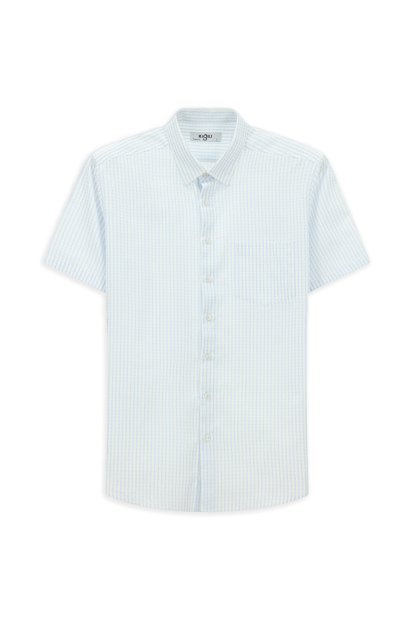 Açık Mavi Kısa Kol Regular Fit Pamuk Çizgili Gömlek