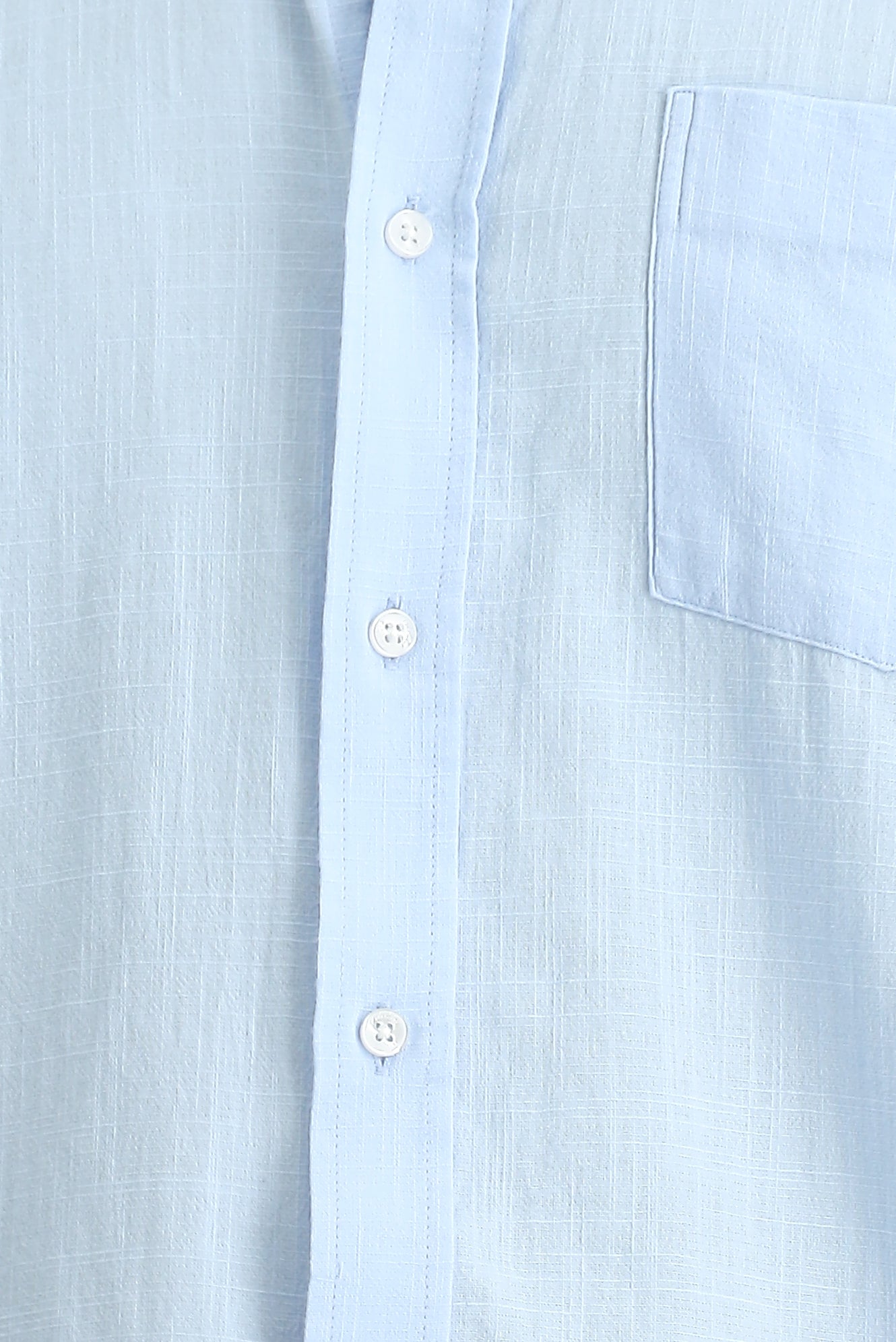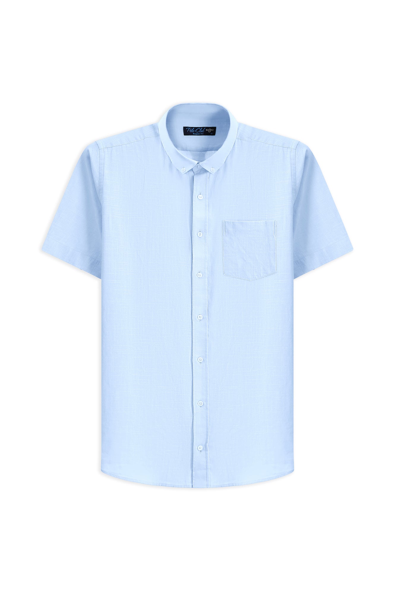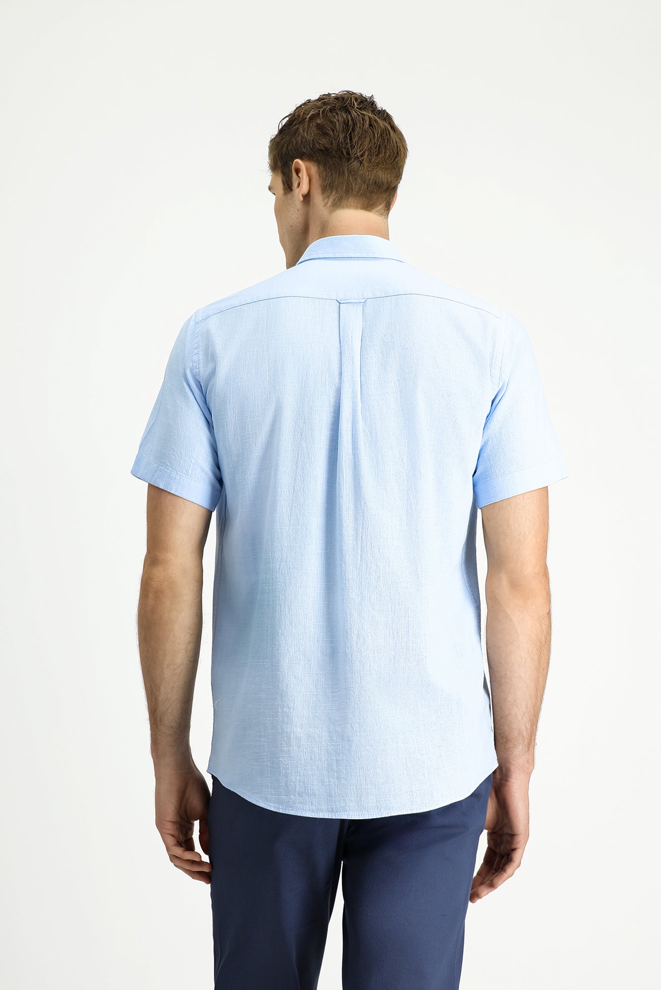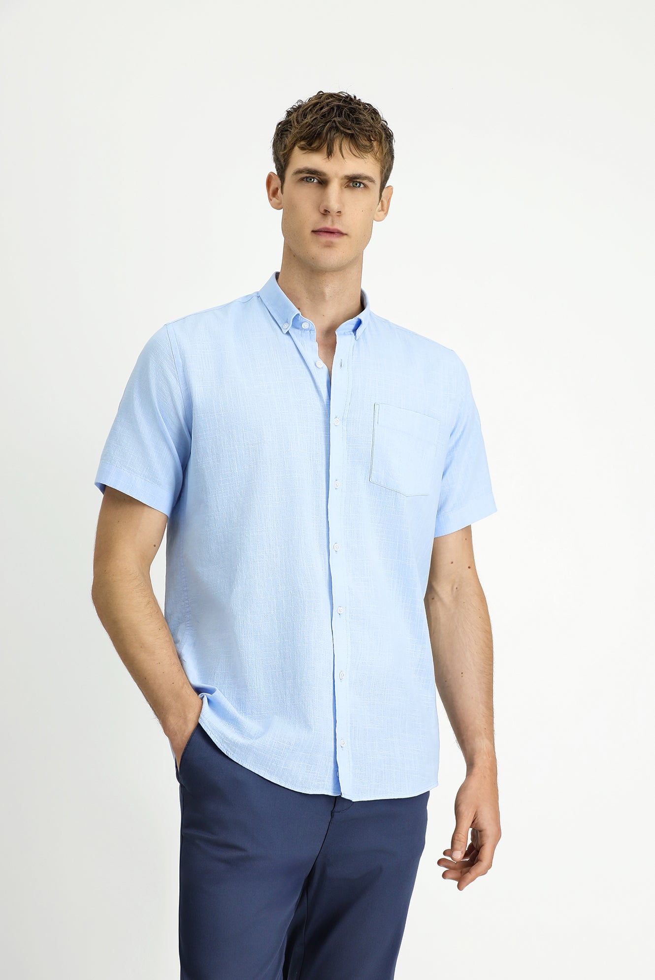 Açık Mavi Kısa Kol Relaxed Fit Düğmeli Yaka Keten Görünümlü Pamuk Spor Gömlek
