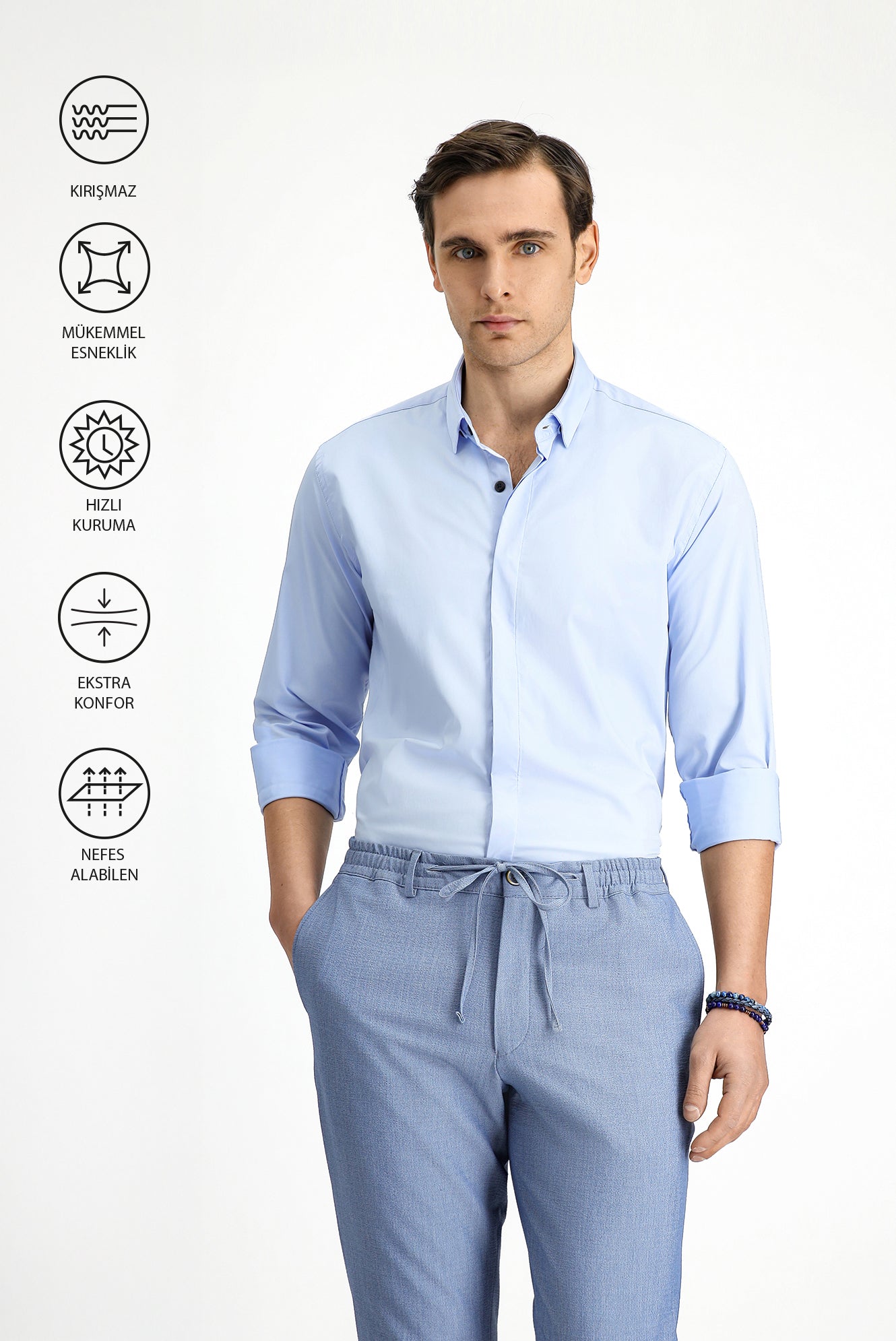 Yoğun tempoda bile kusursuz görünüm ve üst düzey konfor sunan likralı erkek gömlekler, Kiğılı Tomorrow Techno Line koleksiyonunun yenilikçi özellikleri ile öne çıkıyor. Kırışmaz yapısı sayesinde gün boyu pürüzsüz bir duruş sergileyen gömlekler, esnek yapıları ile hareket özgürlüğü sağlıyor. Hızlı kuruyan ve nefes alabilen dokuları ile her koşulda ferah bir kullanım sunuyor. Modern tasarımı ve işlevselliği ile dolabınıza fark yaratan bir gömlek istiyorsanız Tomorrow Techno Line koleksiyonunu ziyaret edebilirsiniz.Aksesuarlar ürüne dahil değildir.
