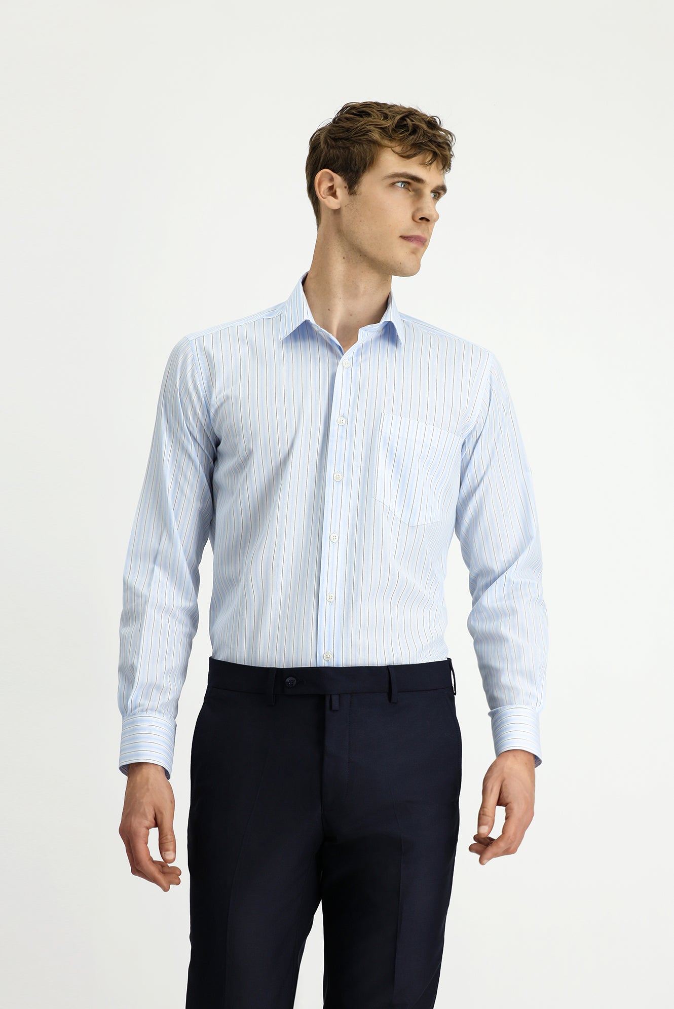 Açık Mavi Uzun Kol Kasik Çizgili Pamuk Gömlek
