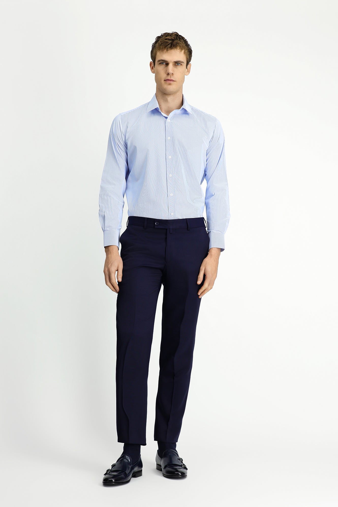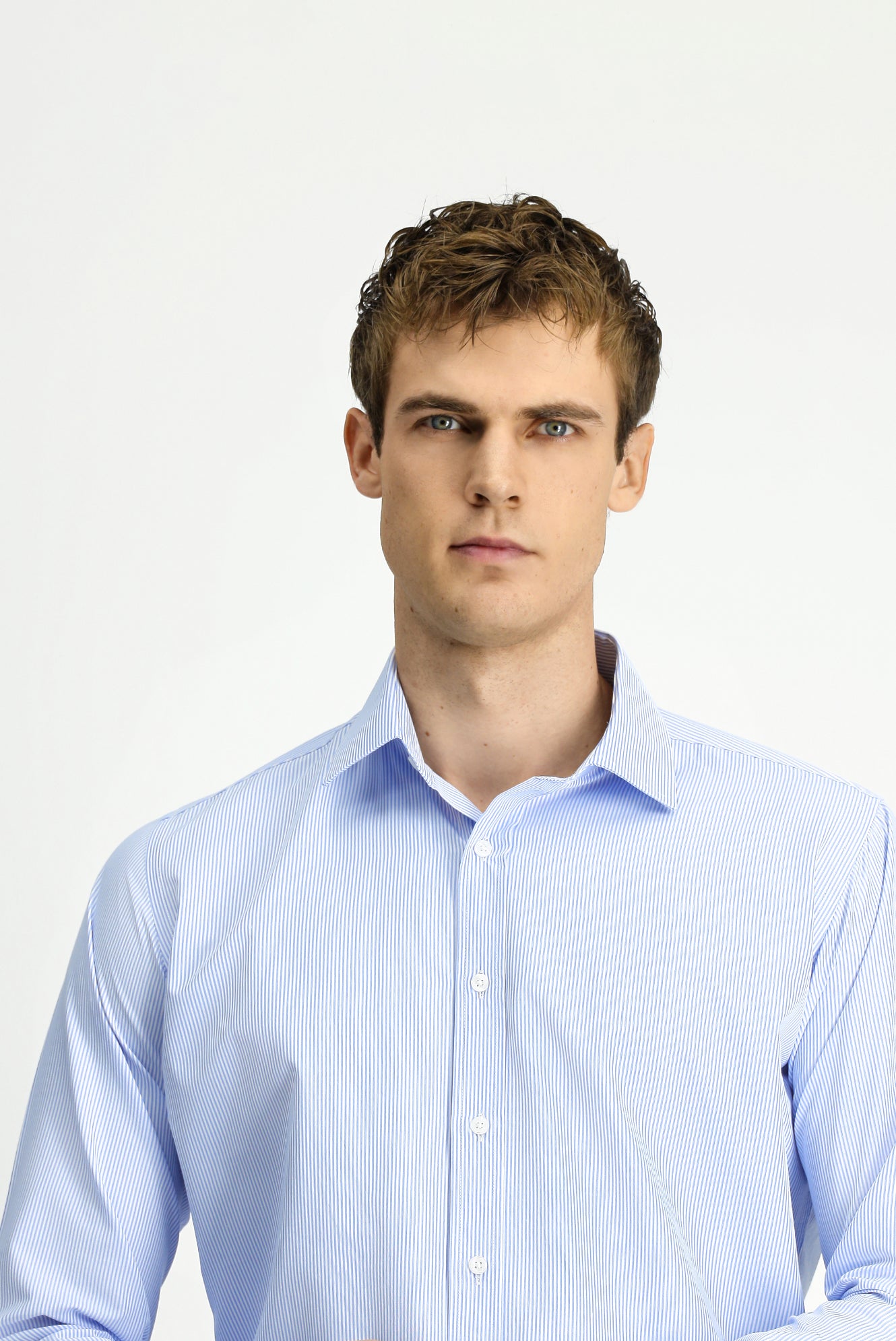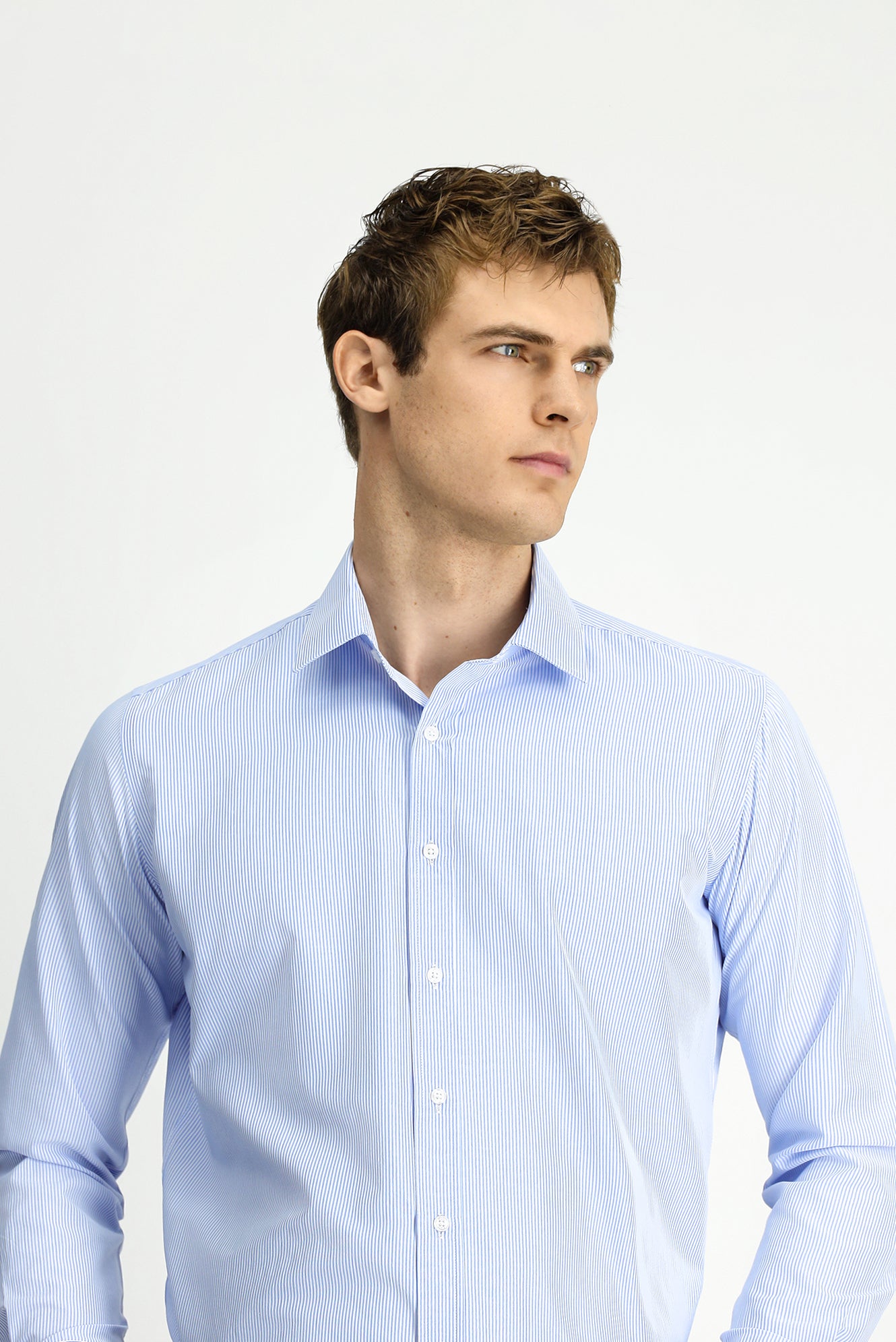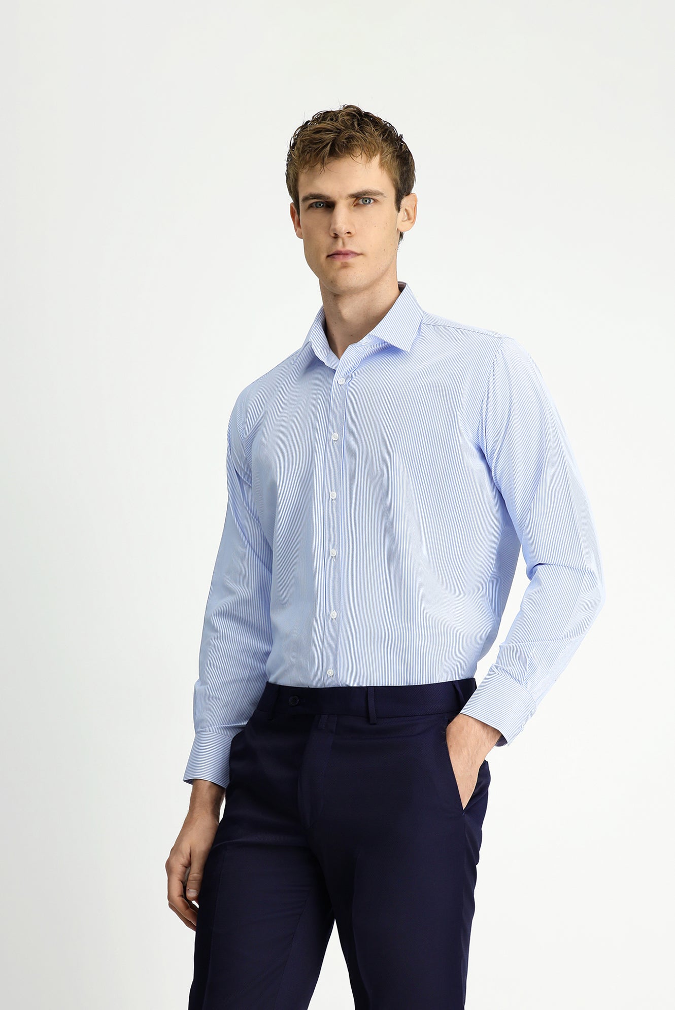 Açık Mavi Uzun Kol Klasik Çizgili Pamuklu Kolay Ütülenebilir Gömlek