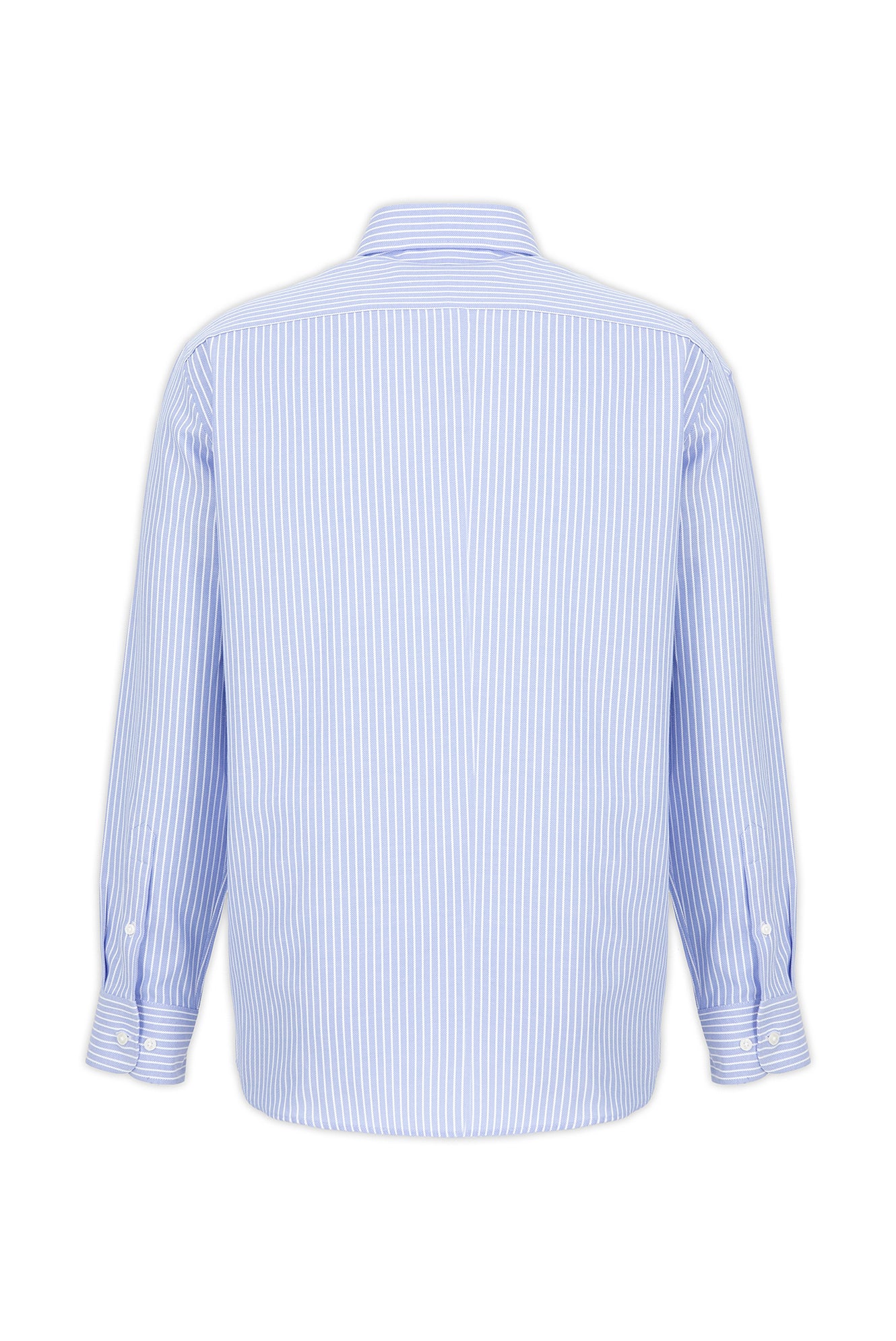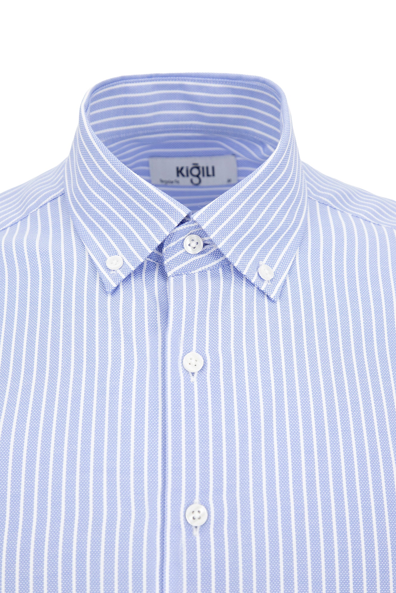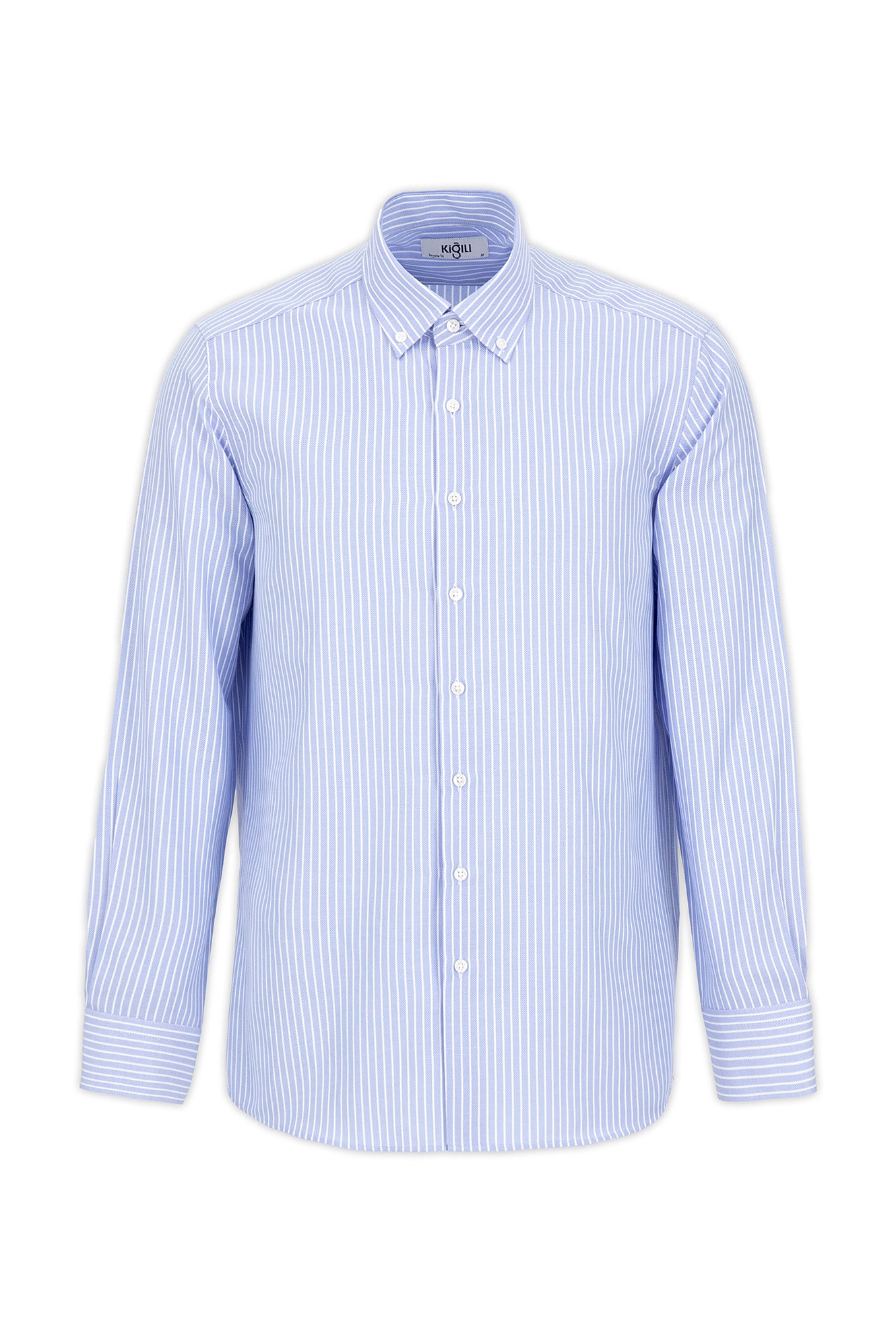 Açık Mavi Uzun Kol Regular Fit Çizgili Düğmeli Yaka Pamuklu Kolay Ütülenebilir Gömlek