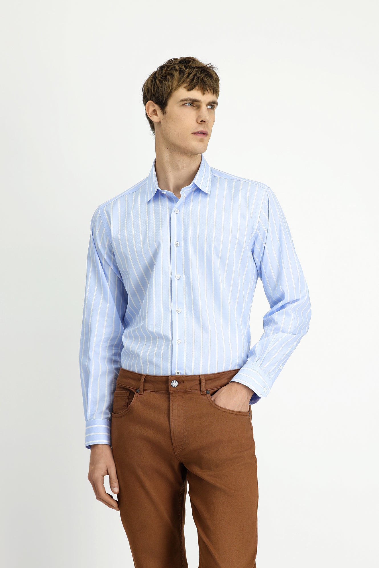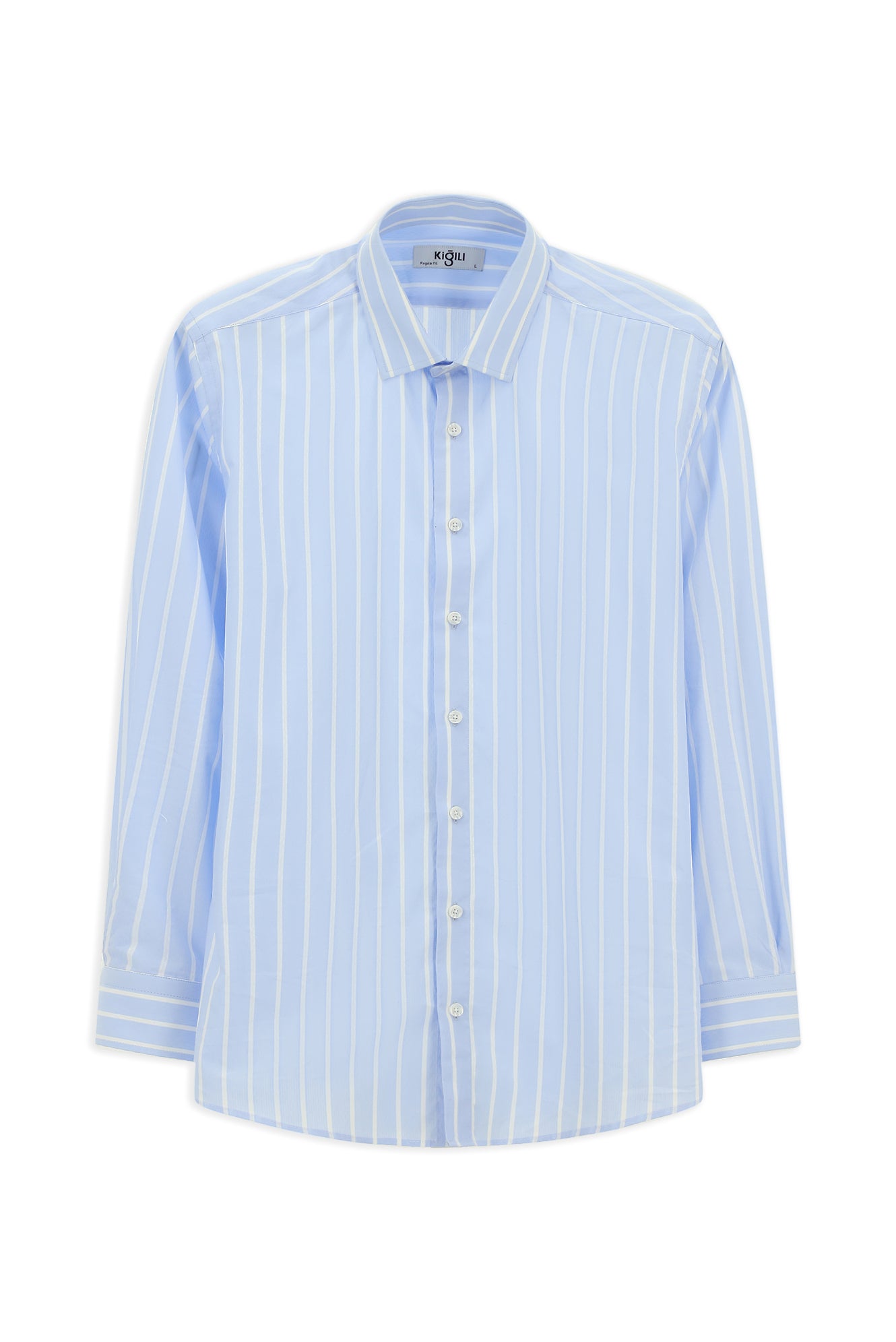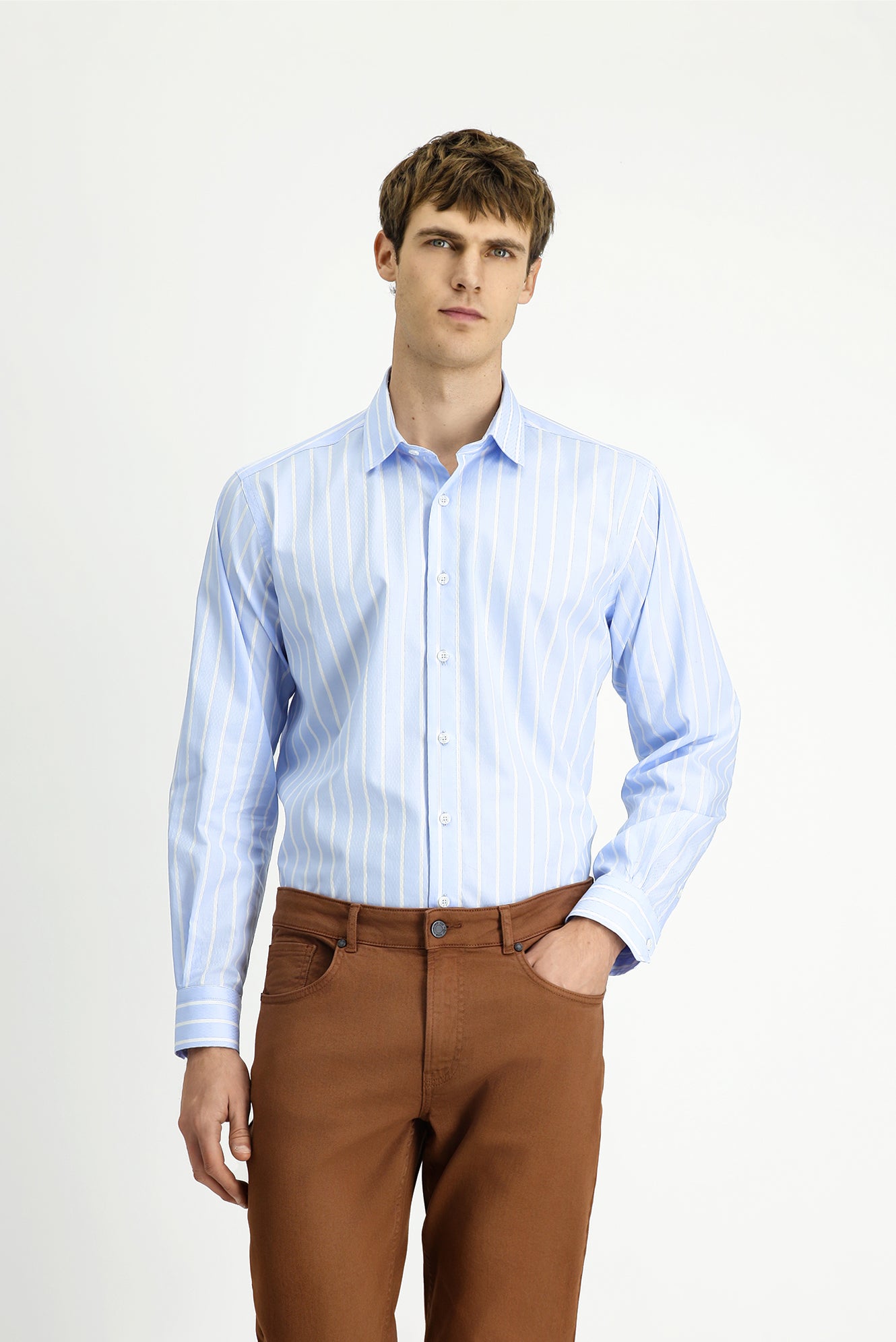 Açık Mavi Uzun Kol Klasik Çizgili Pamuk Gömlek