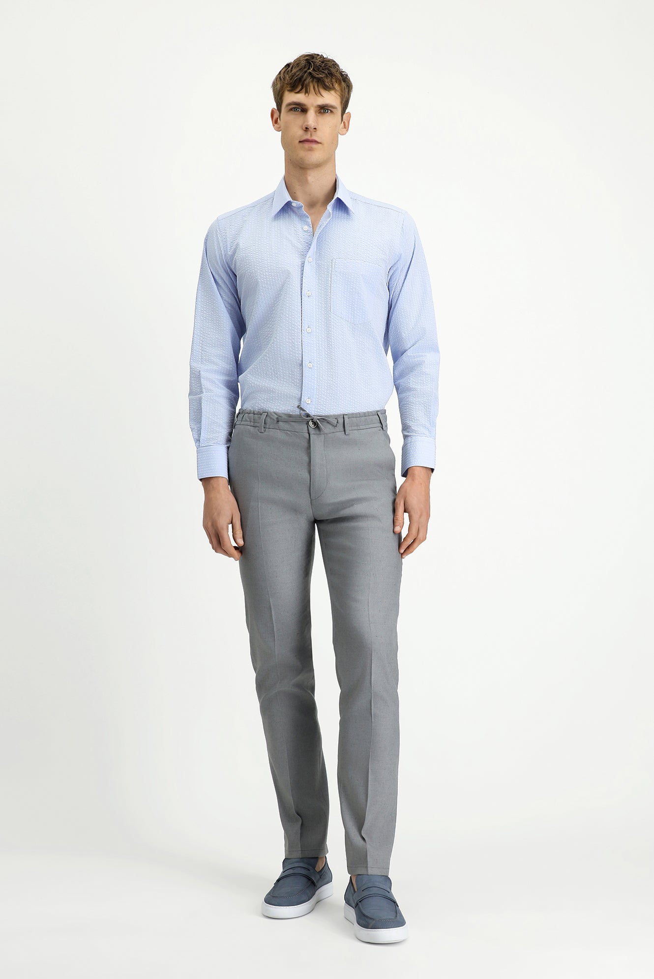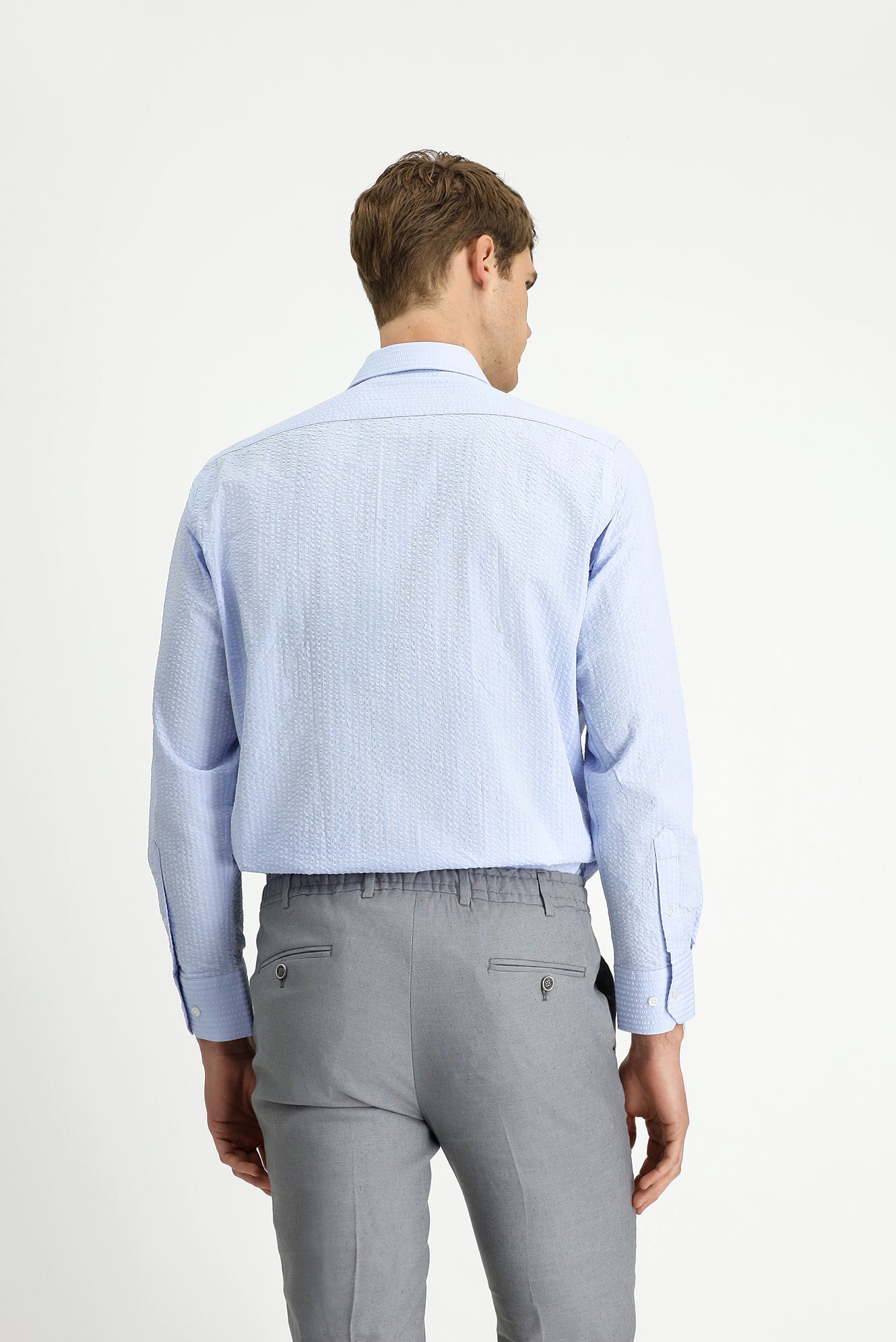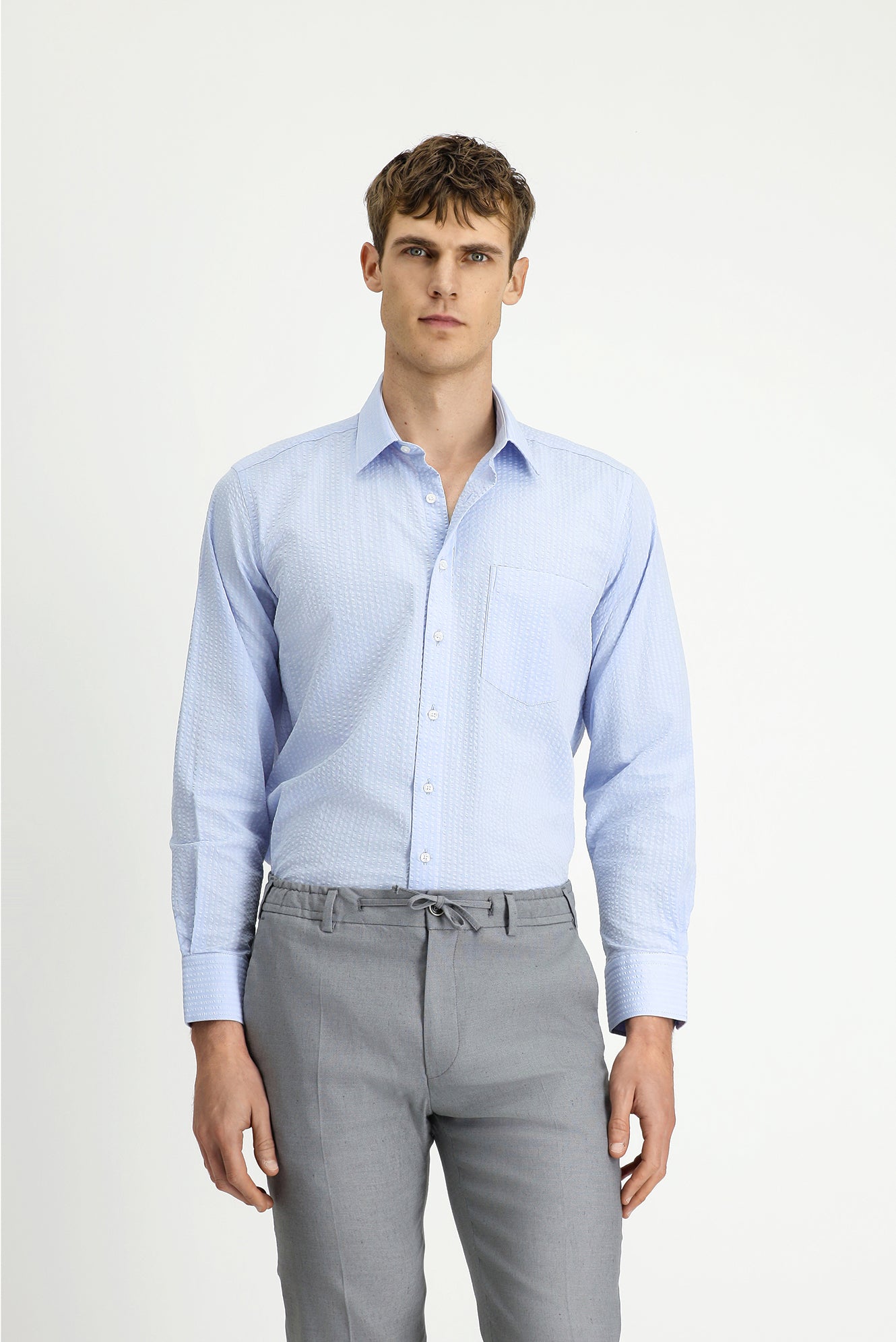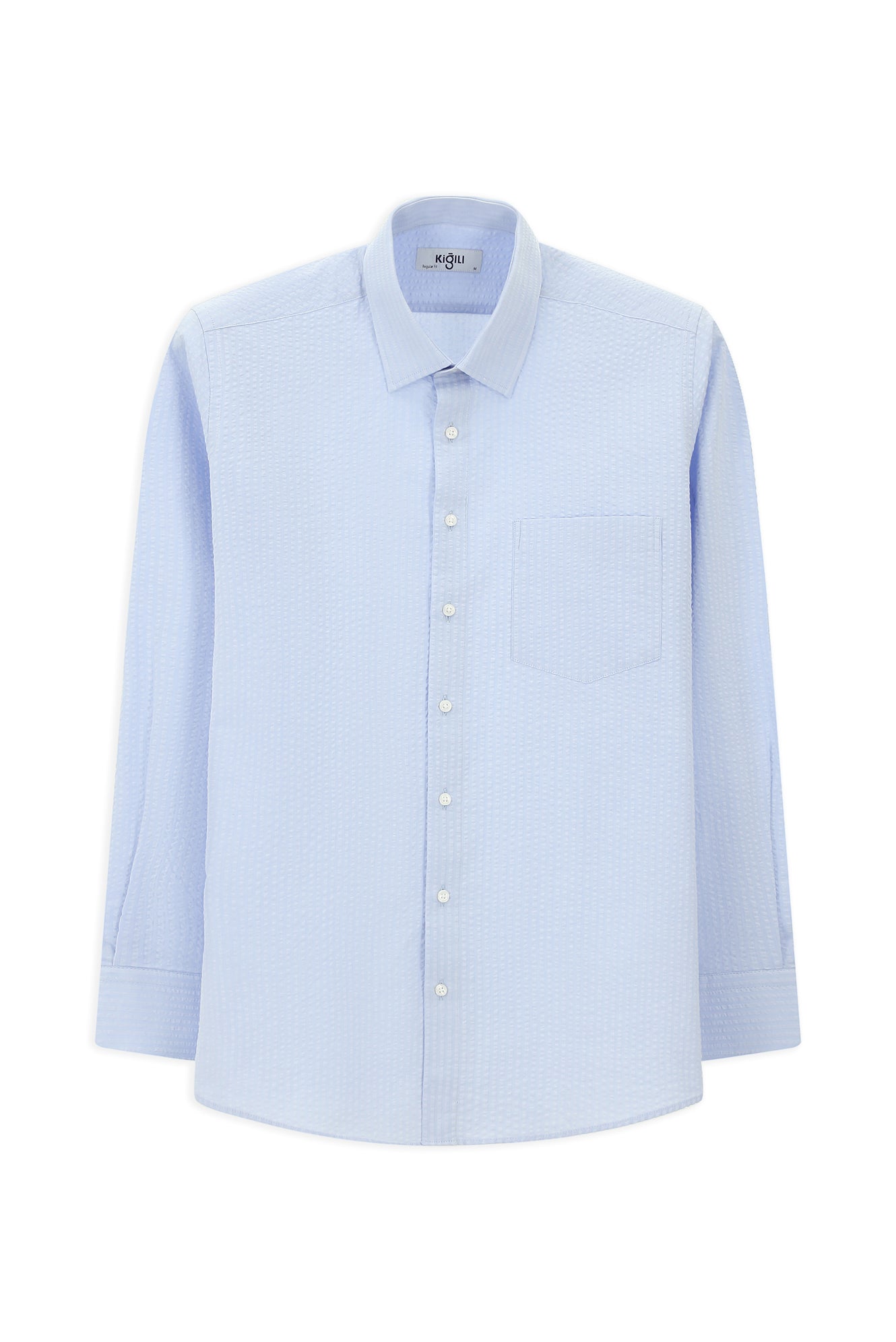 Açık Mavi Uzun Kol Regular Fit Pamuk Çizgili Gofre Gömlek