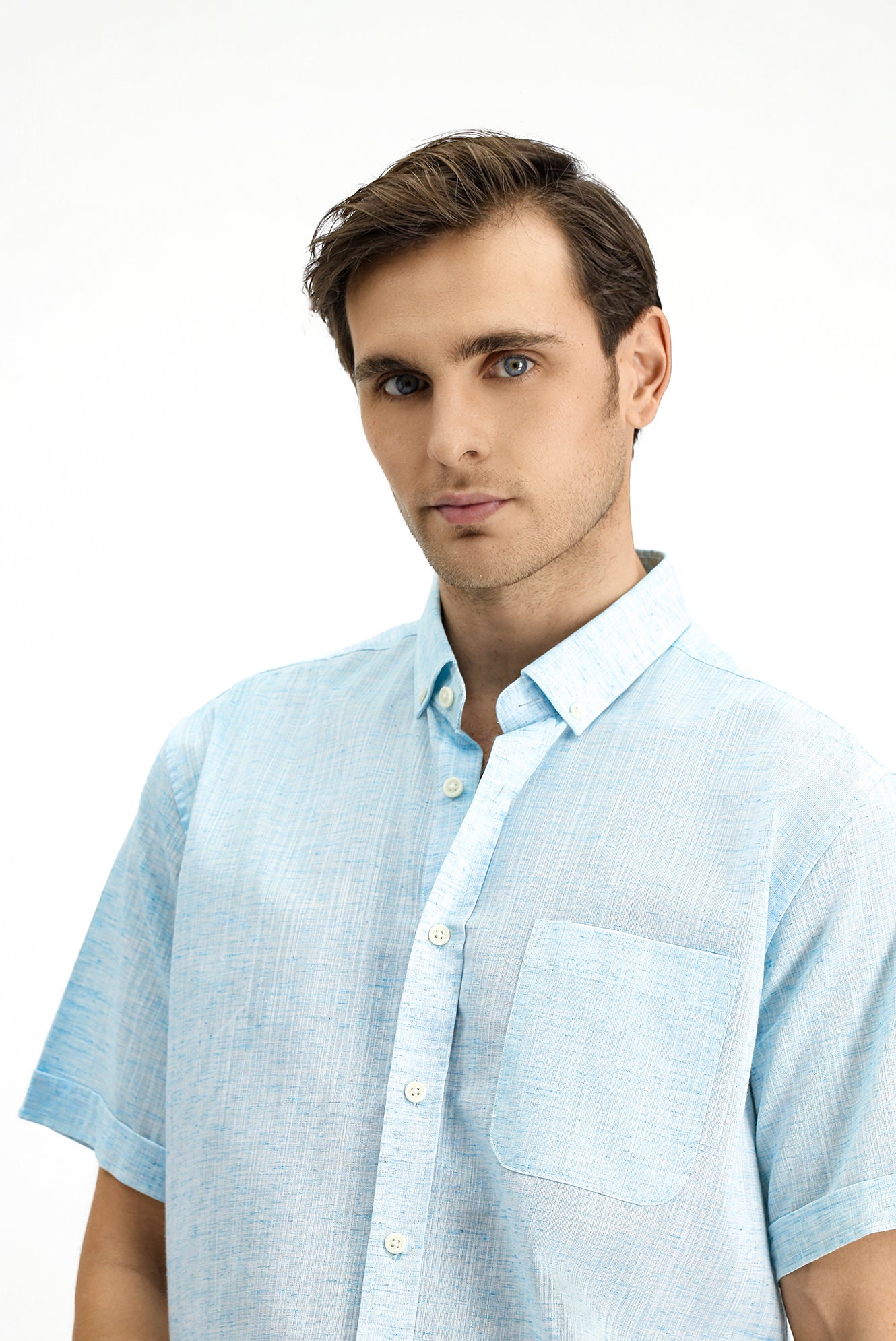 Açık Turkuaz Kısa Kol Regular Fit Düğmeli Yaka Desenli Pamuklu Gömlek