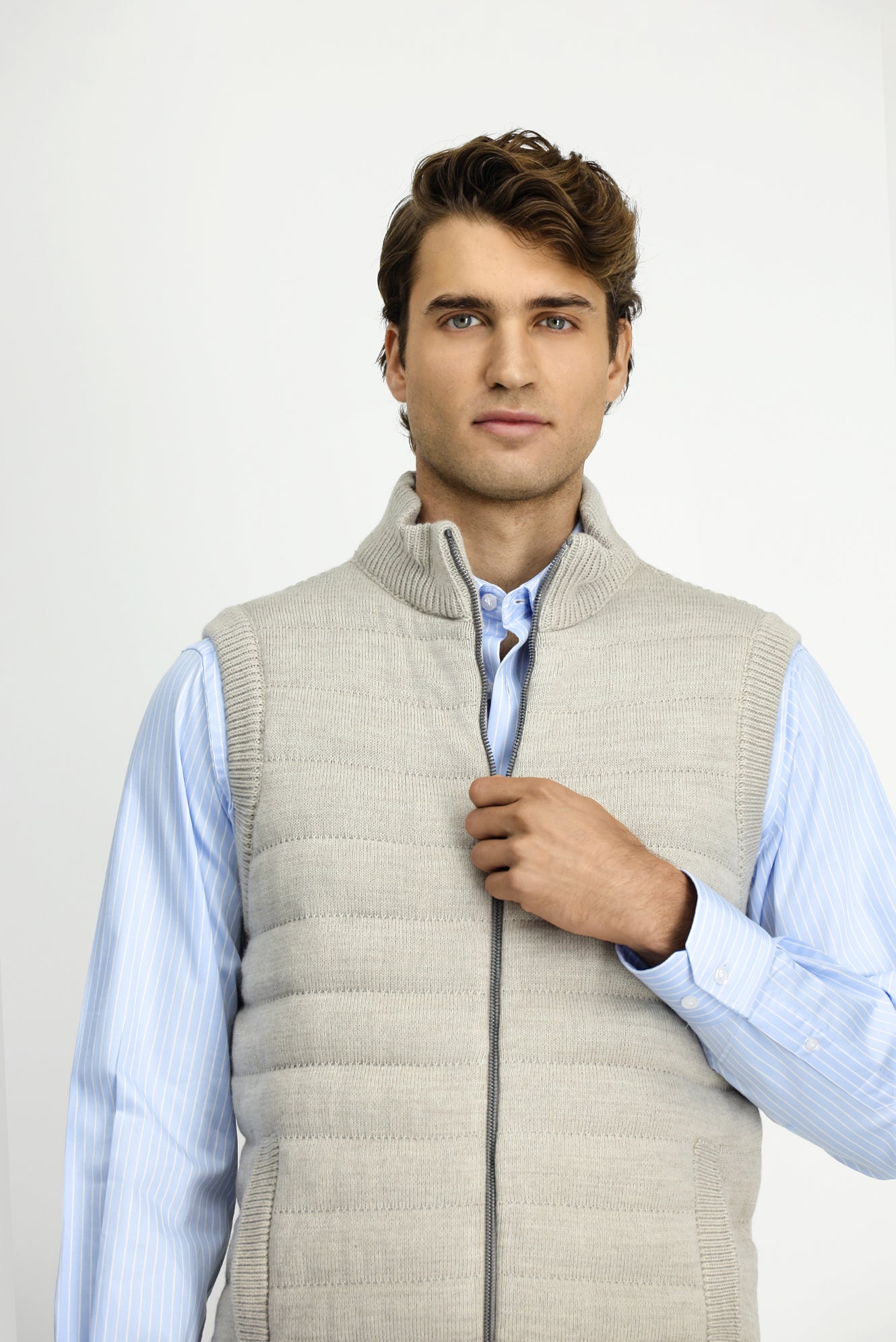 Açık Vizon Desenli Fermuarlı Triko Yelek