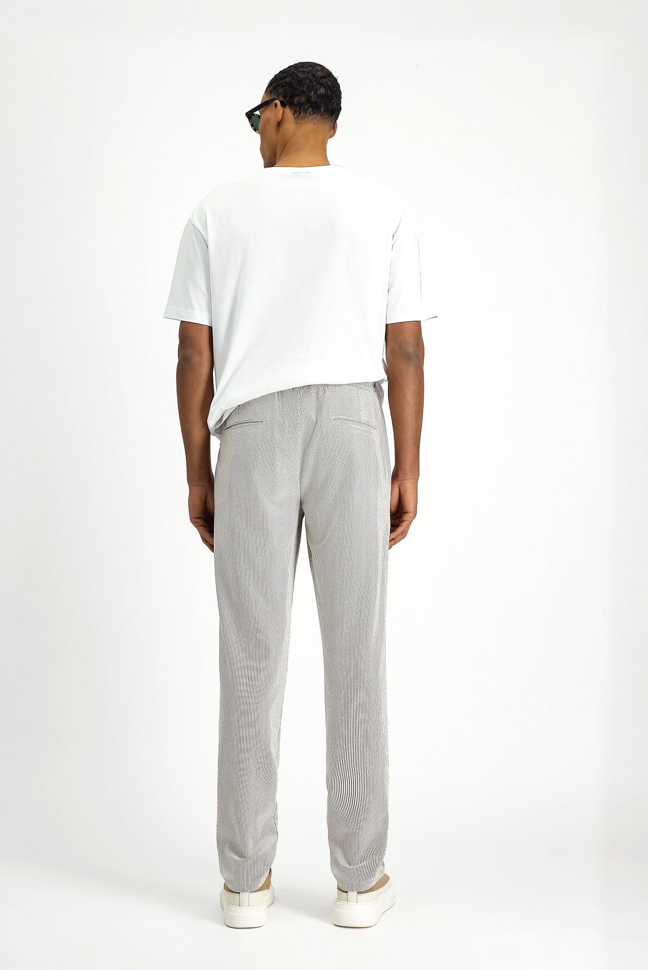 Açık Vizon Regular Fit Likralı Çizgili Beli Lastikli İpli Pileli Klasik Kumaş Pantolon