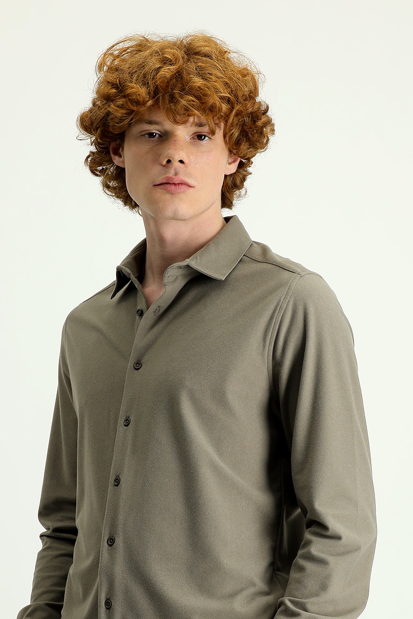 Açık Vizon Techno-Line Uzun Kol Slim Fit Dar Kesim Spor Örme Gömlek