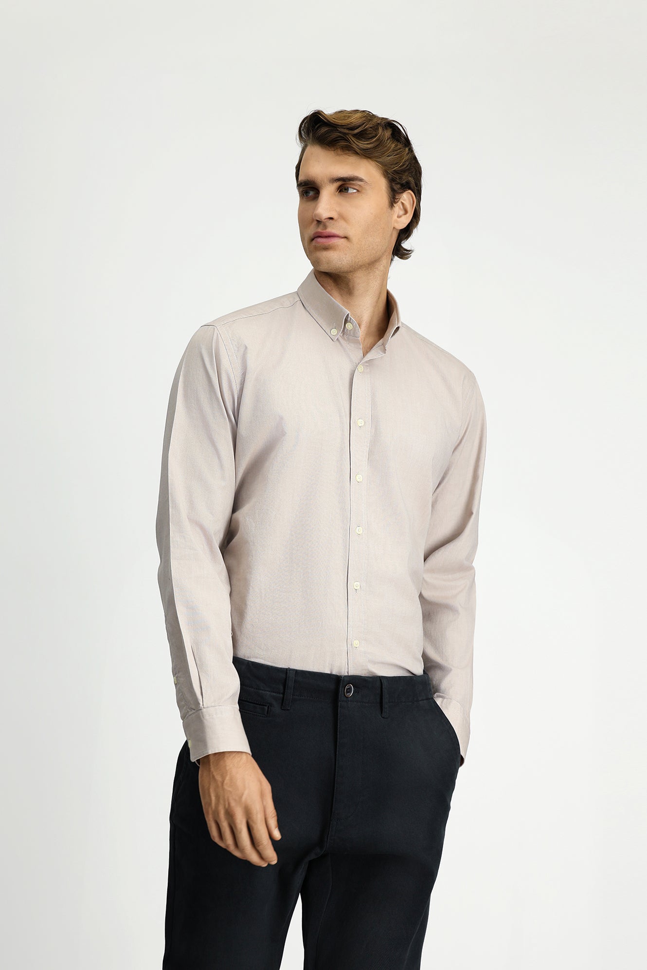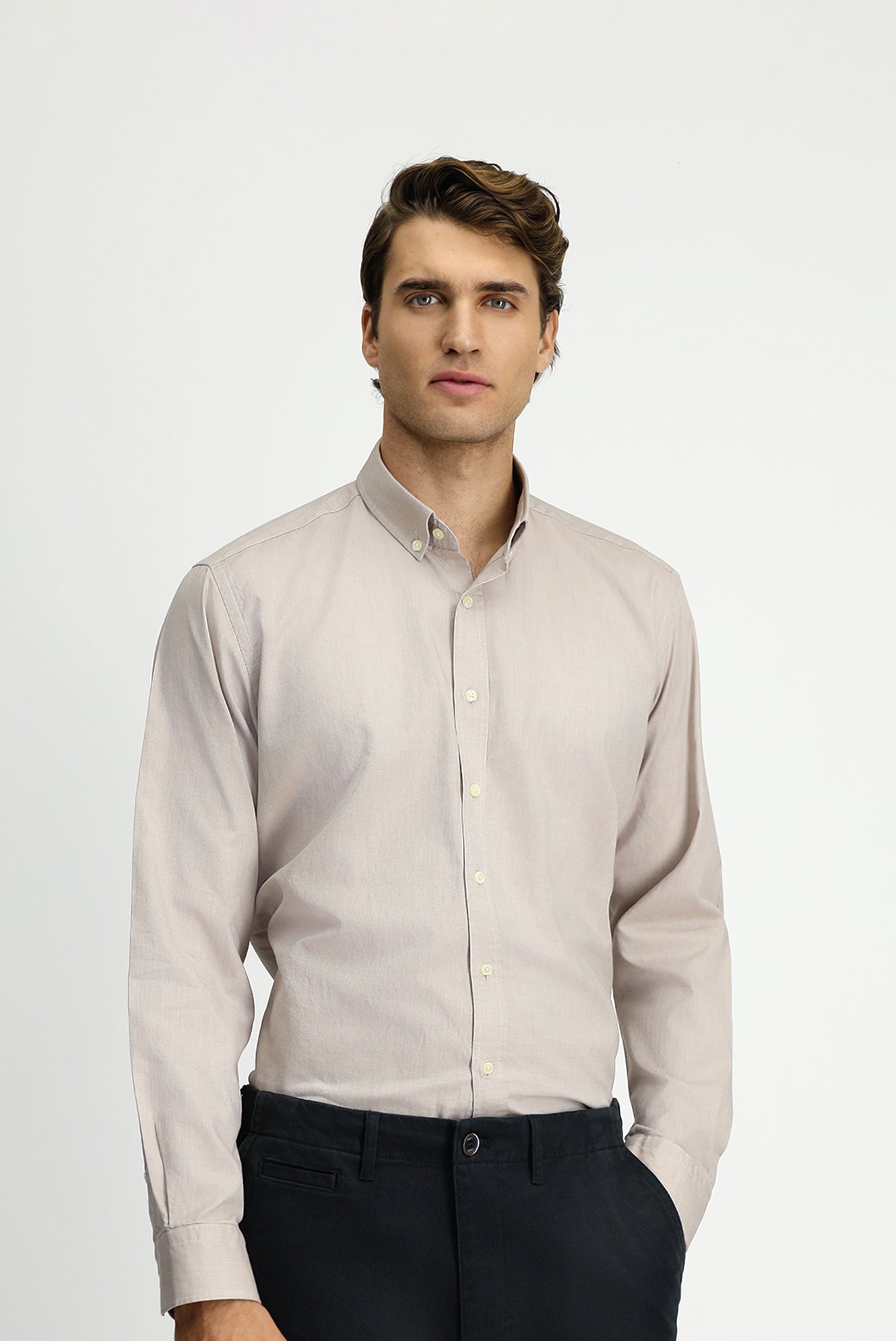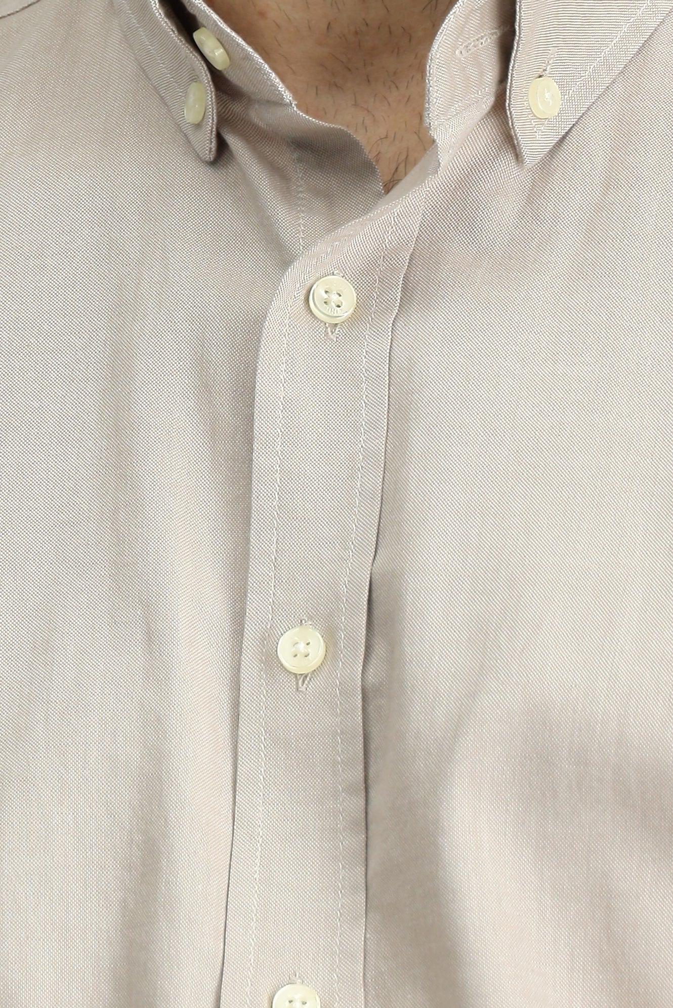 Açık Vizon Uzun Kol Regular Fit Düğmeli Yaka Oxford Pamuk Gömlek