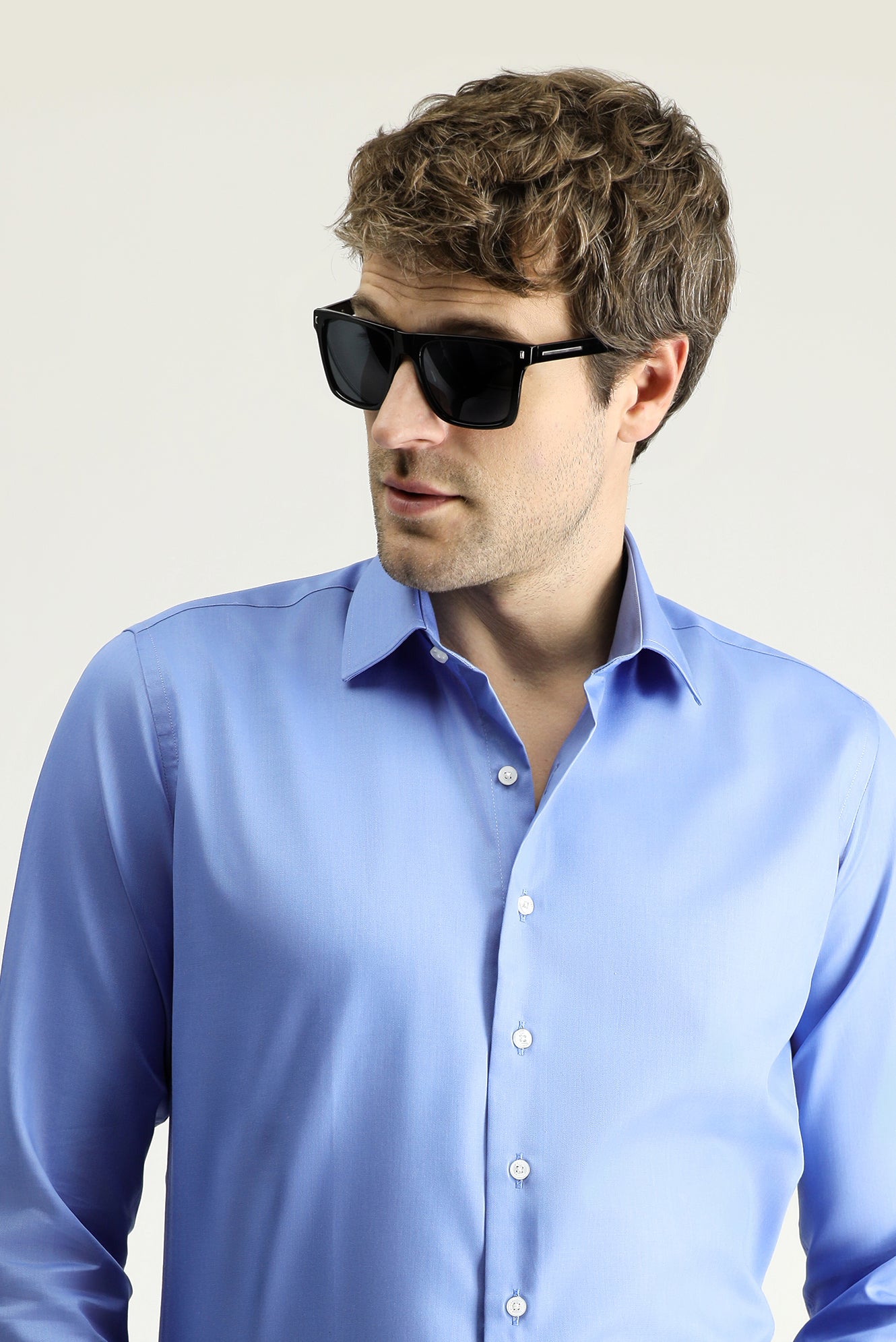 Aqua Mavisi Uzun Kol Slim Fit Dar Kesim Klasik Non Iron Saten Pamuklu Gömlek