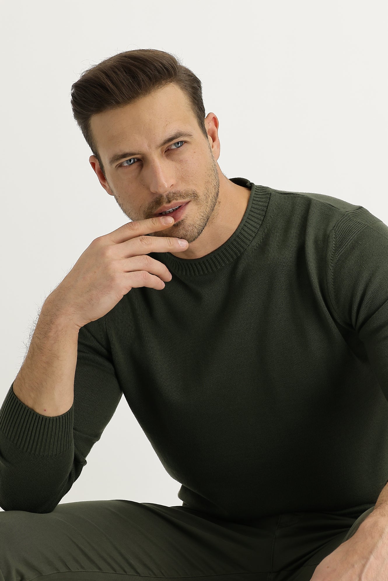 Asker Haki Bisiklet Yaka Slim Fit Dar Kesim Triko Kazak