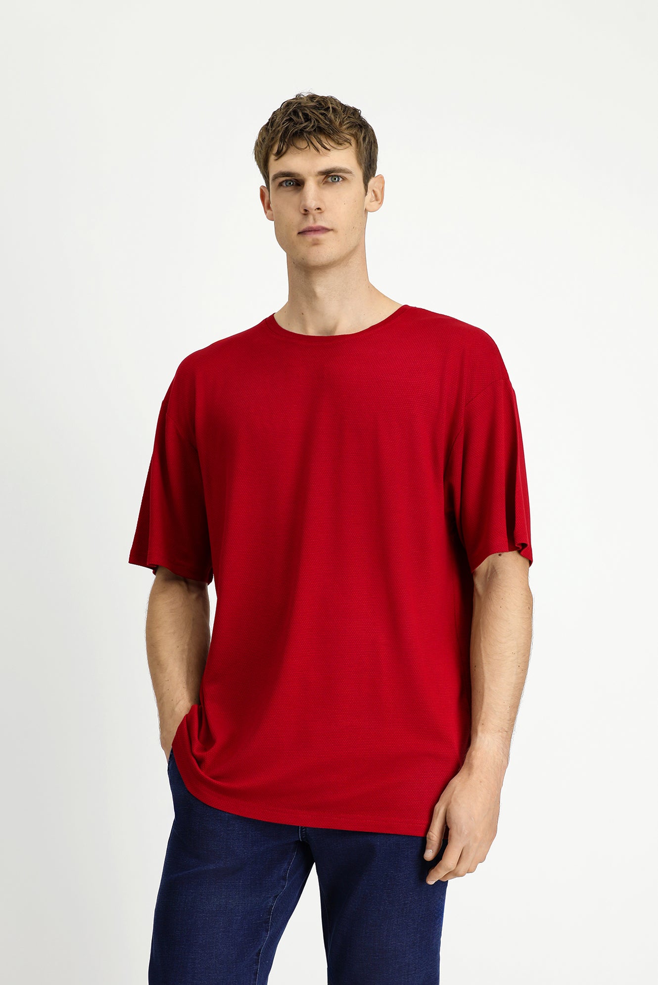 Bayrak Kırmızı Bisiklet Yaka Oversize Desenli Modal Karışımlı Tişört
