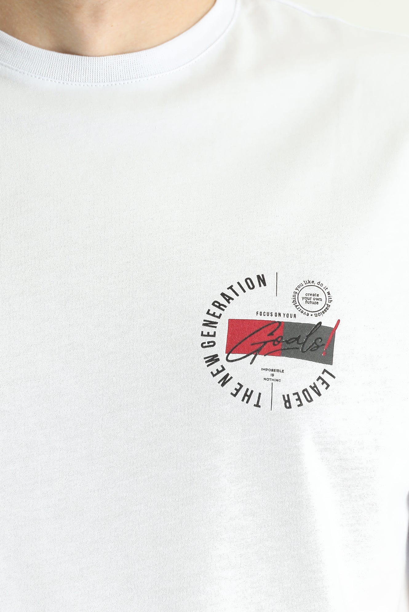 Beyaz Bisiklet Yaka Regular Fit Baskılı Süprem Pamuk Tişört