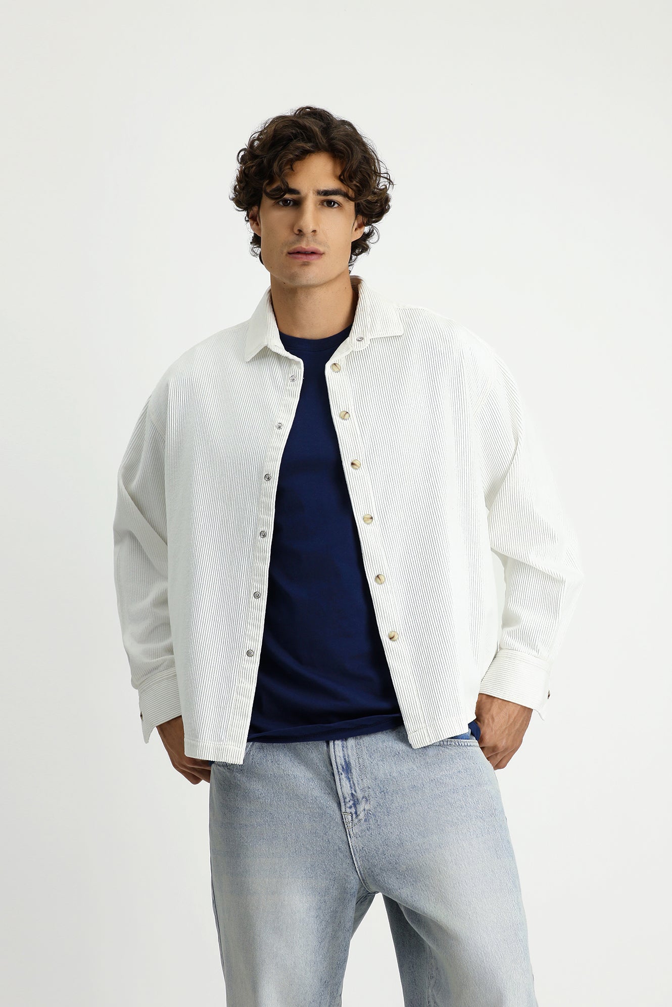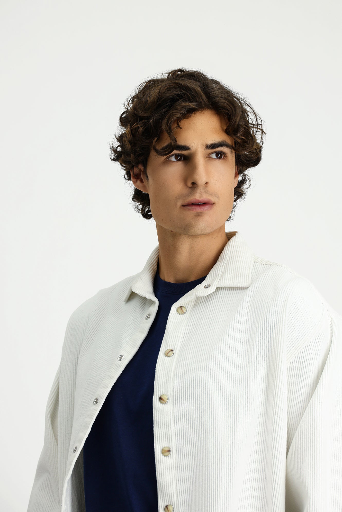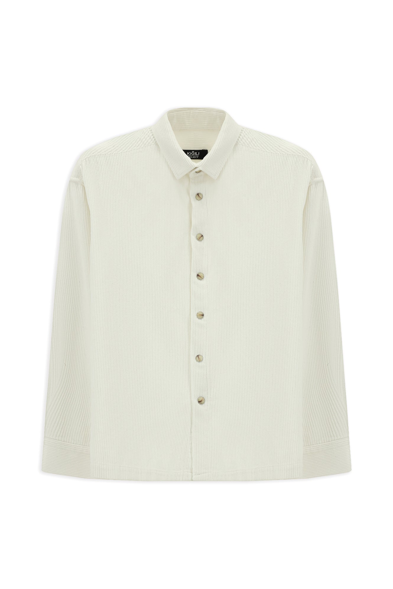 Beyaz Uzun Kol Oversize Ekstra Rahat Kesim Pamuk Spor Kadife Gömlek