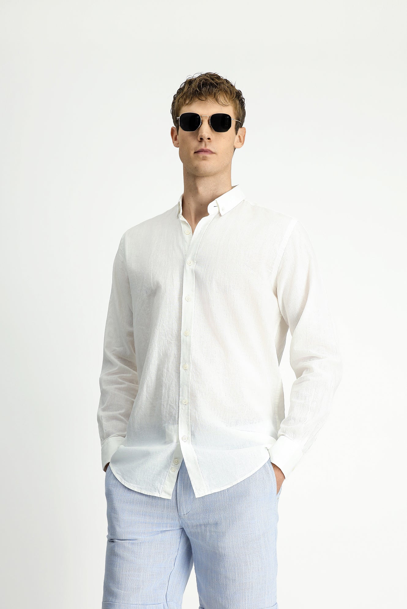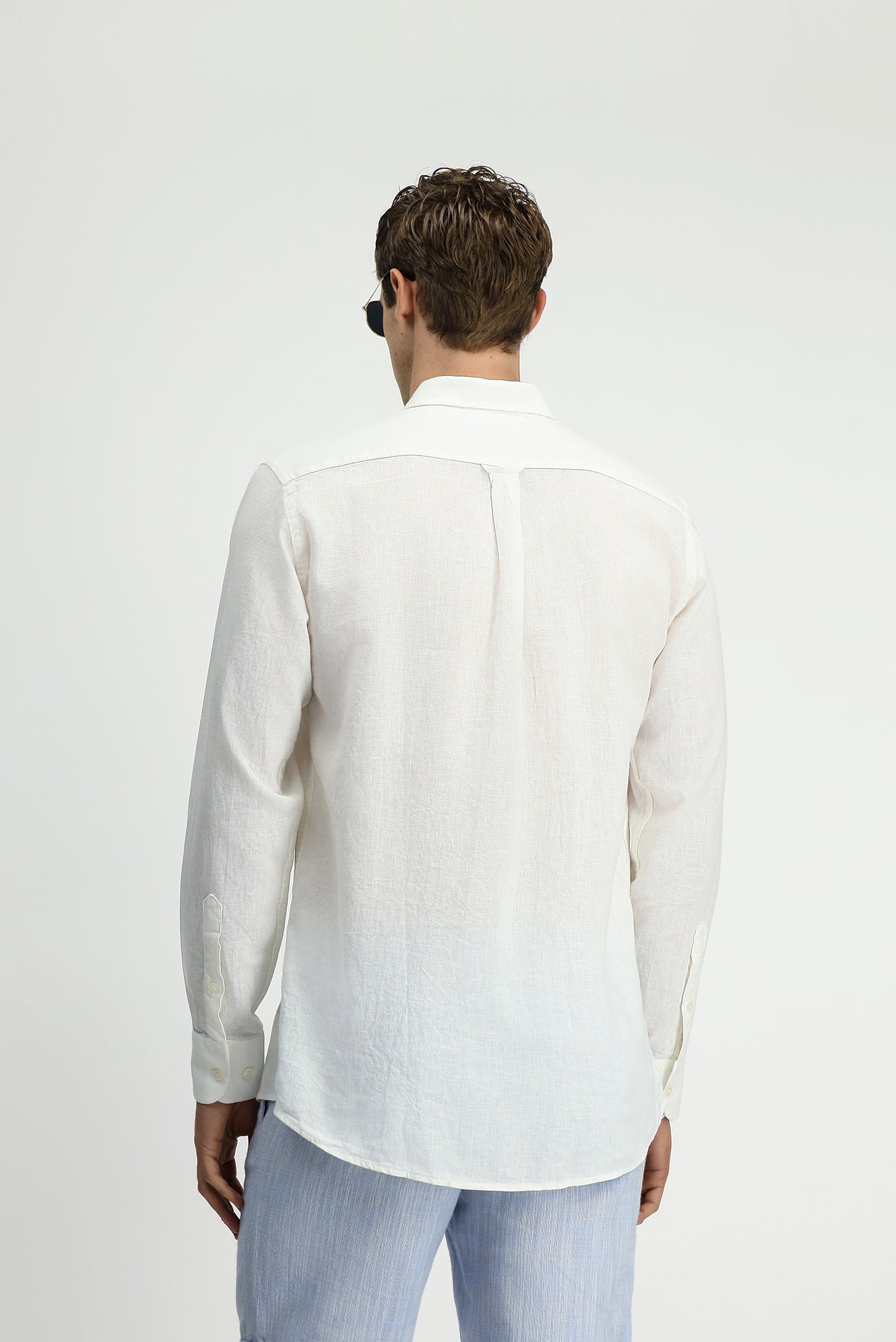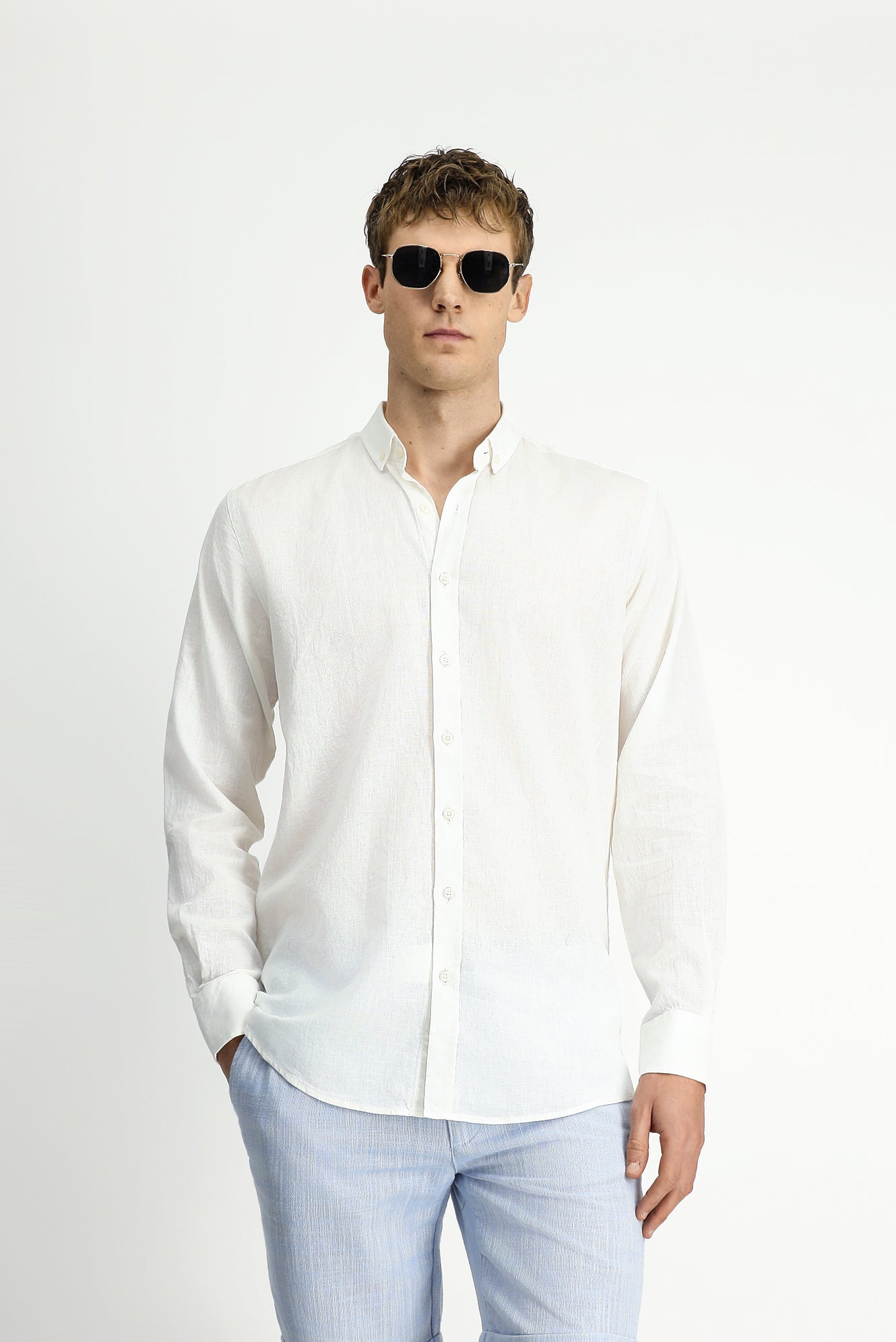 Beyaz Uzun Kol Regular Fit Düğmeli Yaka Pamuklu Keten Gömlek