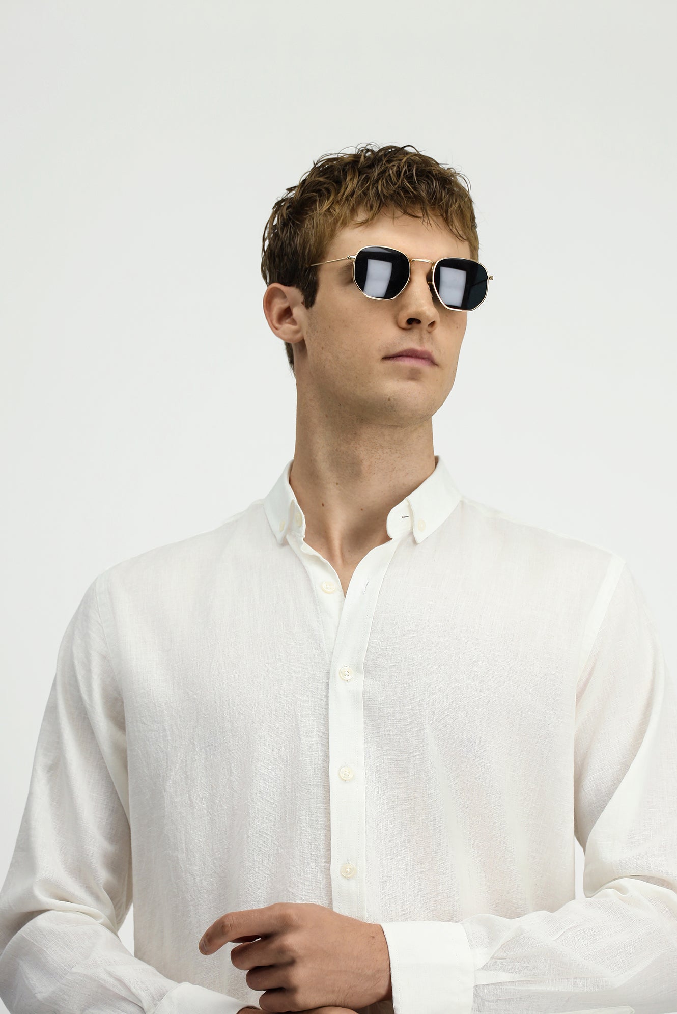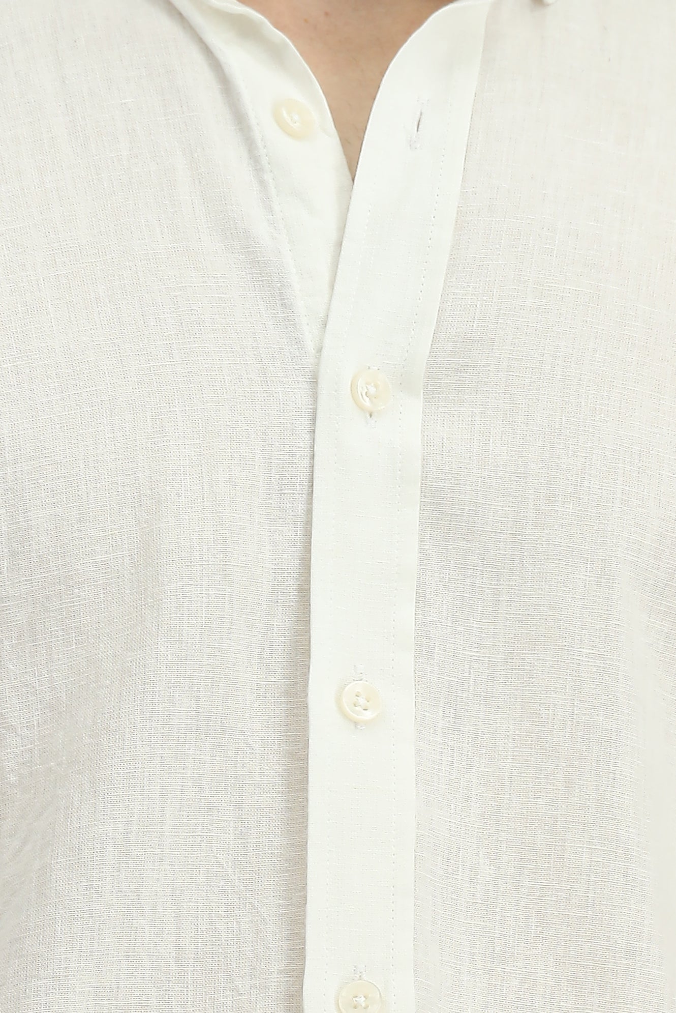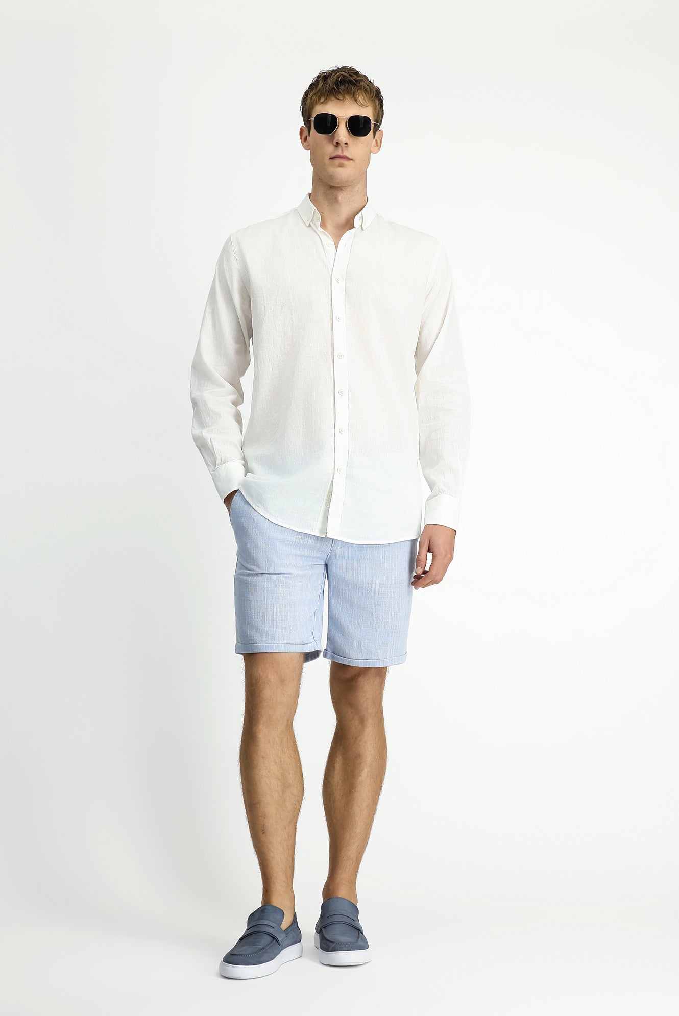 Beyaz Uzun Kol Regular Fit Düğmeli Yaka Pamuklu Keten Gömlek
