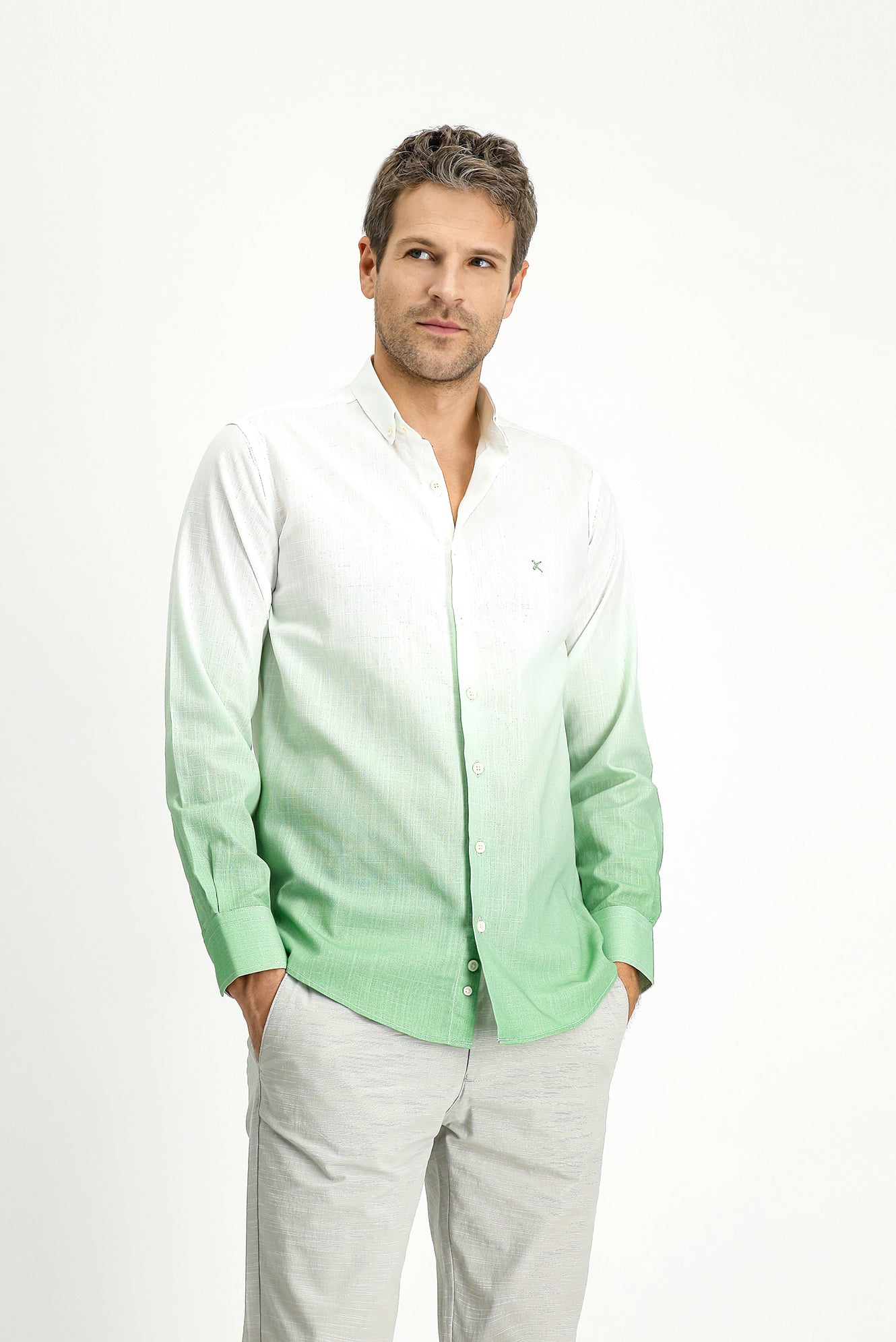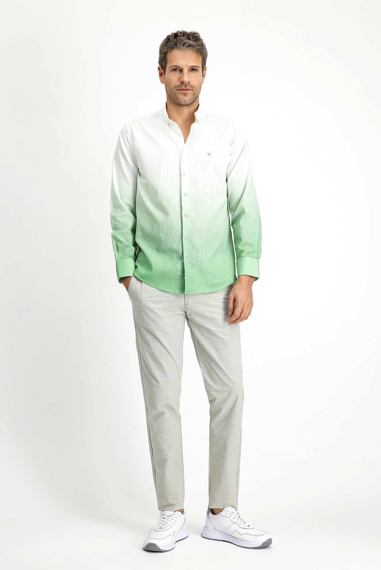 Çağla Yeşili Uzun Kol Regular Fit Spor Desenli Düğmeli Yaka Keten Görünümlü Pamuk Gömlek