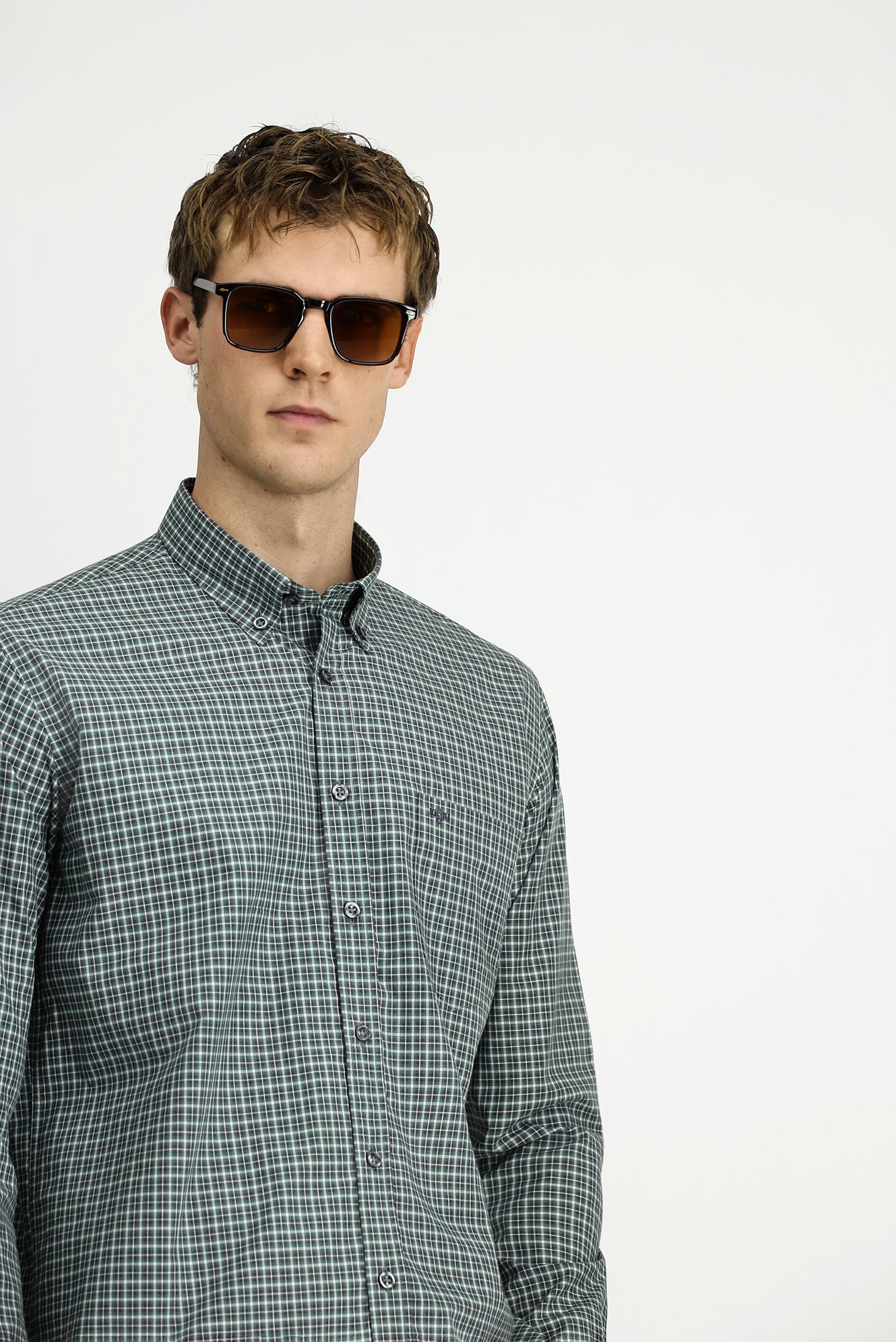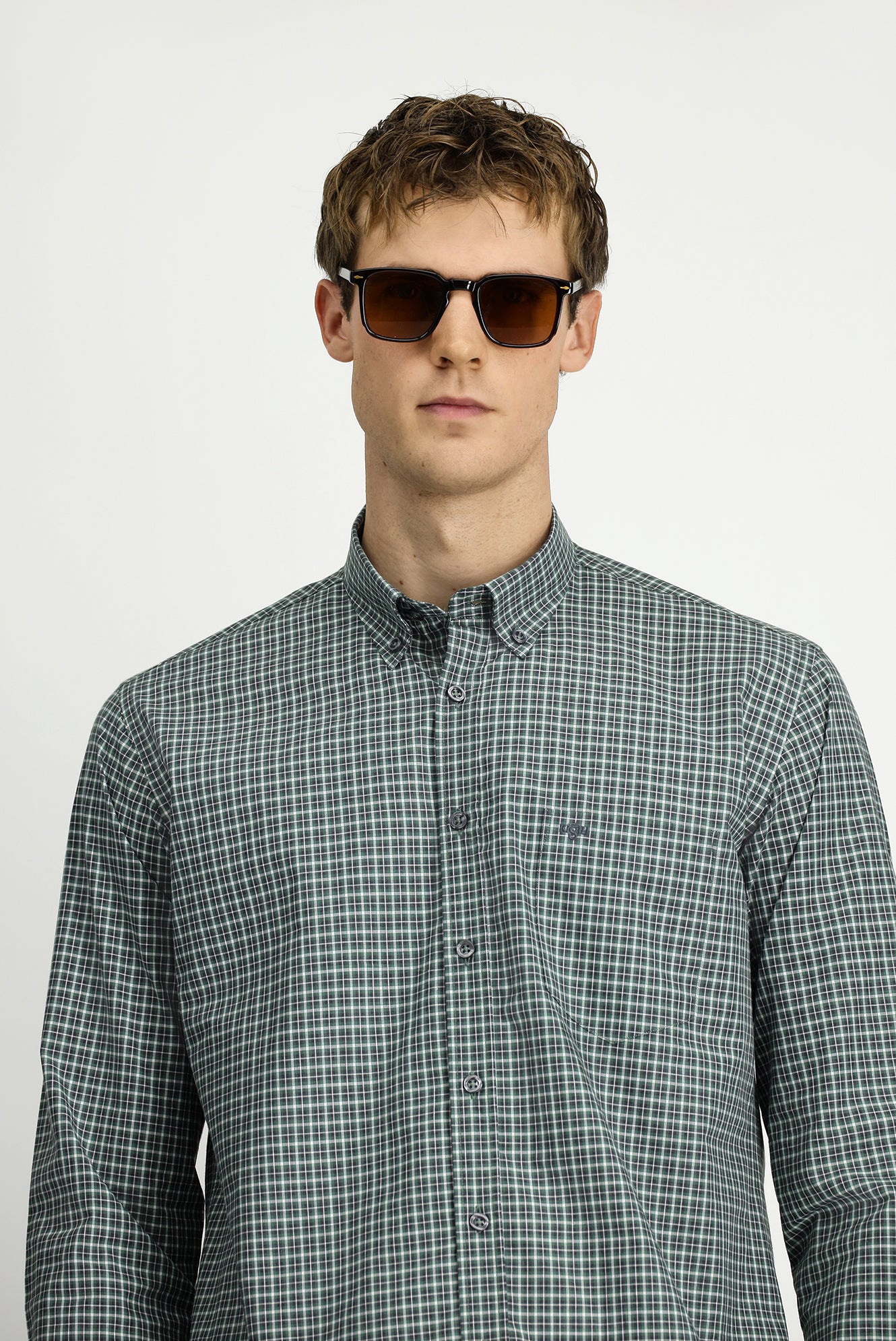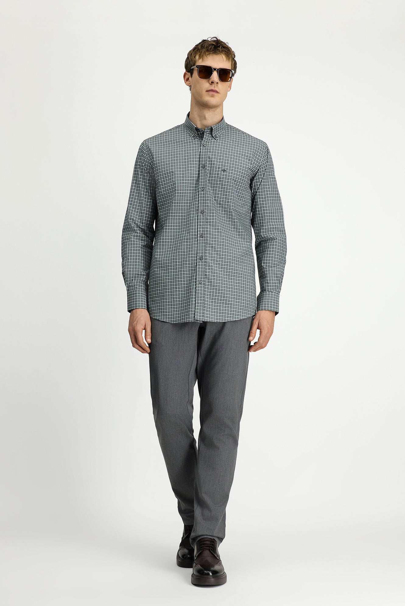 Çimen Yeşili Uzun Kol Regular Fit Ekose Düğmeli Yaka Cepli Pamuk Gömlek