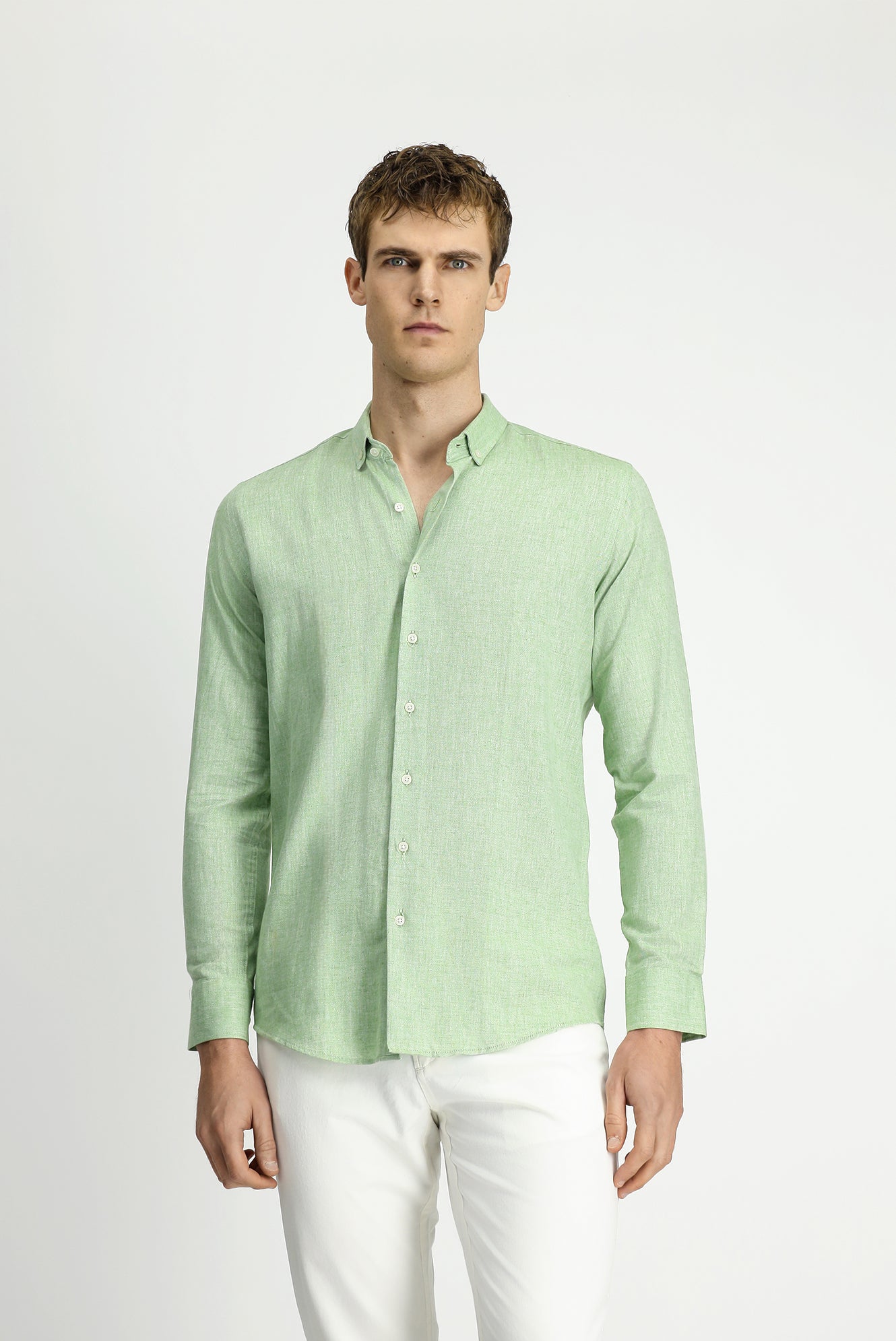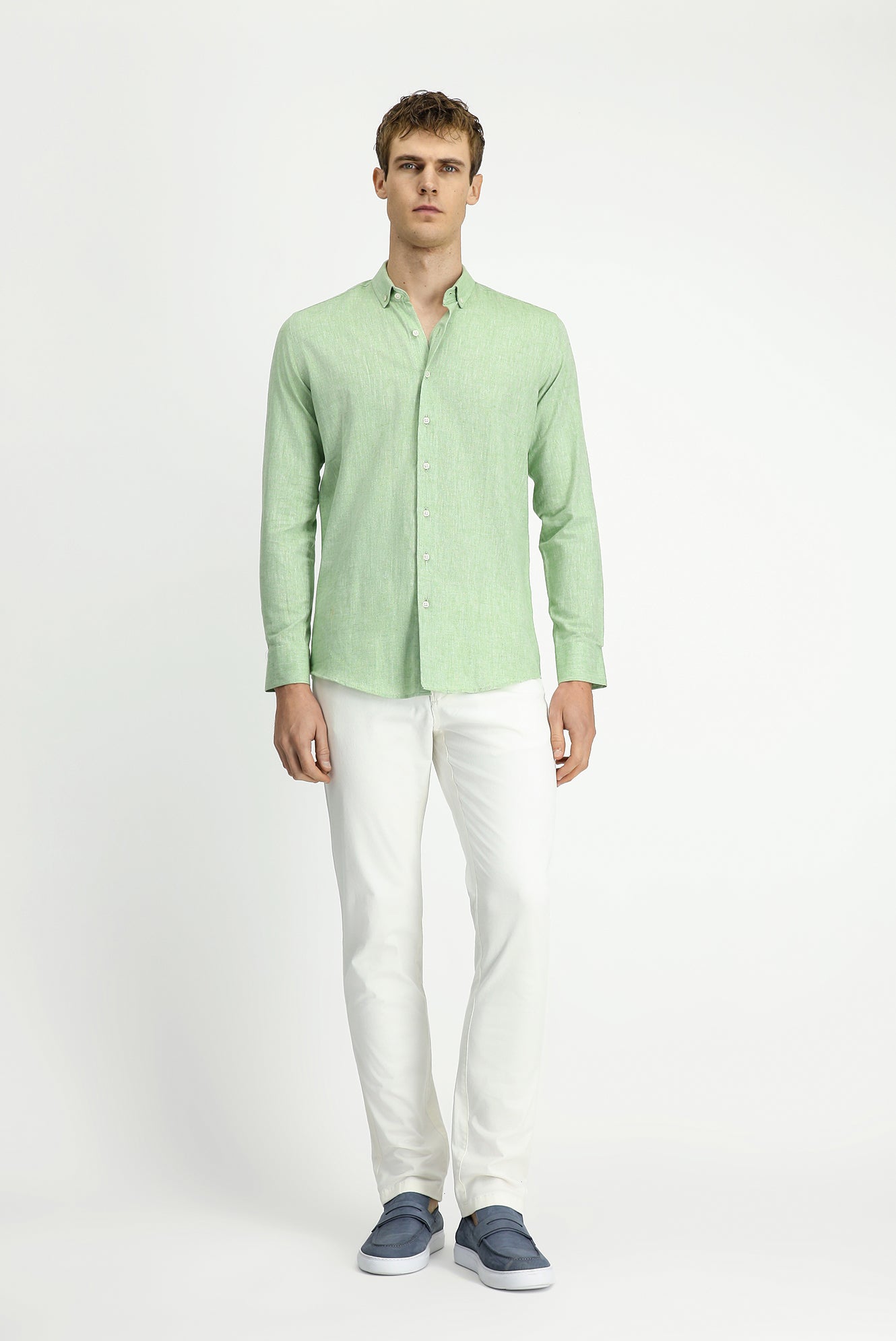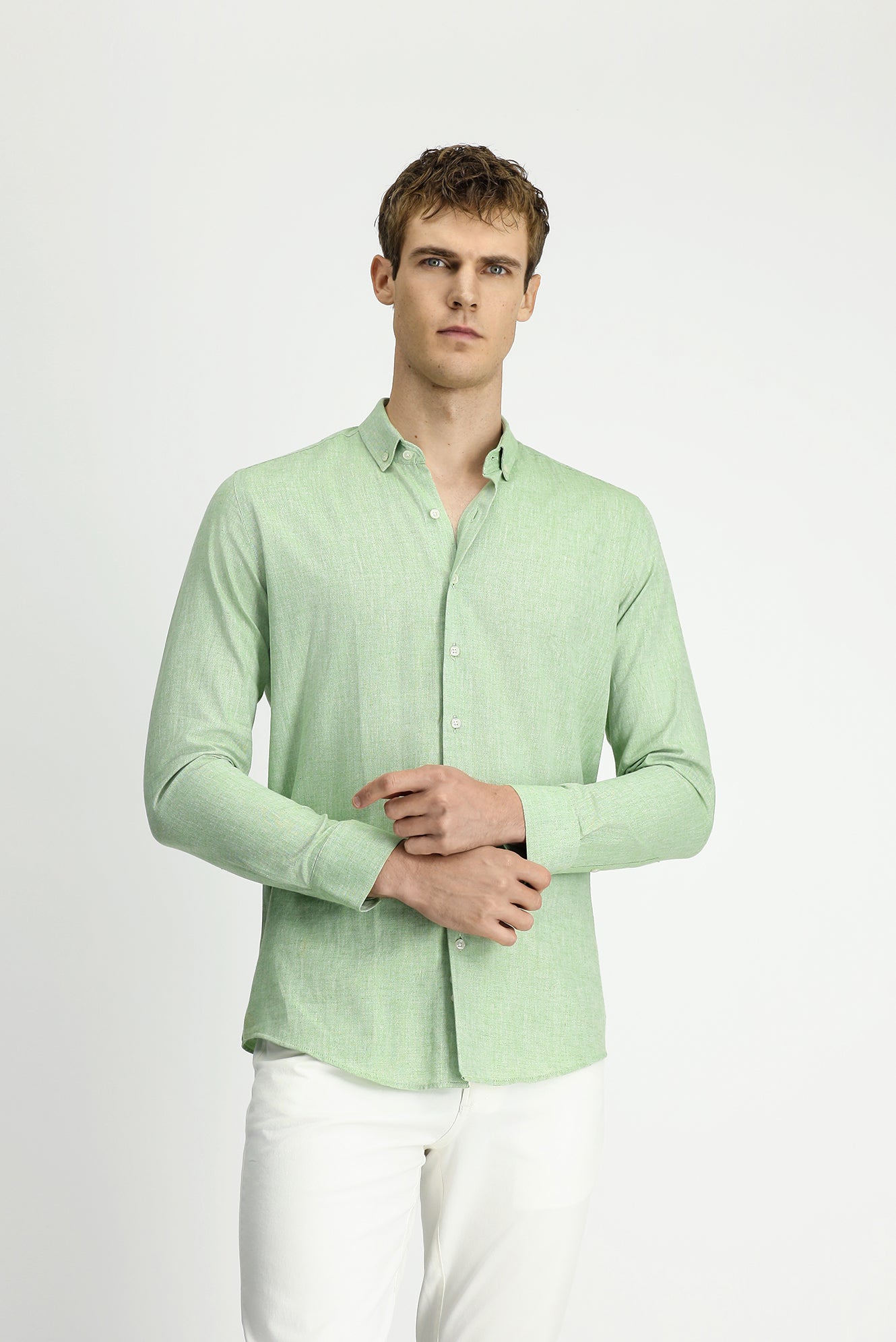 Çimen Yeşili Uzun Kol Slim Fit Dar Kesim Pamuklu Keten Düğmeli Yaka Gömlek