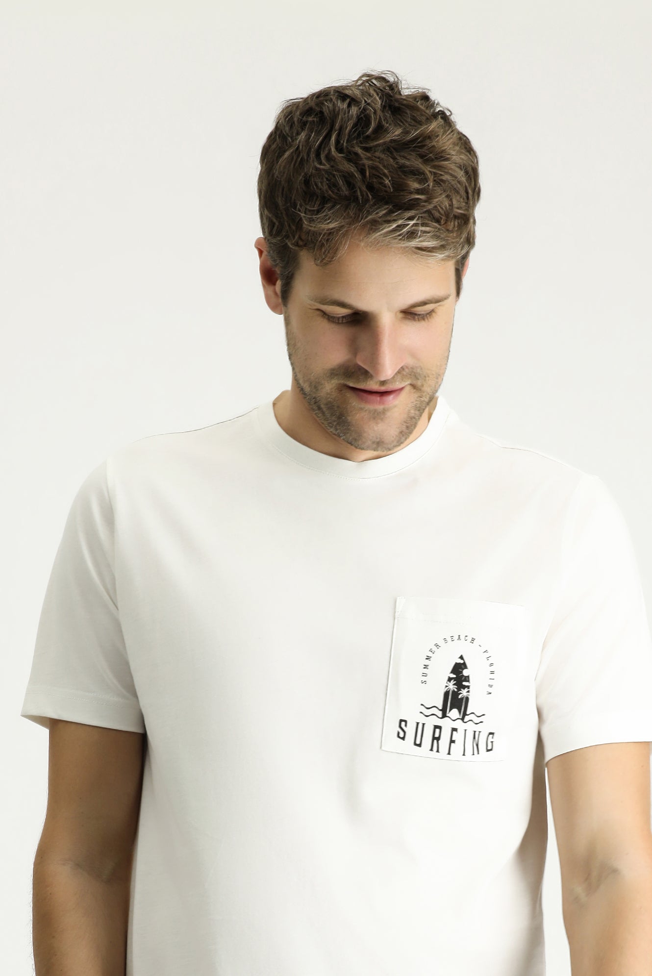 Ekru Bisiklet Yaka Regular Fit Baskılı Süprem Pamuk Tişört