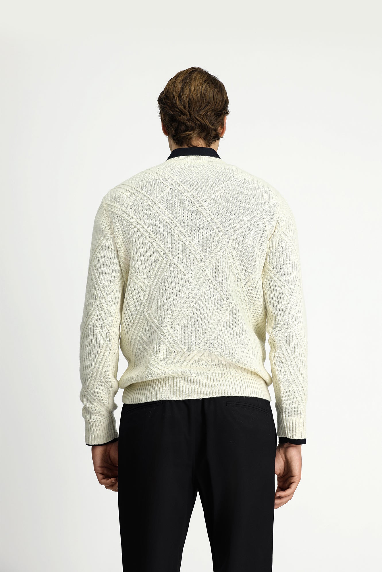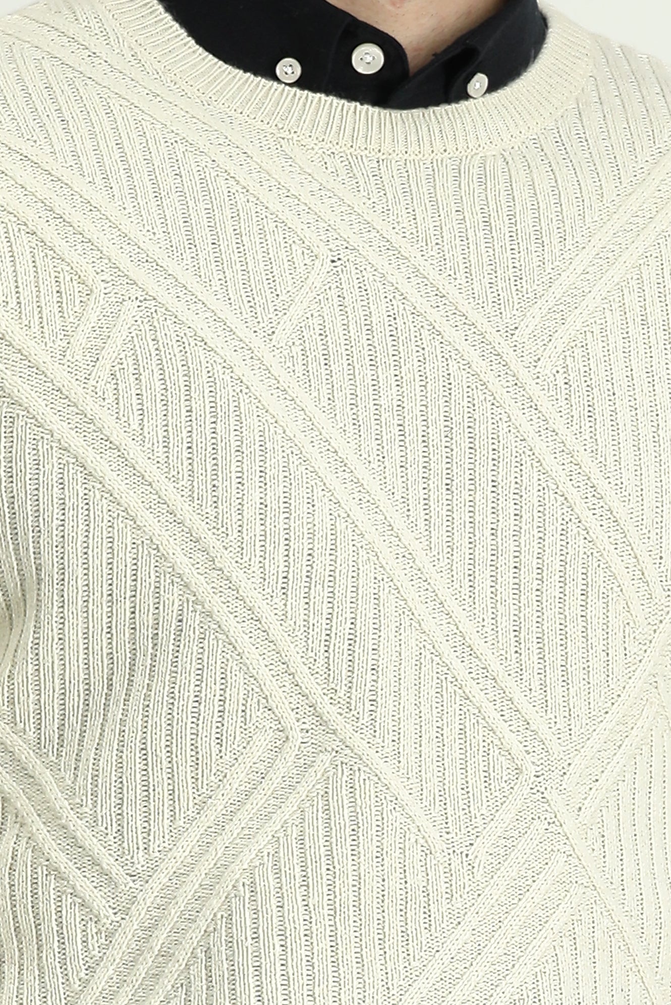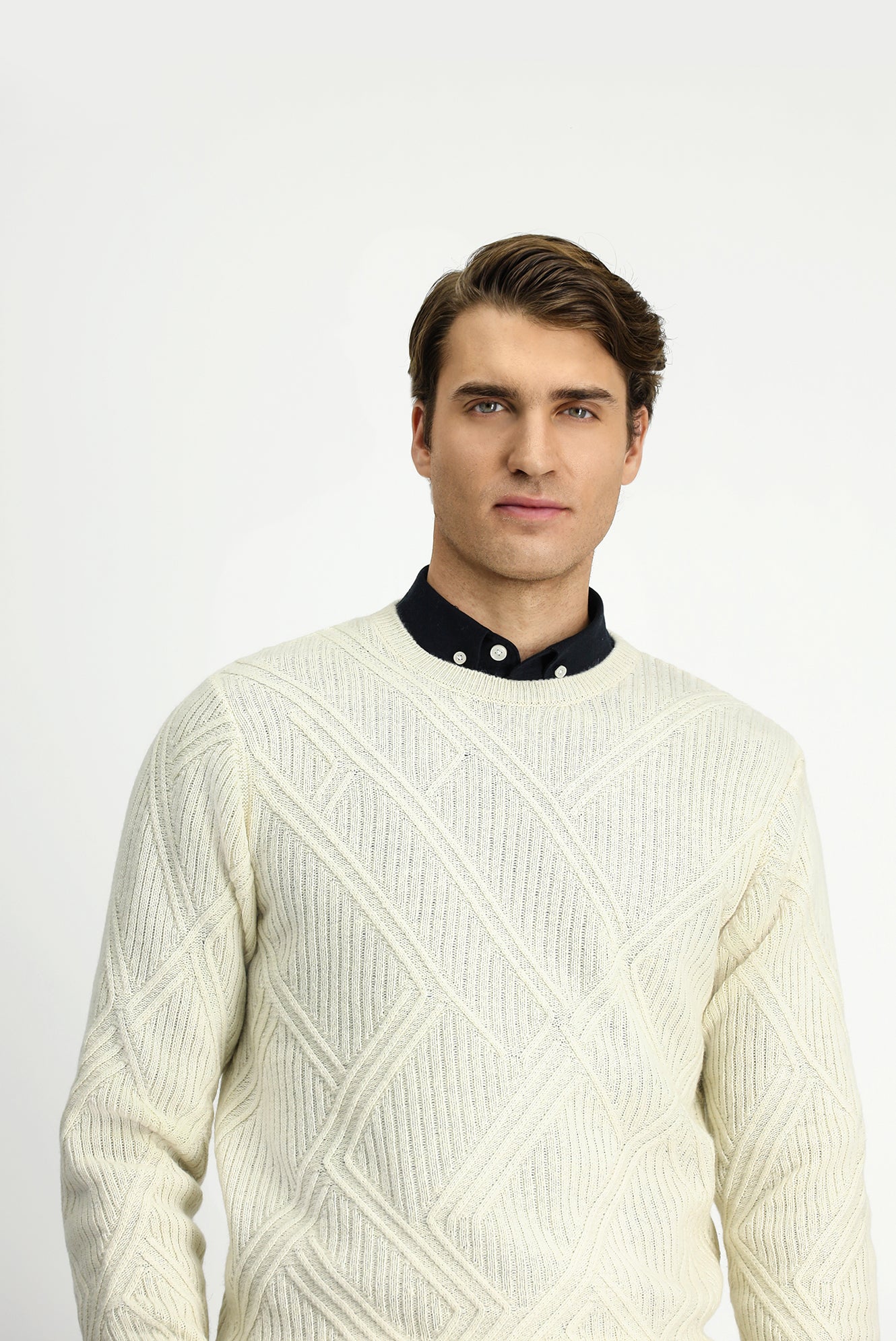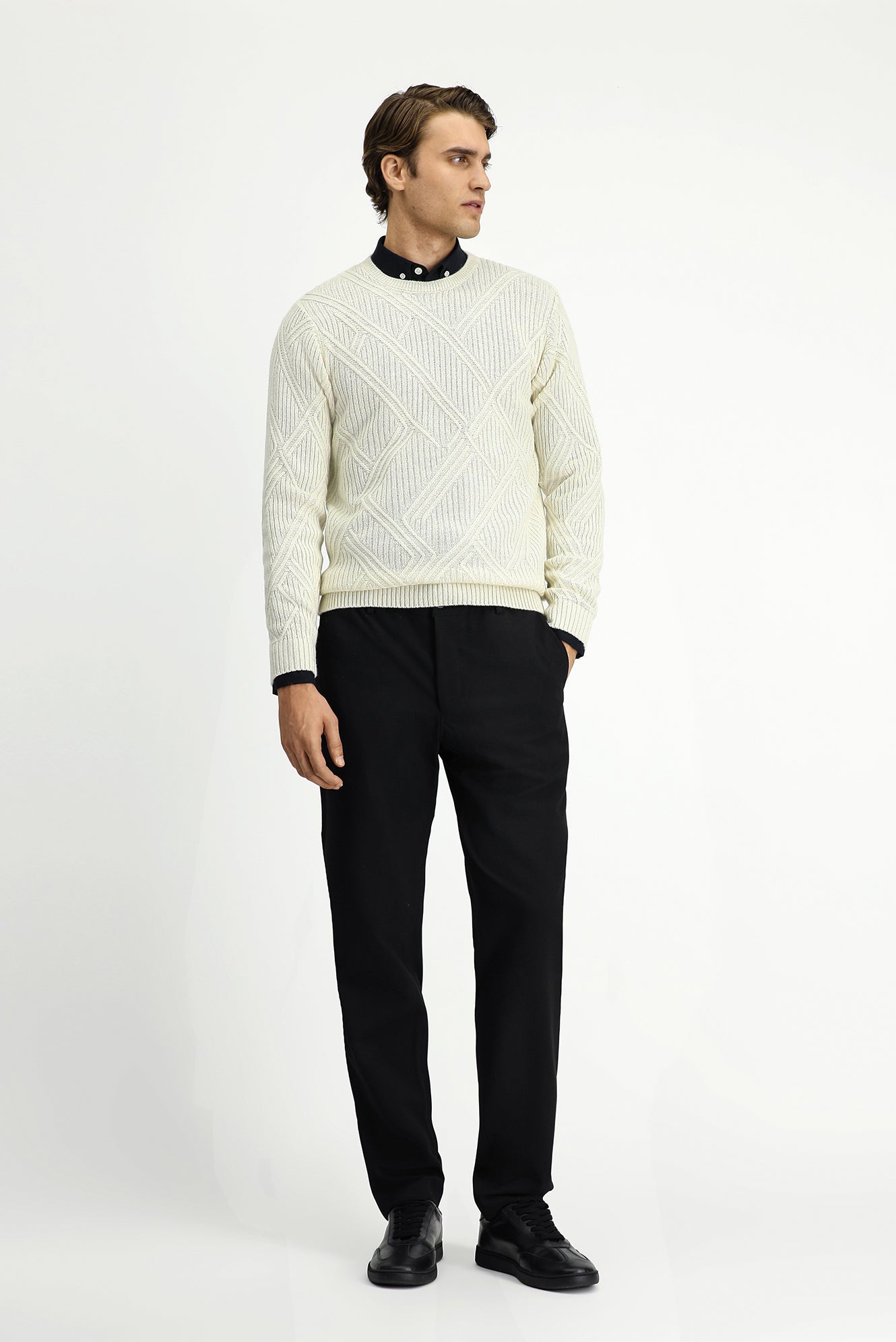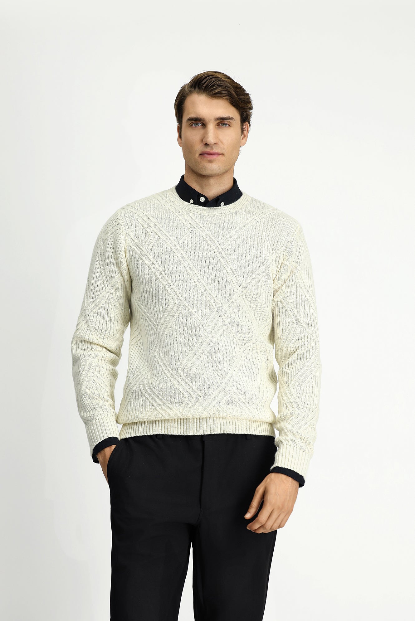 Ekru Bisiklet Yaka Slim Fit Dar Kesim Desenli Yünlü Triko Kazak