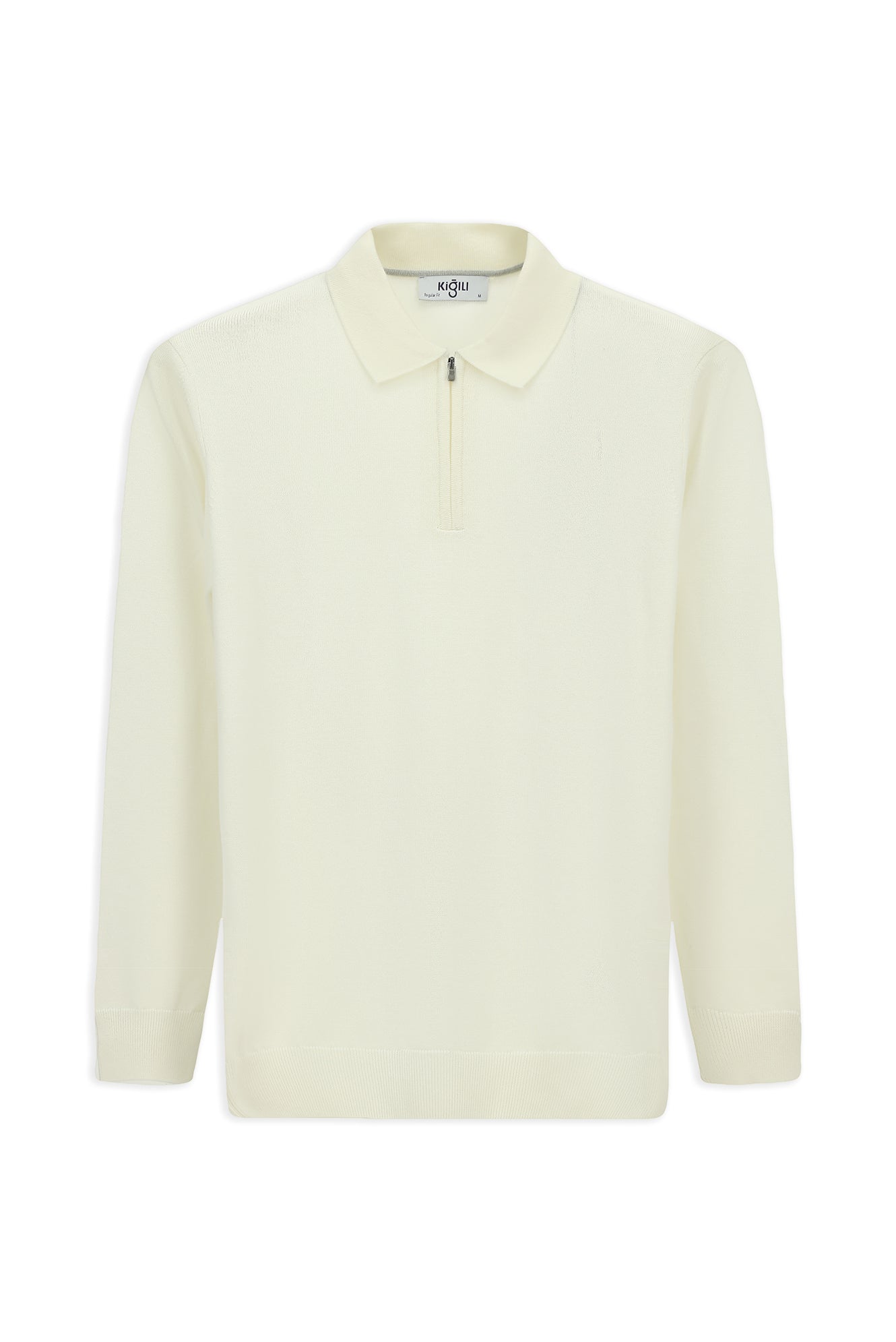 Ekru Polo Yaka Regular Fit Fermuarlı Pamuklu Örme Triko Kazak