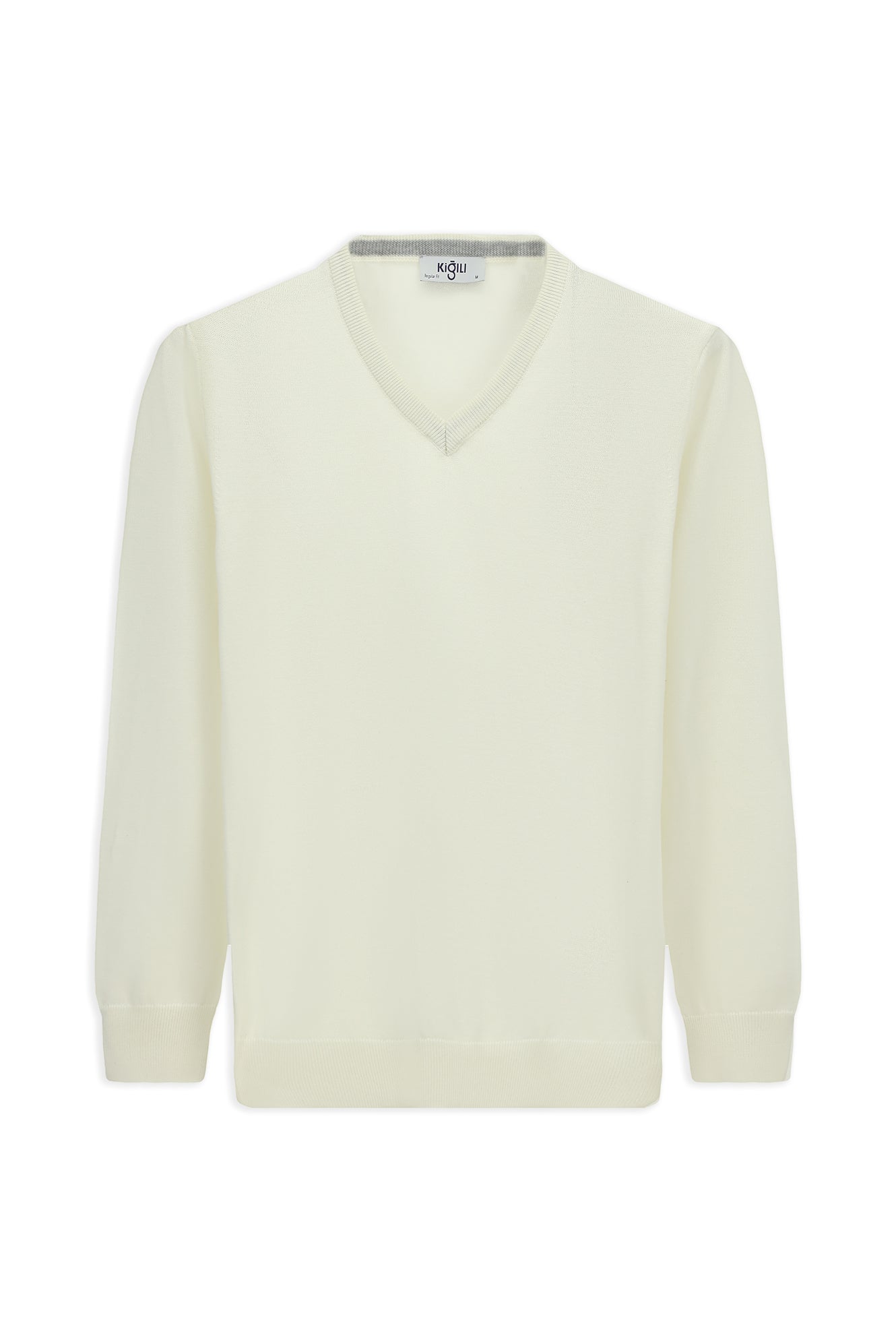 Ekru V Yaka Regular Fit Pamuklu Örme Triko Kazak
