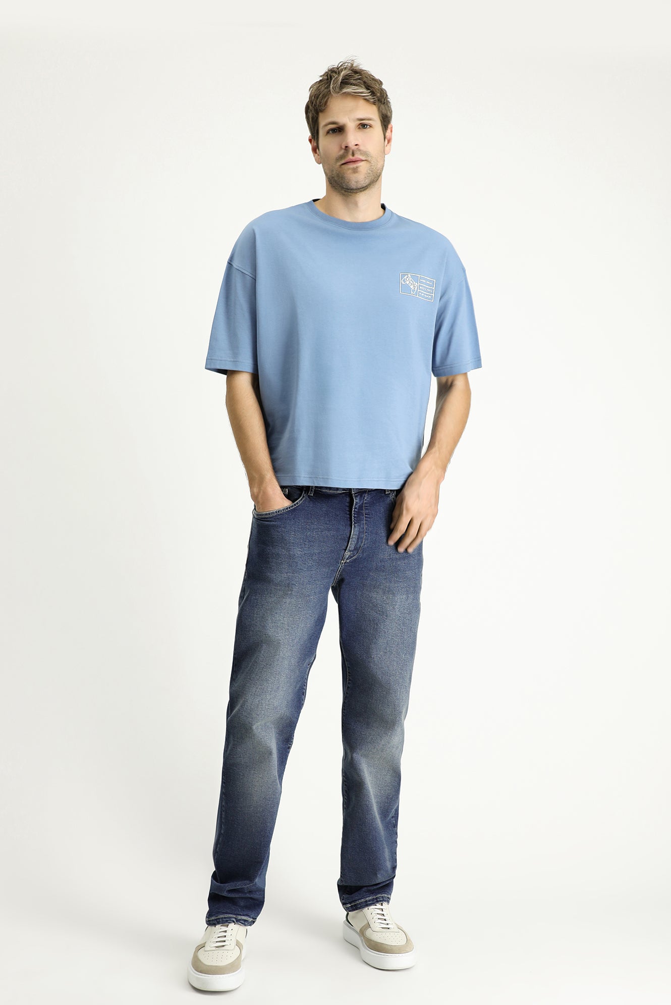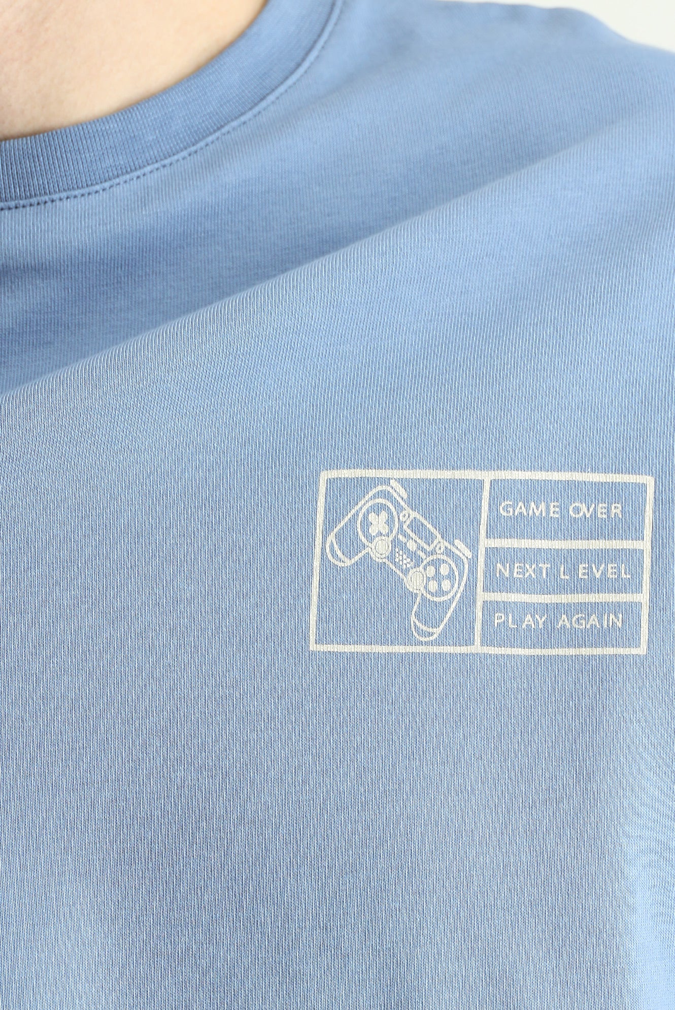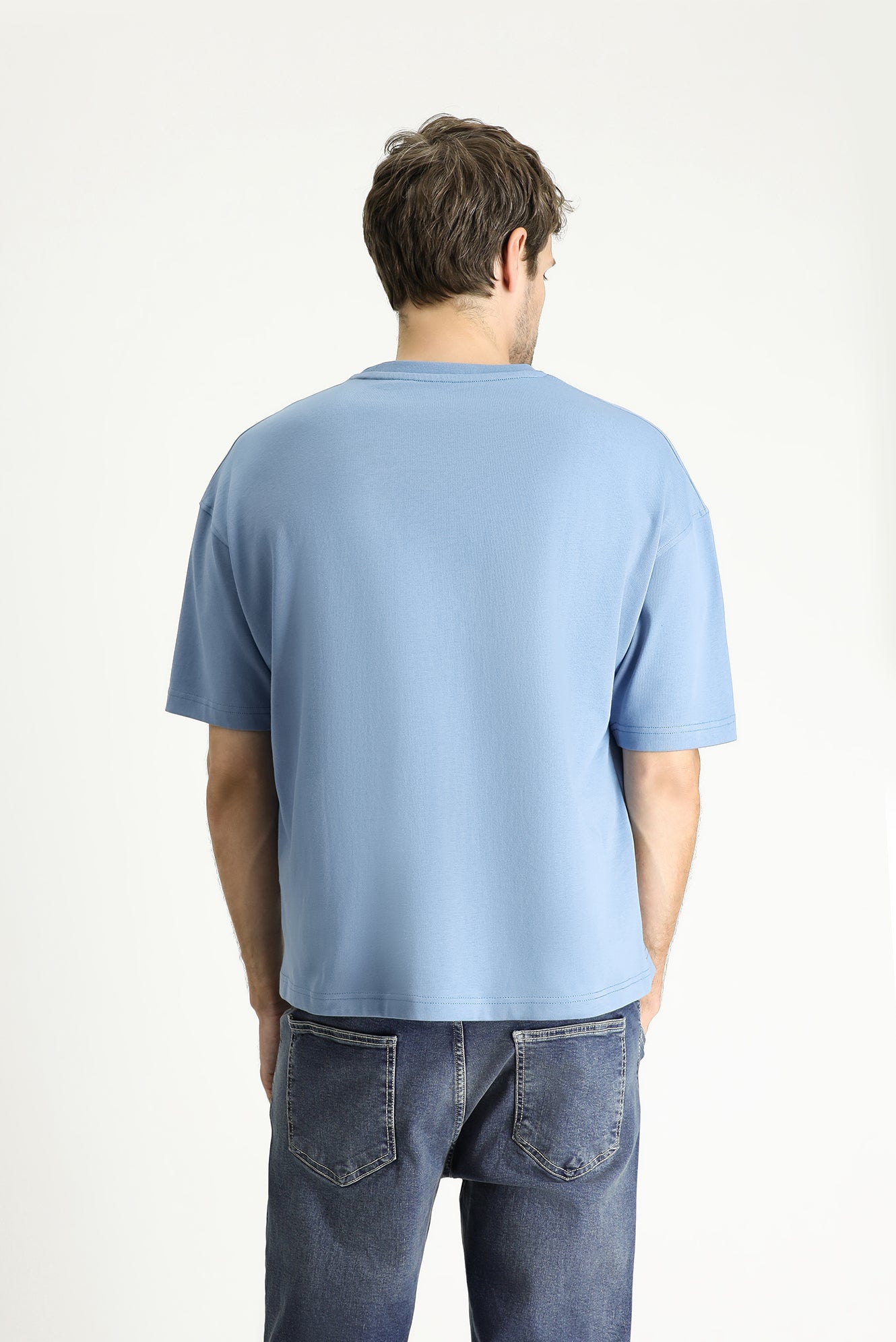 Havacı Mavi Bisiklet Yaka Oversize Baskılı Süprem Pamuk Tişört