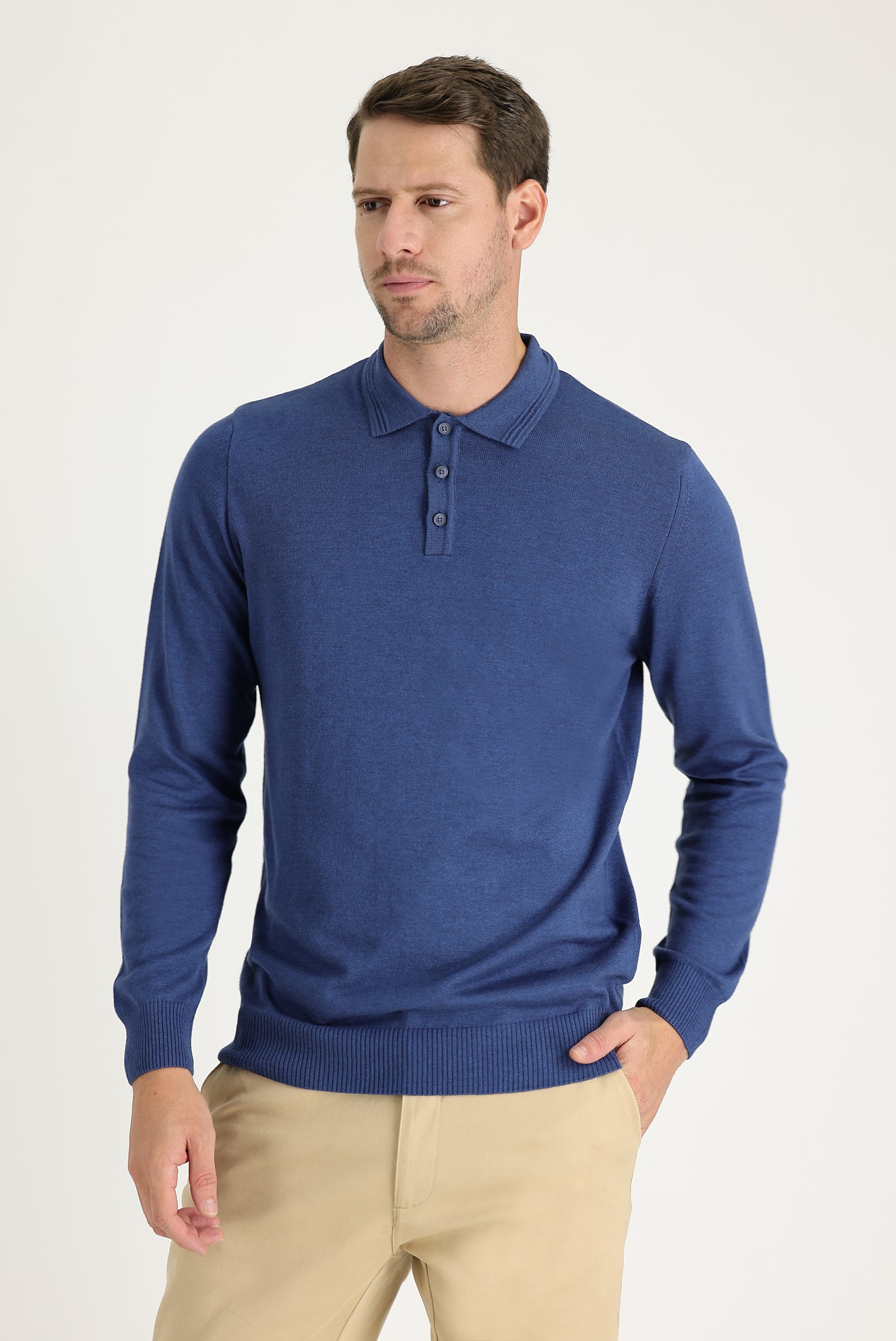 İndigo Melanj Polo Yaka Regular Fit Pamuklu Triko Kazak